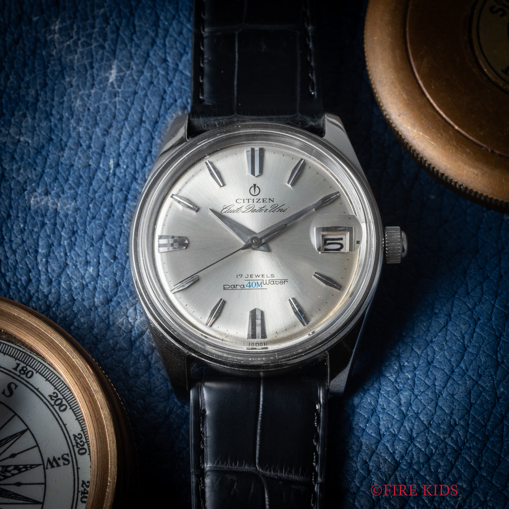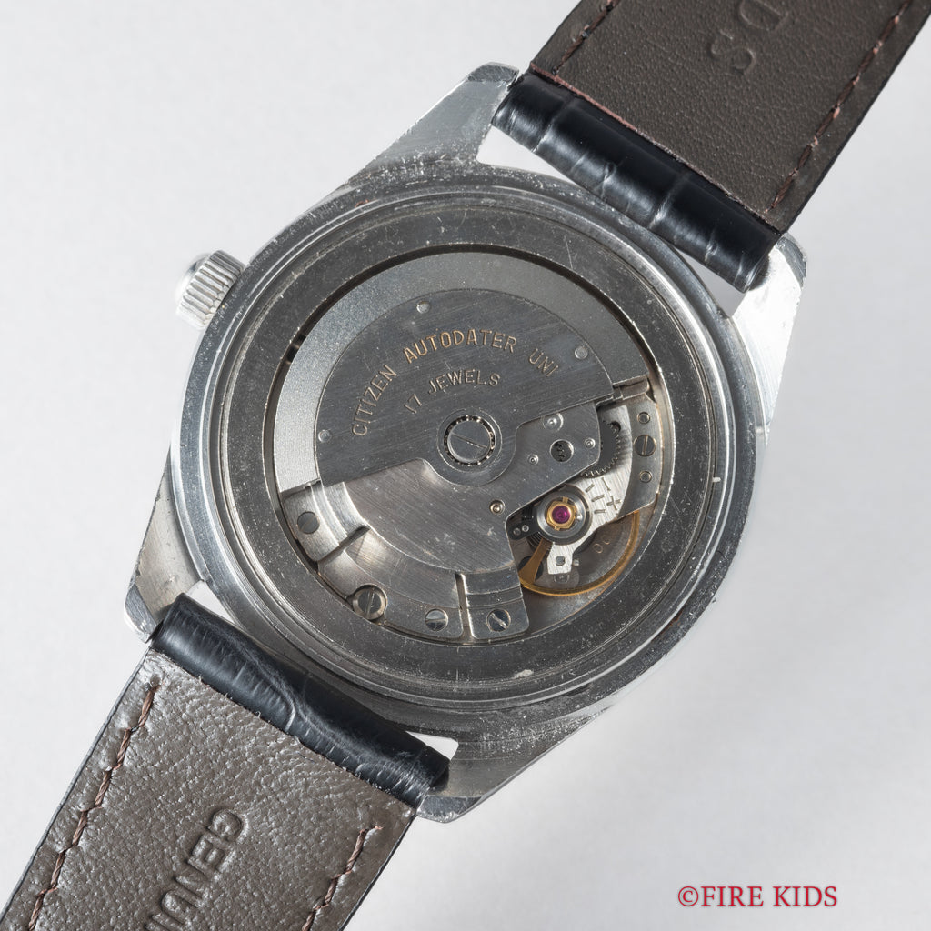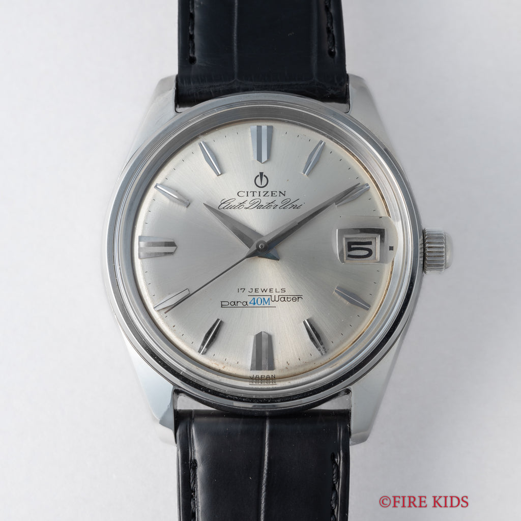 シチズン オートデーターユニ Ref.AU140801 自動巻き パラウォーターです。防水スナップケース通称パラウォーターです。厚みがあってどっしりとしていて良い感じです。三針、デイト付き、自動巻きと実用性にも優れています。楔型のインデックスと尖った針もカッコいいです。ファイアーキッズオリジナルのクロコダイル革ベルトを合わせています。