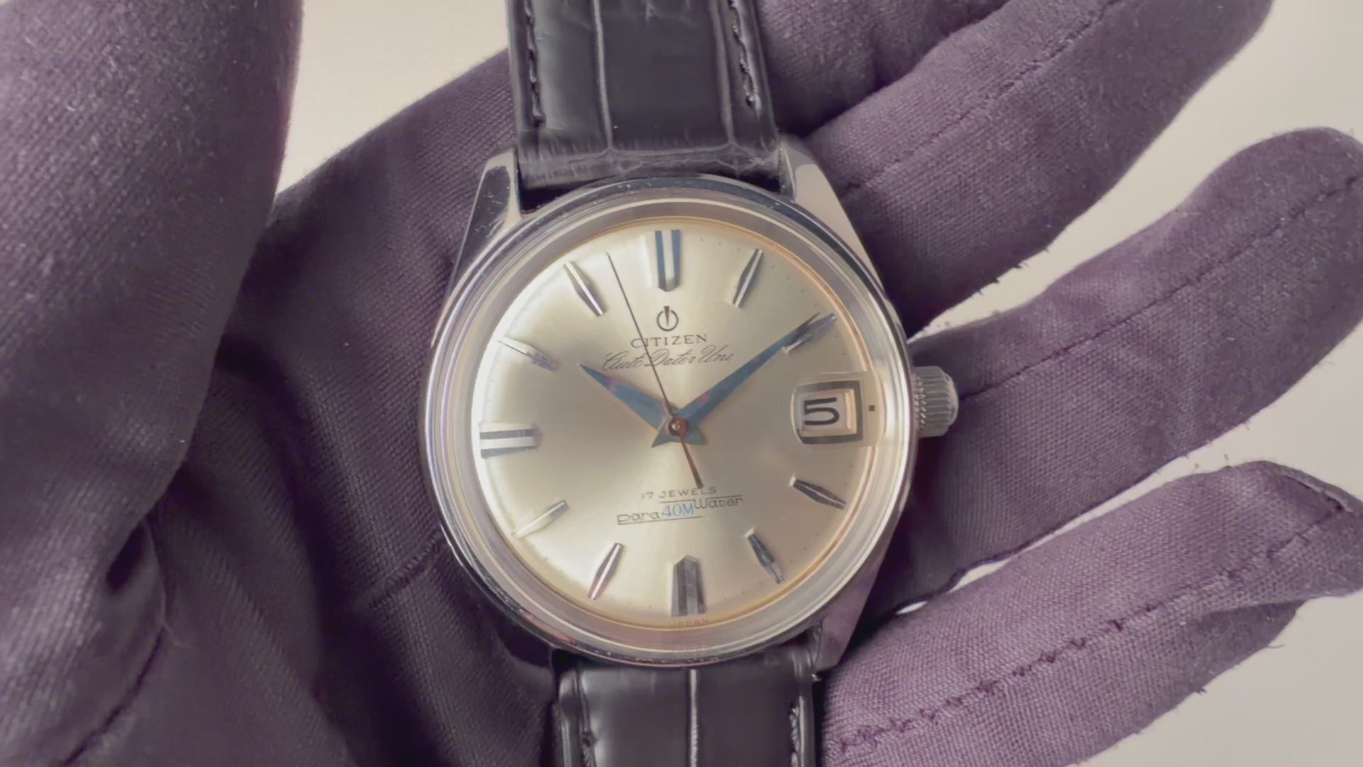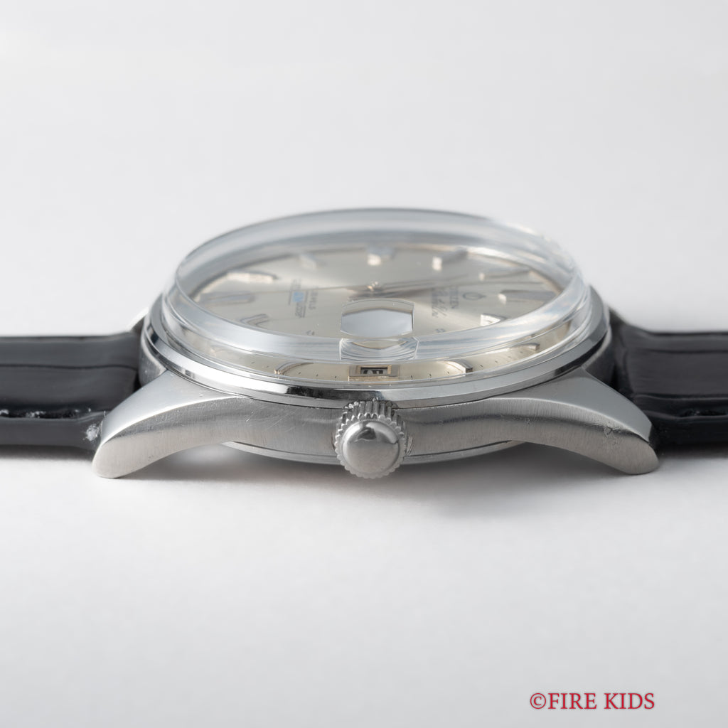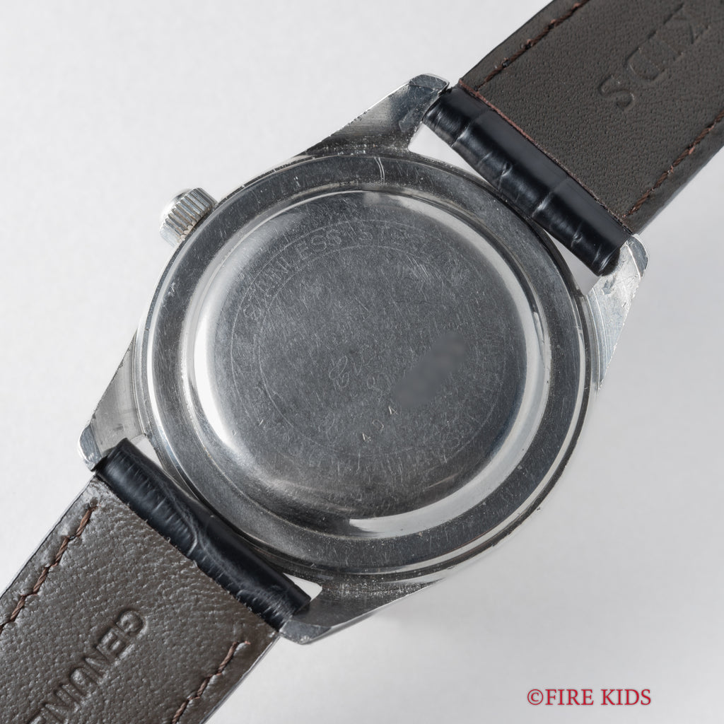 シチズン オートデーターユニ Ref.AU140801 自動巻き パラウォーターです。防水スナップケース通称パラウォーターです。厚みがあってどっしりとしていて良い感じです。三針、デイト付き、自動巻きと実用性にも優れています。楔型のインデックスと尖った針もカッコいいです。ファイアーキッズオリジナルのクロコダイル革ベルトを合わせています。