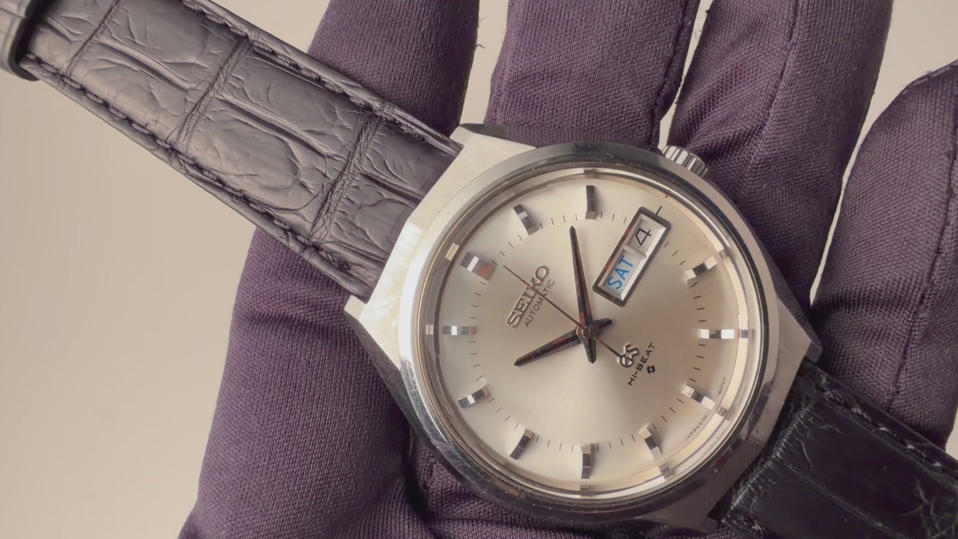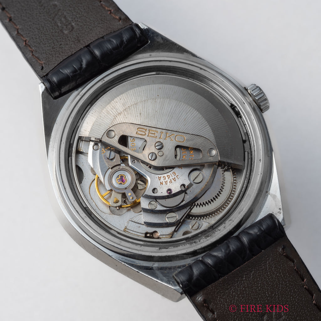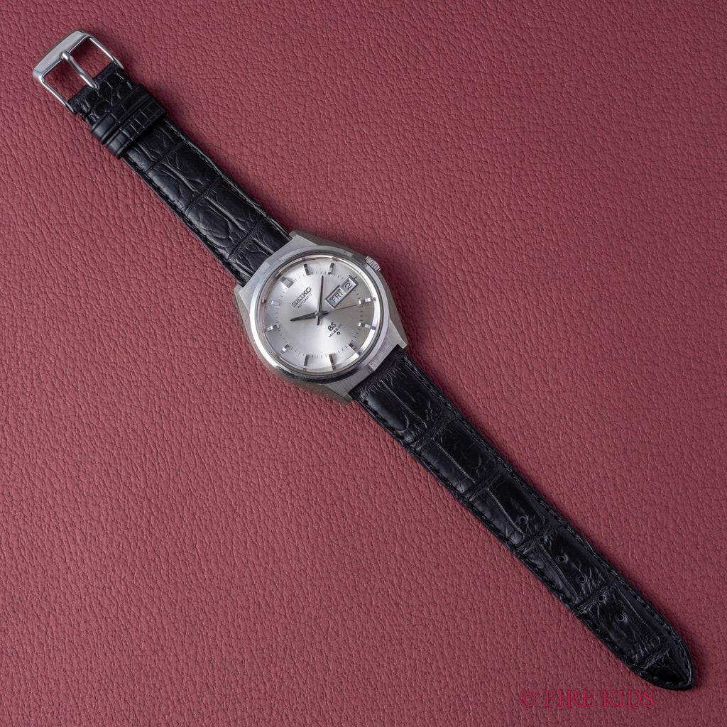 1972年製のグランドセイコー Ref.6146-8050 自動巻きモデルです。自動巻きの10振動ハイビートムーブを搭載し3時位置にデイデイト(日付曜日)付き、スクリューバック仕様と、視認性、防水性が高く実用性に優れています。ケースは小傷はございますが大きなダメージはございません。裏ブタのメダリオンは多少腐食の跡が見られます。手巻きや針回しの操作はスムーズです。ベルトはファイアーキッズオリジナルのクロコダイル革ベルトが取り付けてあります。