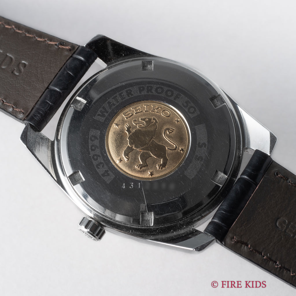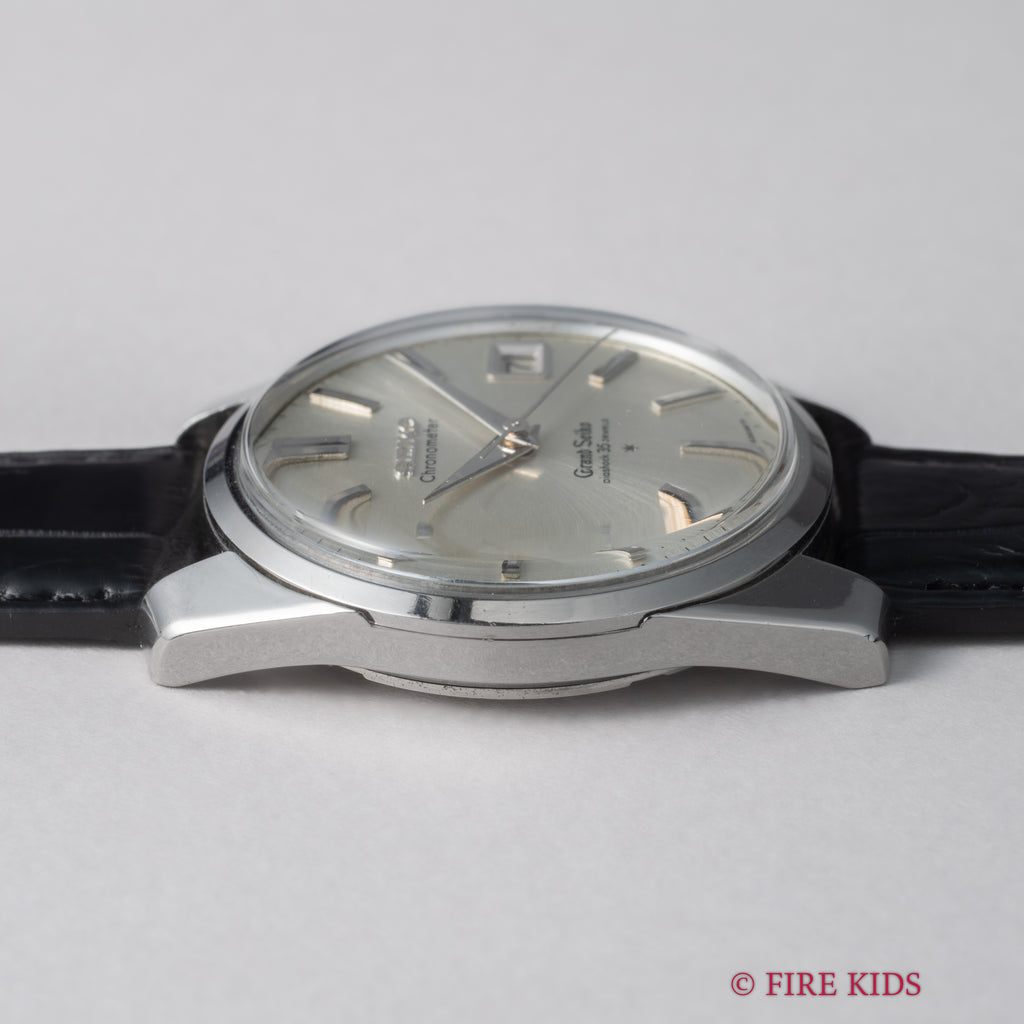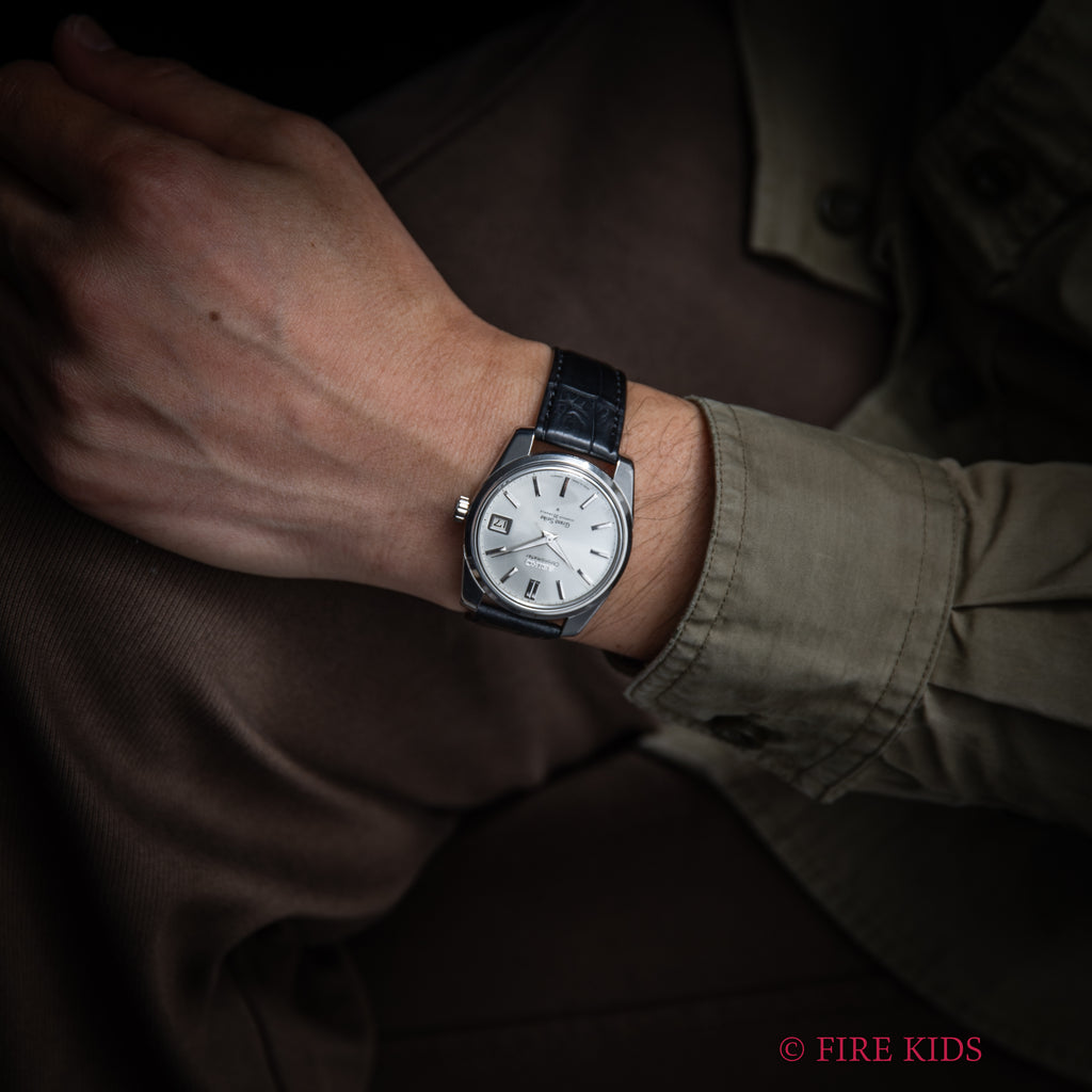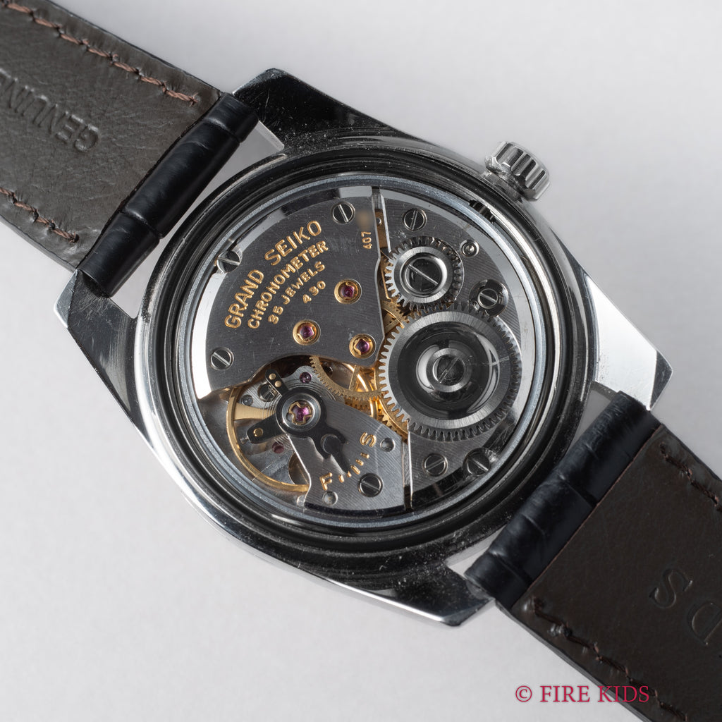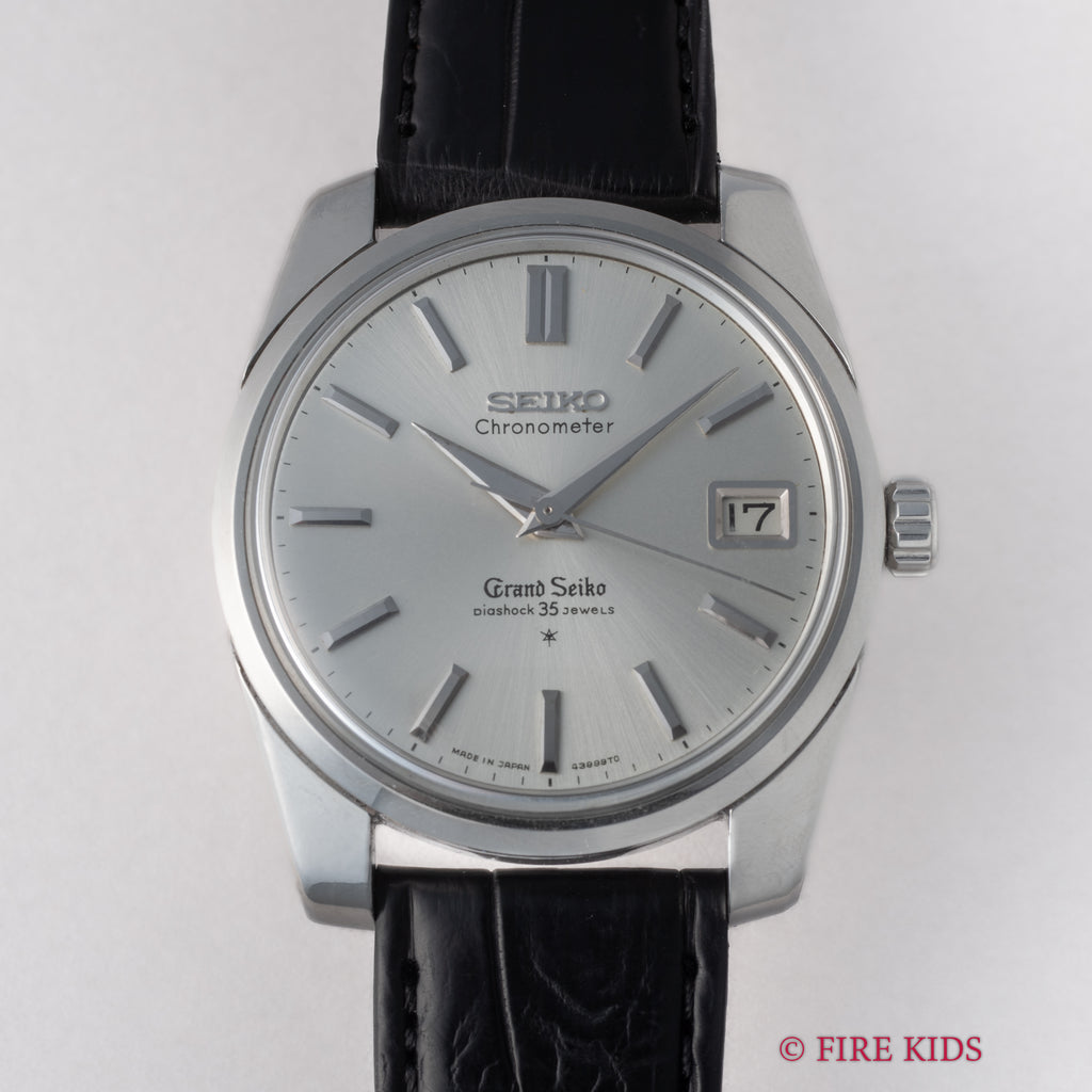 グランドセイコー セルフデーター 1964年製 Ref.43999 GS2nd 初期 ライオンメダル ロービート手巻です。グランドセイコーの第2世代セルフデーター前期型になります。ステンレスケースにスクリューバック、日付早送り機能の搭載など実用性がアップしたモデルです。文字盤、ケース共に状態の良い個体です。ムーブメントは手巻き35石のCal.430を搭載。手巻きや針回しの操作はスムースです。ベルトはファイアーキッズオリジナルのクロコダイル革ベルトが取り付けられています。