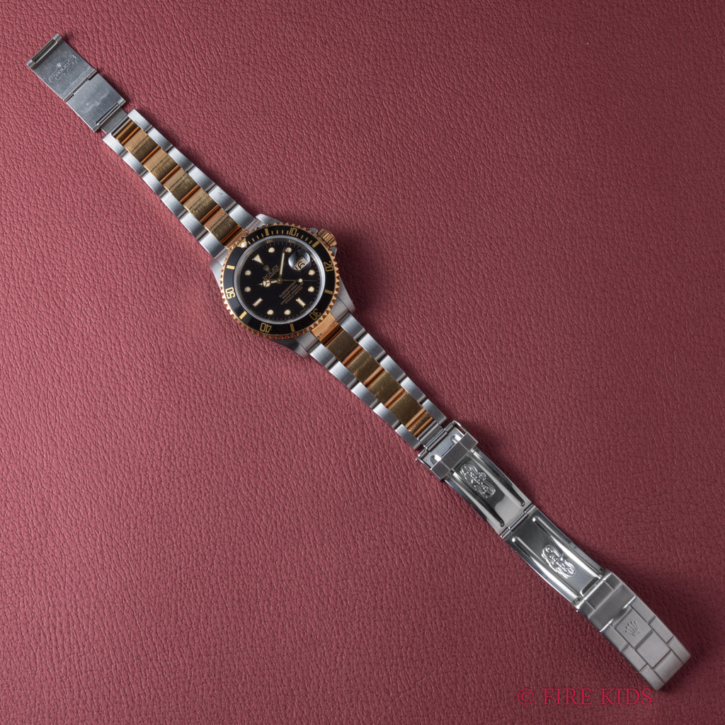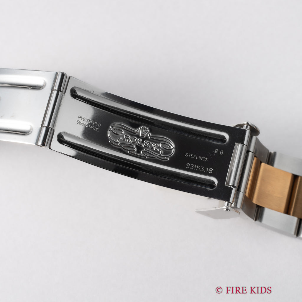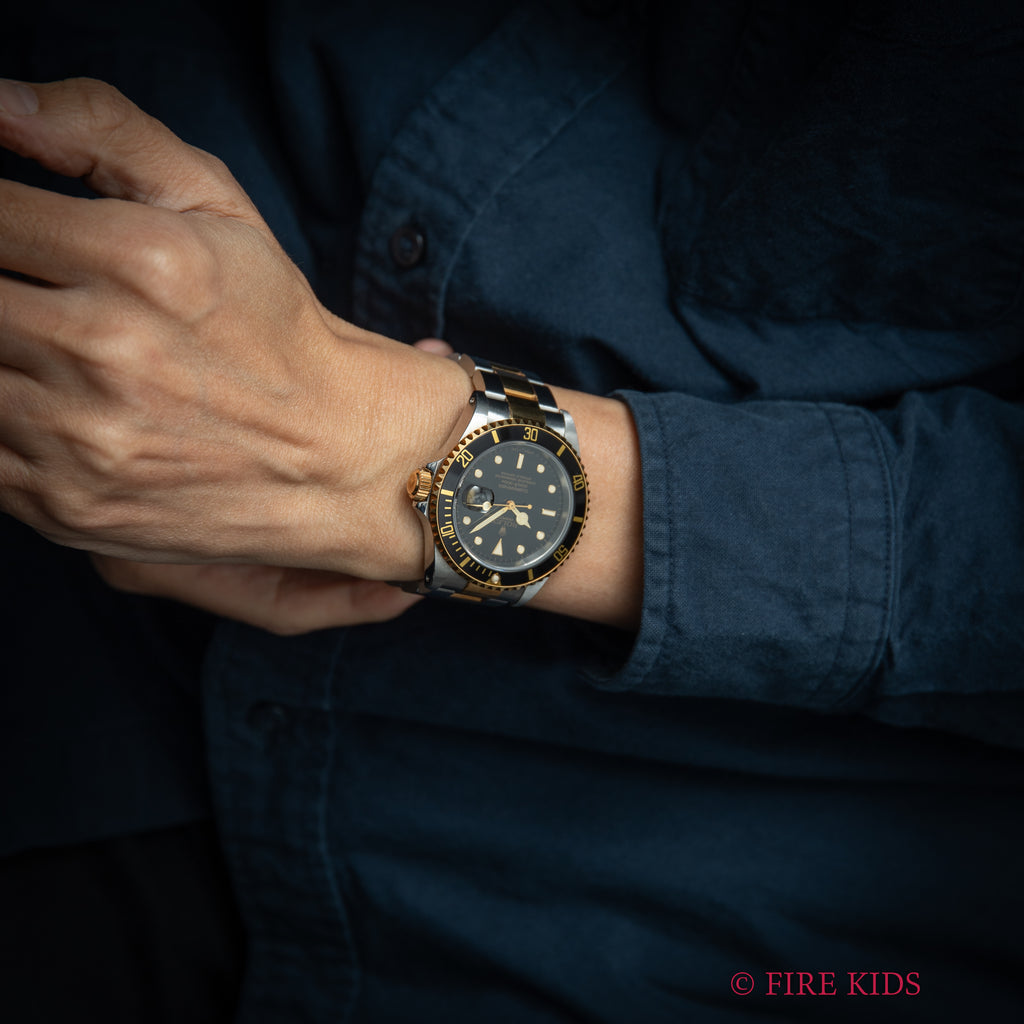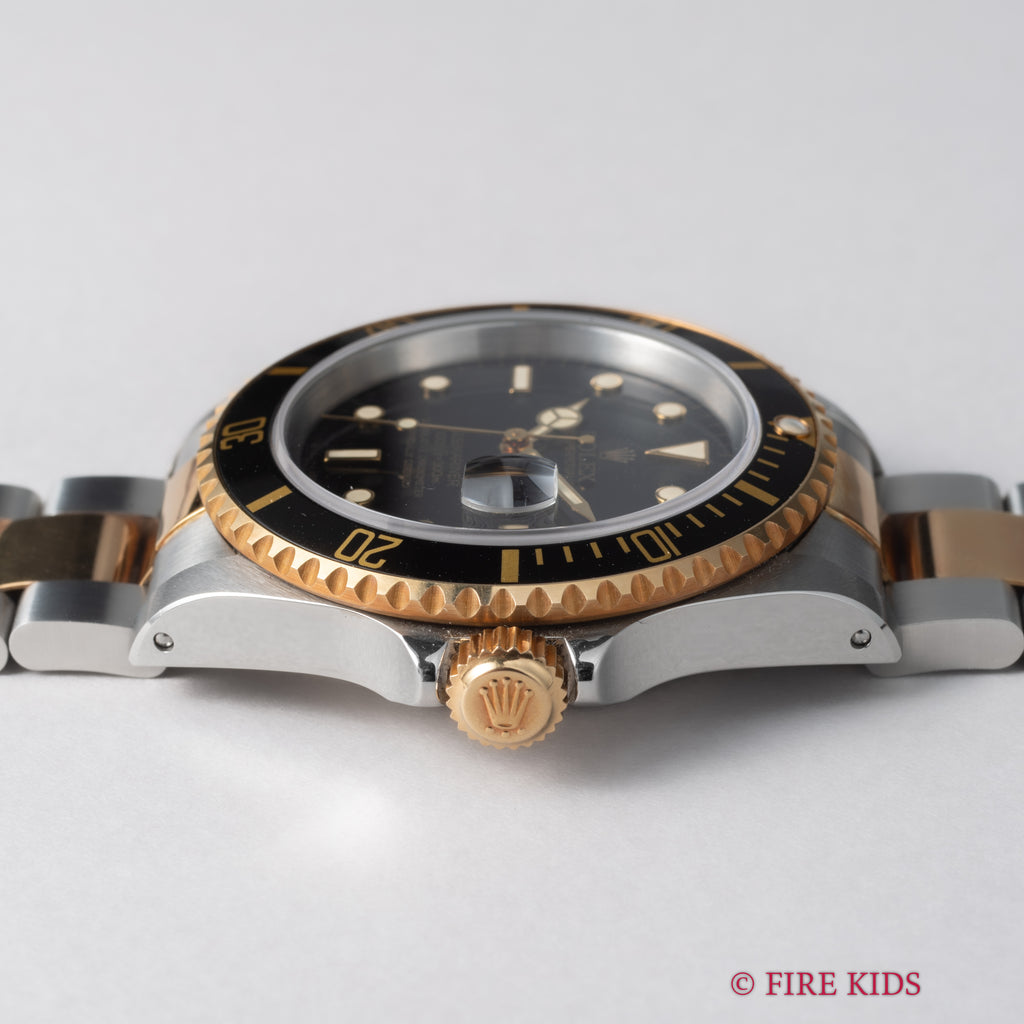 1991年製のロレックス サブマリーナー 黒コンビモデルです。サブマリーナーの数あるバリエーションの中でも黒と金のコンビのケースで大人な雰囲気の時計です。ムーブメントは自動巻きのCal.3135を搭載。ケースは小傷が見られますが大きなダメージはありません。手巻きや針回し、ねじ込みの操作はスムースです。ブレスは純正のコンビブレスが取り付けられています。