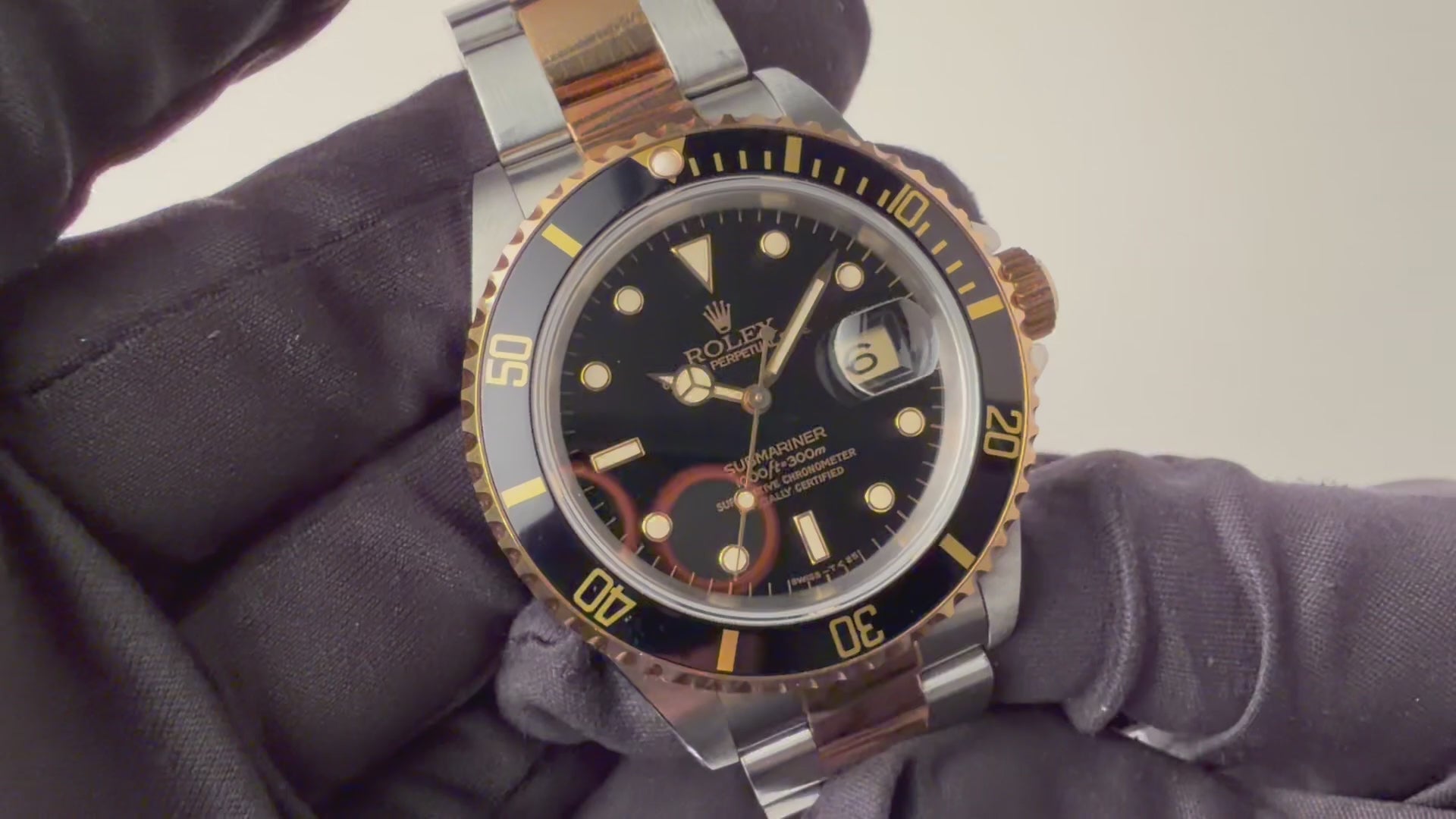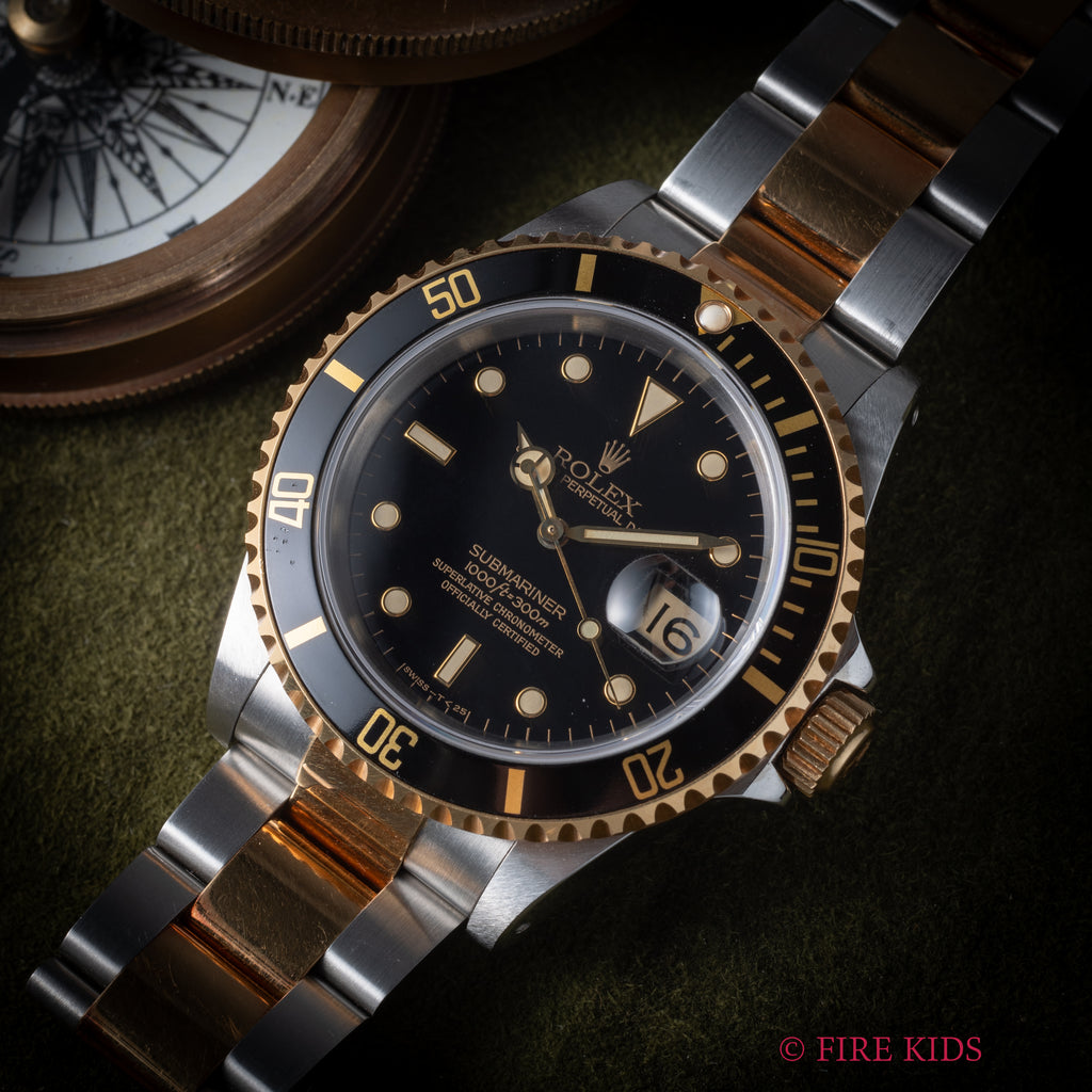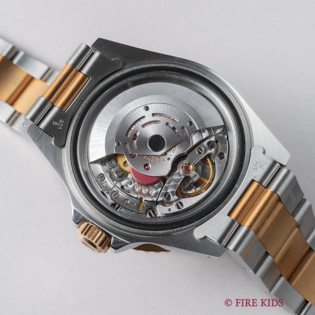 1991年製のロレックス サブマリーナー 黒コンビモデルです。サブマリーナーの数あるバリエーションの中でも黒と金のコンビのケースで大人な雰囲気の時計です。ムーブメントは自動巻きのCal.3135を搭載。ケースは小傷が見られますが大きなダメージはありません。手巻きや針回し、ねじ込みの操作はスムースです。ブレスは純正のコンビブレスが取り付けられています。