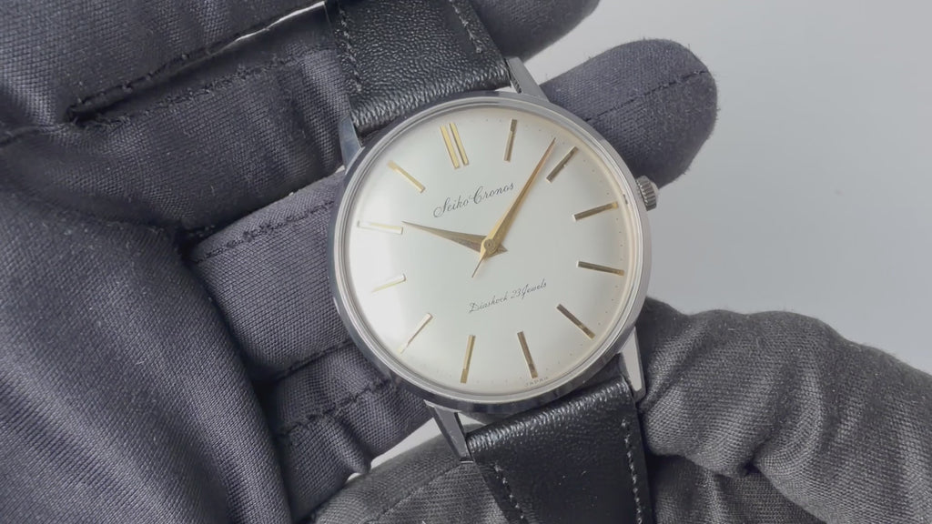 セイコー クロノス Ref.J15009 手巻き 1964年製です。セイコーの名機クロノスです。傘型の文字盤、風防、スラっと伸びた長いインデックスにドーフィンハンドなどヴィンテージの魅力満載です。文字盤、ケースも綺麗です。社外の革ベルトを合わせています。
