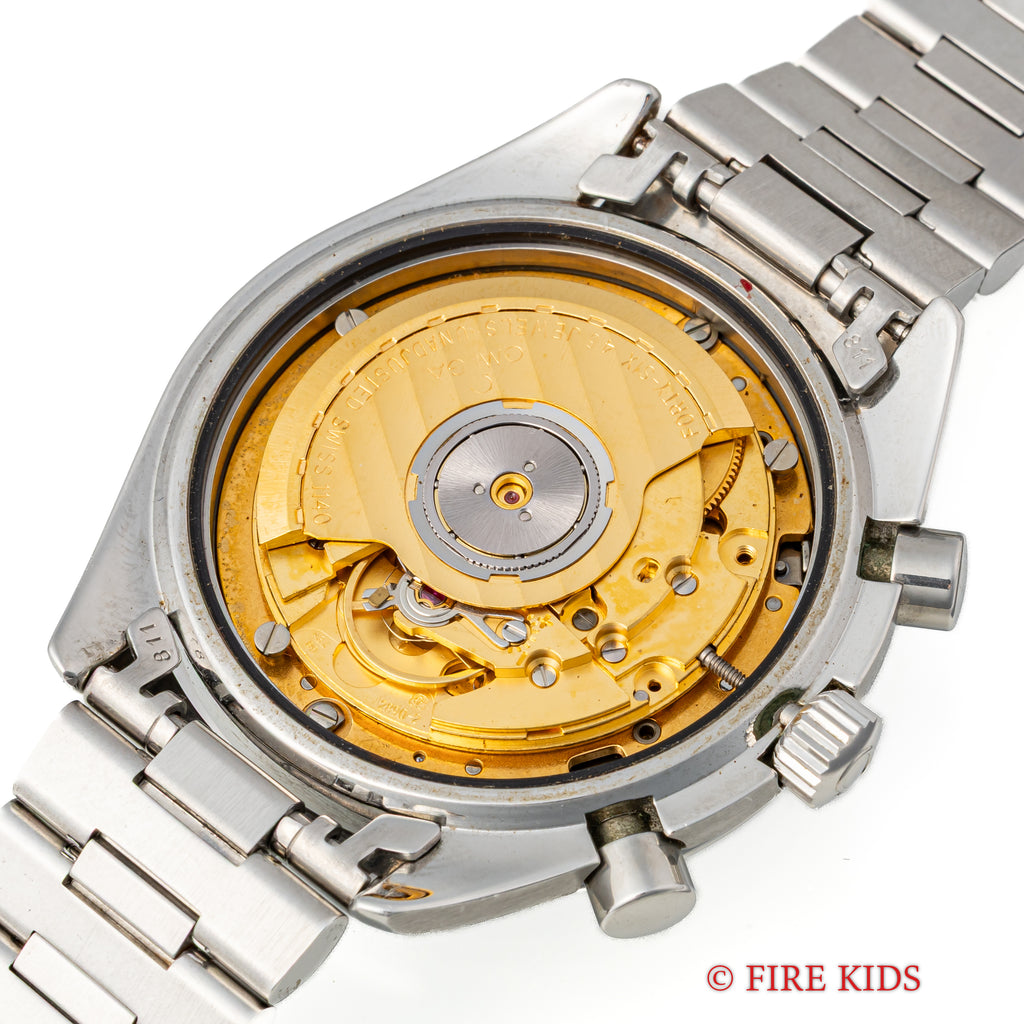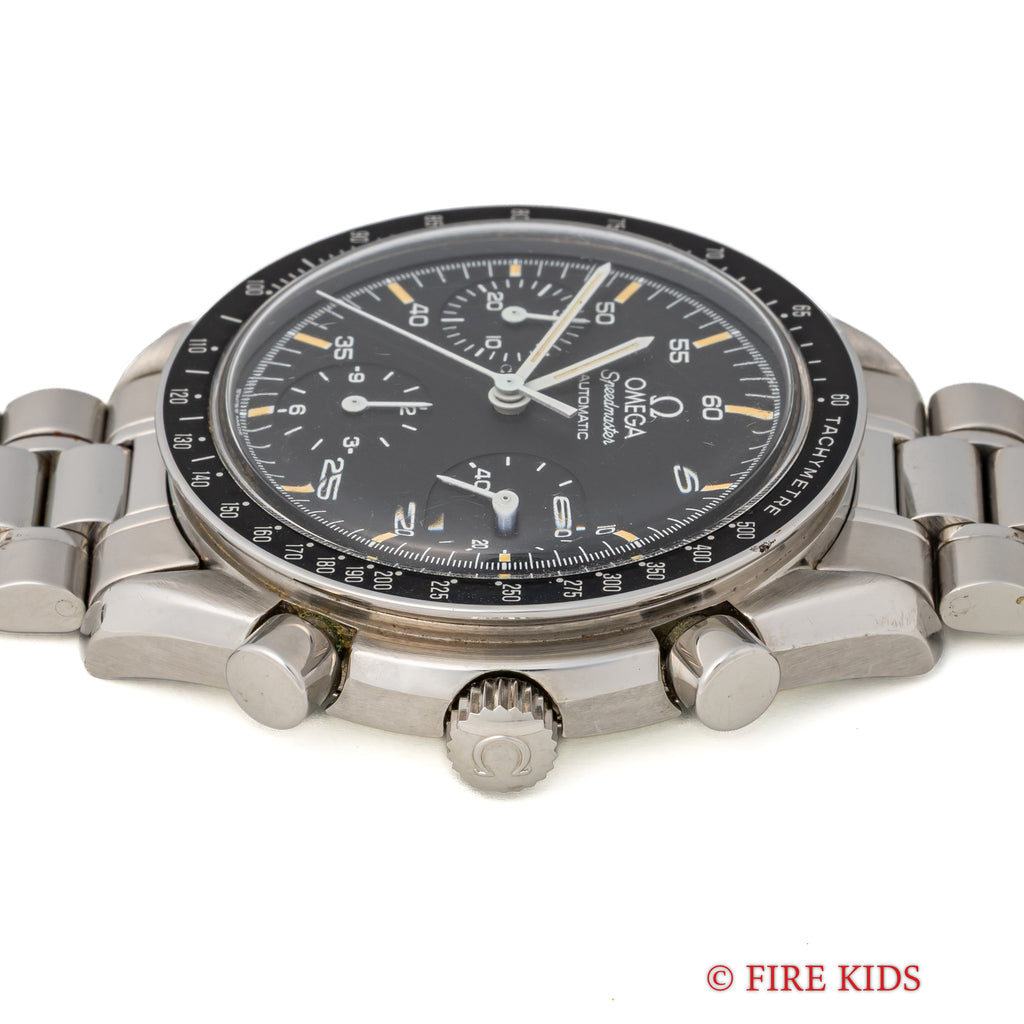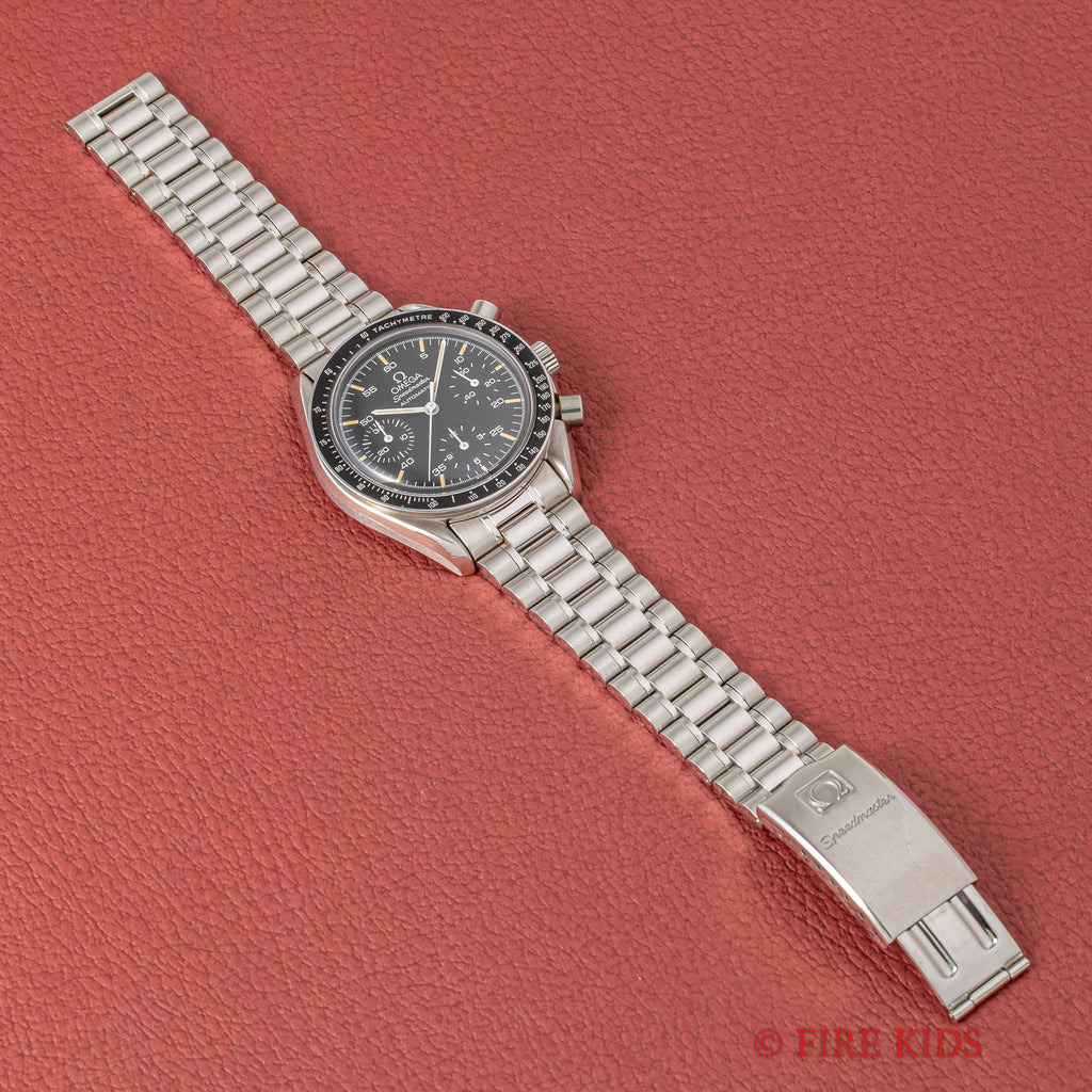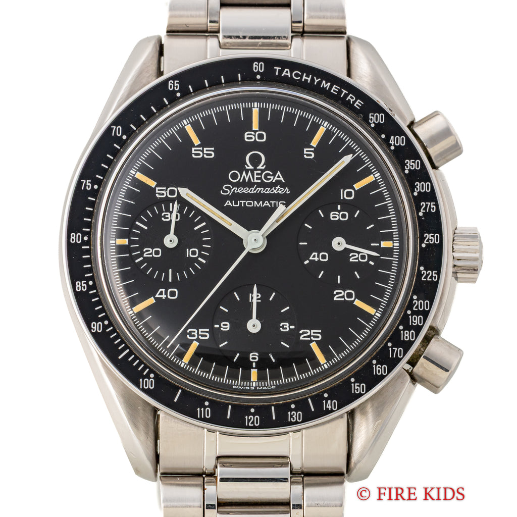 1989年製のオメガスピードマスターオートマティック Ref.3510.50です。 1980年代に登場したシリーズでプロフェッショナル(約40mm幅)は大きすぎると感じる方におすすめの幅38mmのケースが特徴で使いやすいモデルです。ケースは小傷が見られますが大きなダメージがなく良い状態です。 マットブラックの文字盤と夜光のヤケのコントラストが良好な状態です。 ムーブメントはCal.1140を搭載しています。 手巻きや針回し、クロノグラフの操作はスムーズです。裏蓋には保護シールが残っています。ベルトは純正ステンレスブレス(1469/811)が取り付けられています。