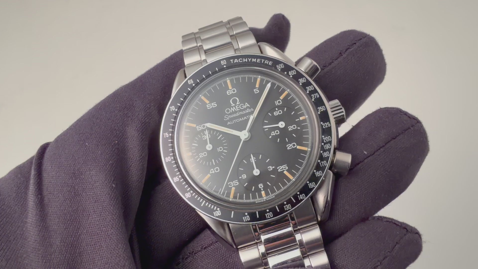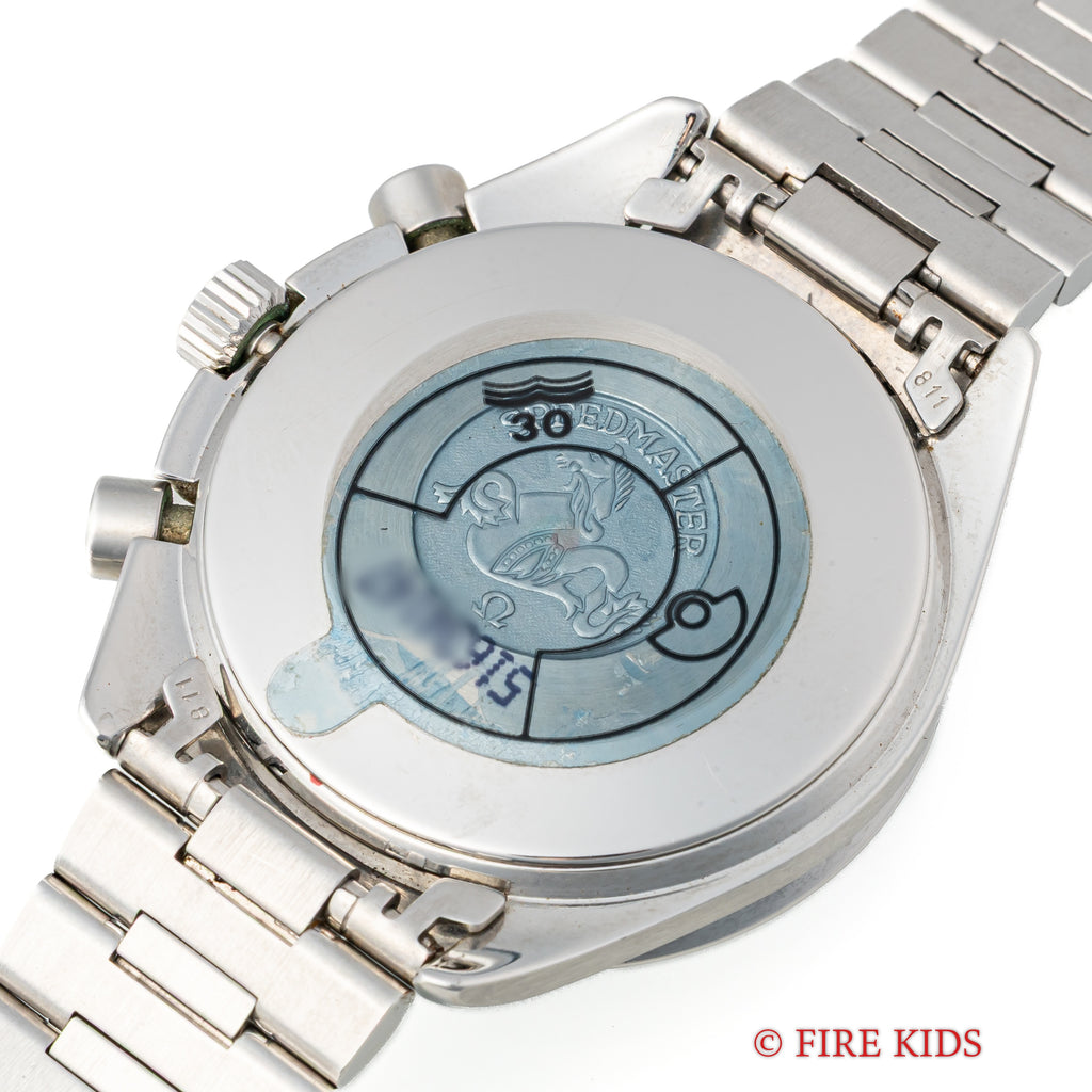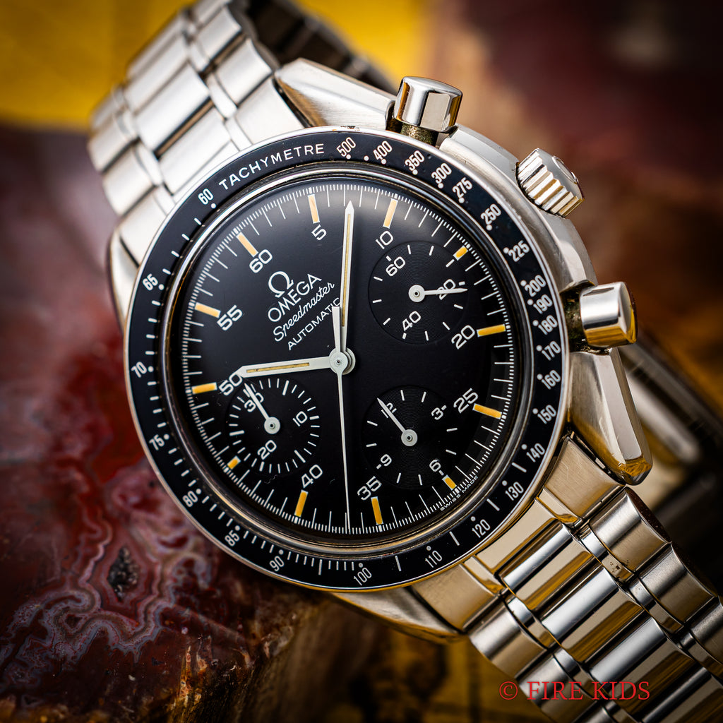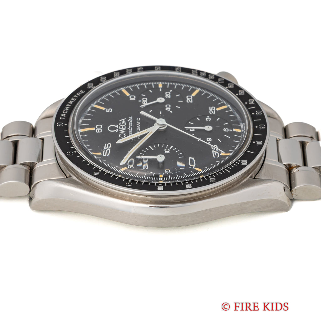 1989年製のオメガスピードマスターオートマティック Ref.3510.50です。 1980年代に登場したシリーズでプロフェッショナル(約40mm幅)は大きすぎると感じる方におすすめの幅38mmのケースが特徴で使いやすいモデルです。ケースは小傷が見られますが大きなダメージがなく良い状態です。 マットブラックの文字盤と夜光のヤケのコントラストが良好な状態です。 ムーブメントはCal.1140を搭載しています。 手巻きや針回し、クロノグラフの操作はスムーズです。裏蓋には保護シールが残っています。ベルトは純正ステンレスブレス(1469/811)が取り付けられています。