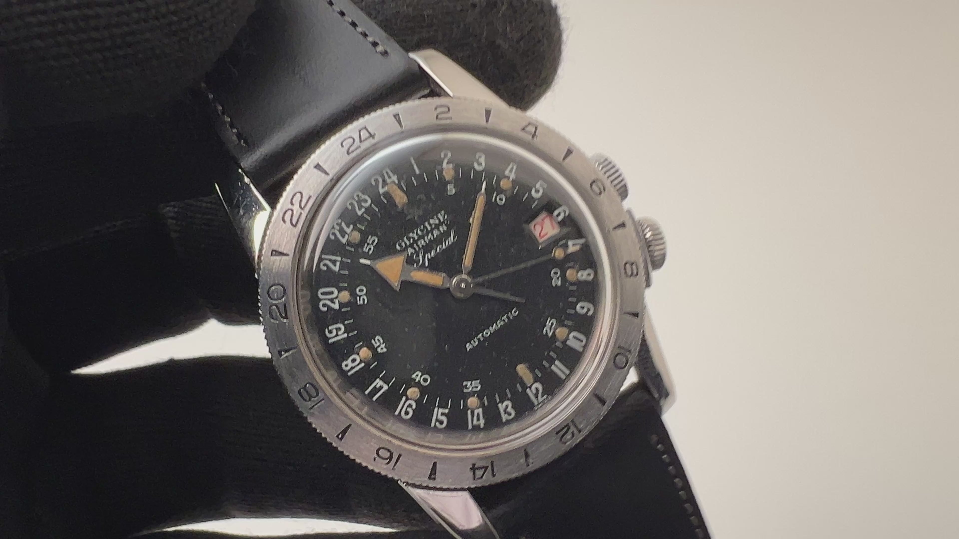 グリシン エアマン スペシャル 24時間時計 1960年代製 秒針規制装置 パイロットウォッチの入荷になります。ベトナム戦争ではアメリカ軍の多くのパイロットに愛用されていた事で知られ、軍施設内の購買でも販売されていました。マットブラックの文字盤は24時間表記になっており、昼夜を問わず作戦を遂行する軍関係者に重宝されていた理由の一つになっています。リューズを引くと0秒の位置で秒針が止まるセコンドセッティング機能が搭載されていますが、24時位置に小さな穴が開いており、針金が飛び出して秒針の動きを止める独特な仕組みになっています。文字盤には気になるダメージはなく、オリジナルの夜光塗料が維持されています。ケースは小傷はありますが、磨きを感じないシャープな状態です。ムーブメントはCal.1700/01を搭載、巻き上げや針回しはスムーズです。ベルトはファイアーキッズオリジナル、イタリアンレザーのブッテーロ(裏面ラバー)が取り付けられています。こちらの時計は分解掃除済みです。