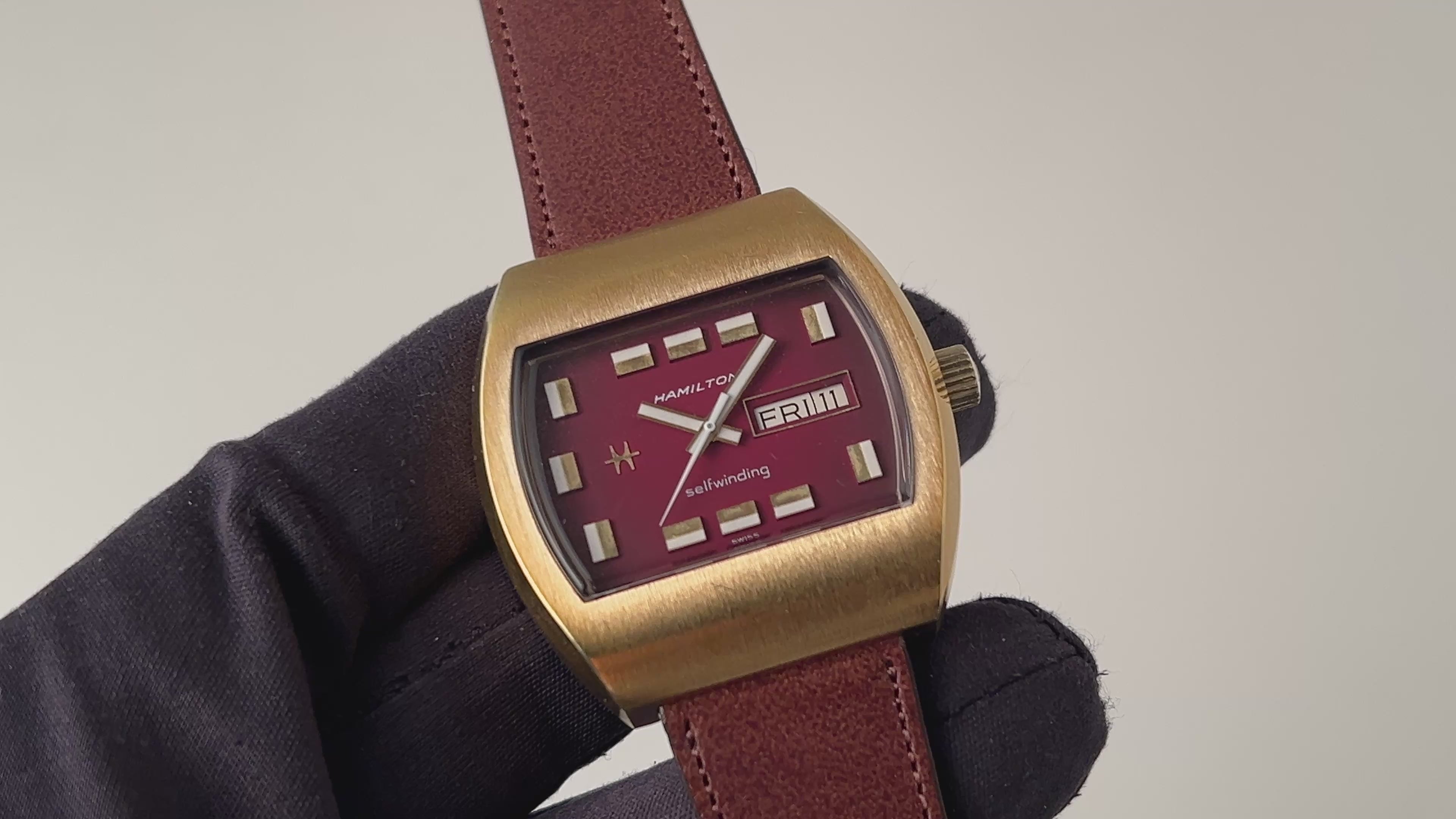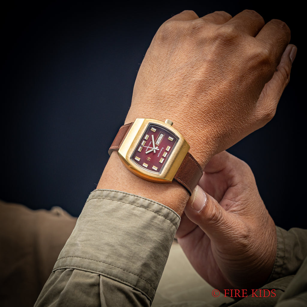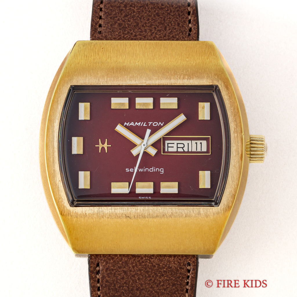 ハミルトン TVスクリーン 1970年代製 レッドグラデーションダイヤル デイデイト自動巻の入荷になります。近未来的なデザインのケースにグラデーションダイヤルがインパクトのある1本です。立体的なインデックスの並びもこせいてきになっています。ケースは金張りで小傷は見られますが大きなダメージはありません。手巻きや針回しの操作はスムースです。ベルトはファイアーキッズオリジナル革ベルト、イタリアンレザーのブッテーロ(裏面ラバー)が取り付けられています。純正のブレスはメッキが剥がれている為おまけでお考え下さい。こちらの時計は分解掃除済みです。