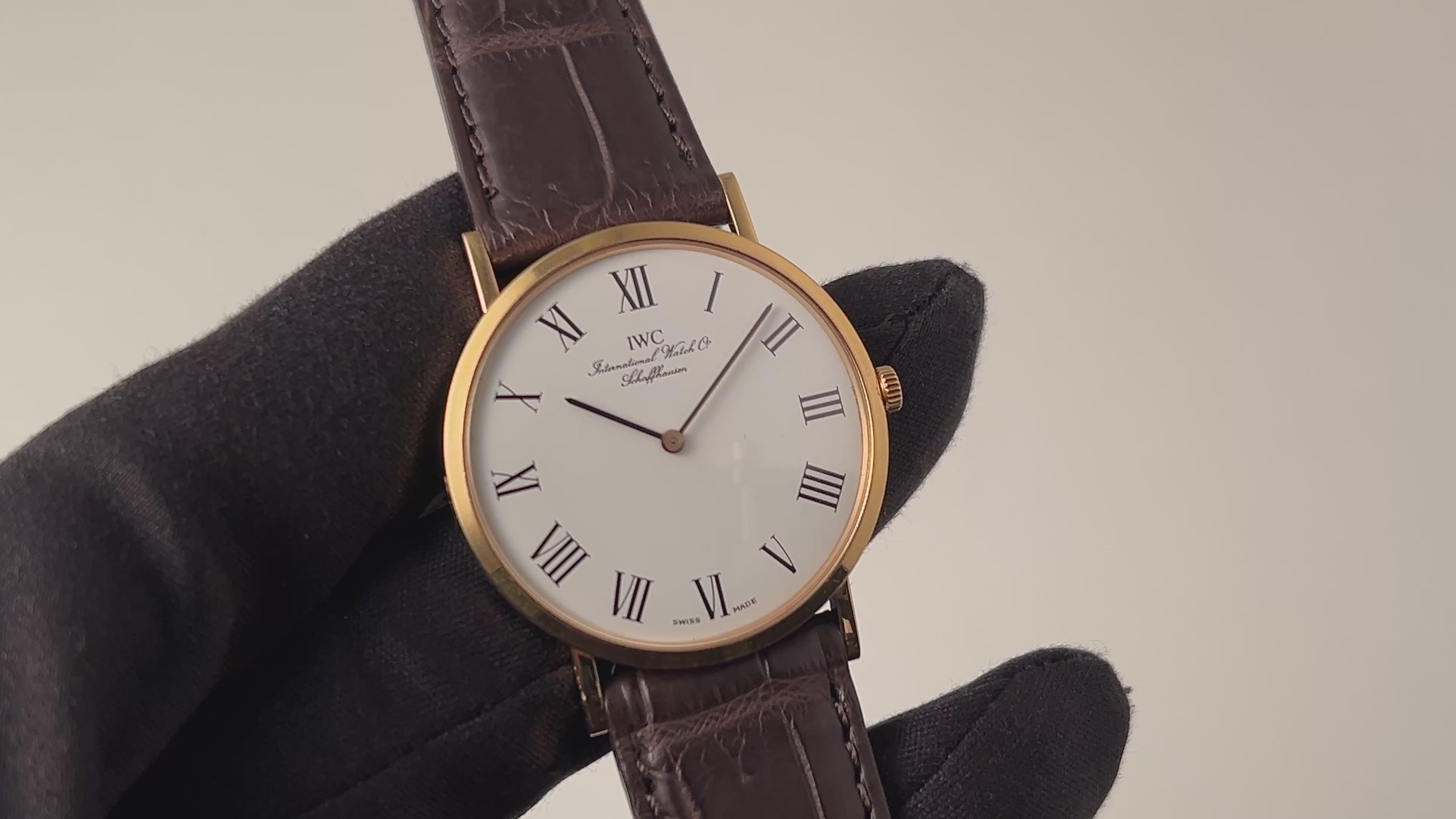 IWC 18金無垢ラウンドケース Ref.2010 1994年製 手巻き Cal.1852純正尾錠付きです。シンプルな18金無垢薄型ラウンドケースにホワイトローマン、針の組合せはIWCらしい1本になっています。文字盤は透明感のあるエナメル仕上げでひび割れ等無く綺麗です。ケースも余り使用感が無く小傷は見られますが良い状態になります。手巻きや針回しの操作はスムースです。ベルトはファイアーキッズオリジナルのクロコダイル革ベルトが取り付けられています。