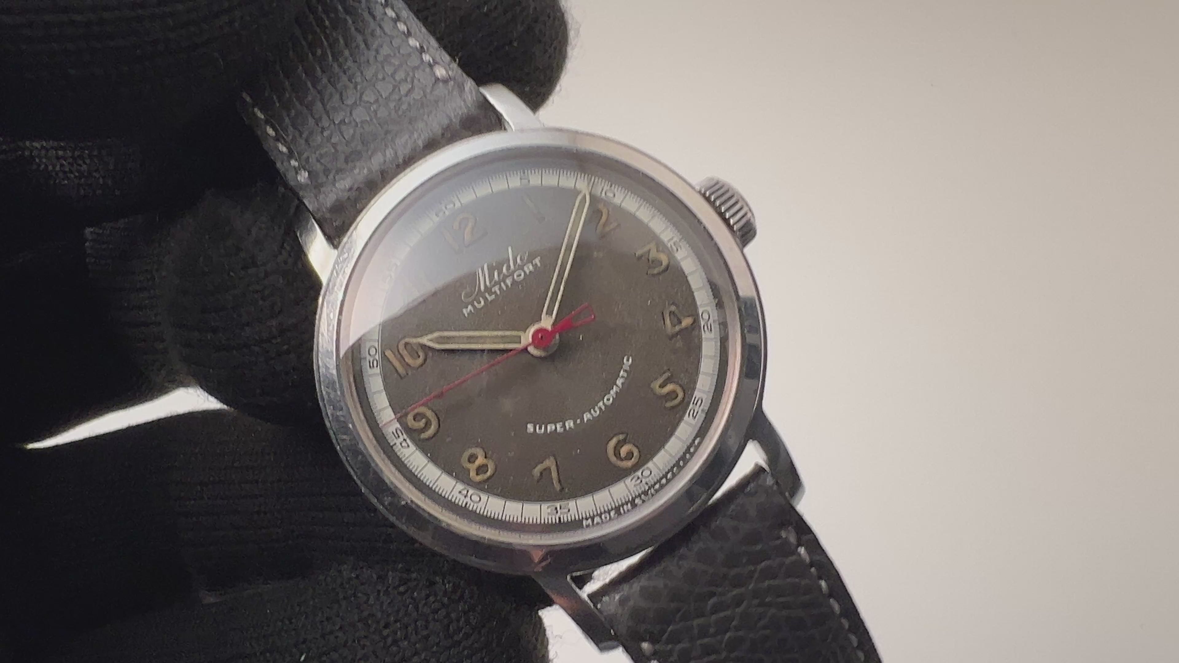 ミドーマルチフォート ハーフローター式オートマチック1940年後半製です。ラウンドケースにアラビア夜光インデックスの黒文字盤の組み合わせです。6時位置に「SUPER-AUTOMATIC」のプリントが示す通り、当時としては画期的な手巻き併用のバンパー式自動巻きモデルになります。小振りなサイズ感のモデルが多い中でこのラージケースはとても希少です。夜光のエイジングが非常に渋い雰囲気を出しています。ムーブメントはハーフローター採用の自動巻きでアシールド社Cal.1192ベースのCal.1017を搭載。ケース裏ブタは傷が多数ありますが大きなダメージはなくエッジもしっかりとしています。ベルトはアキュレイトフォルムのレザーベルトを装着しています。