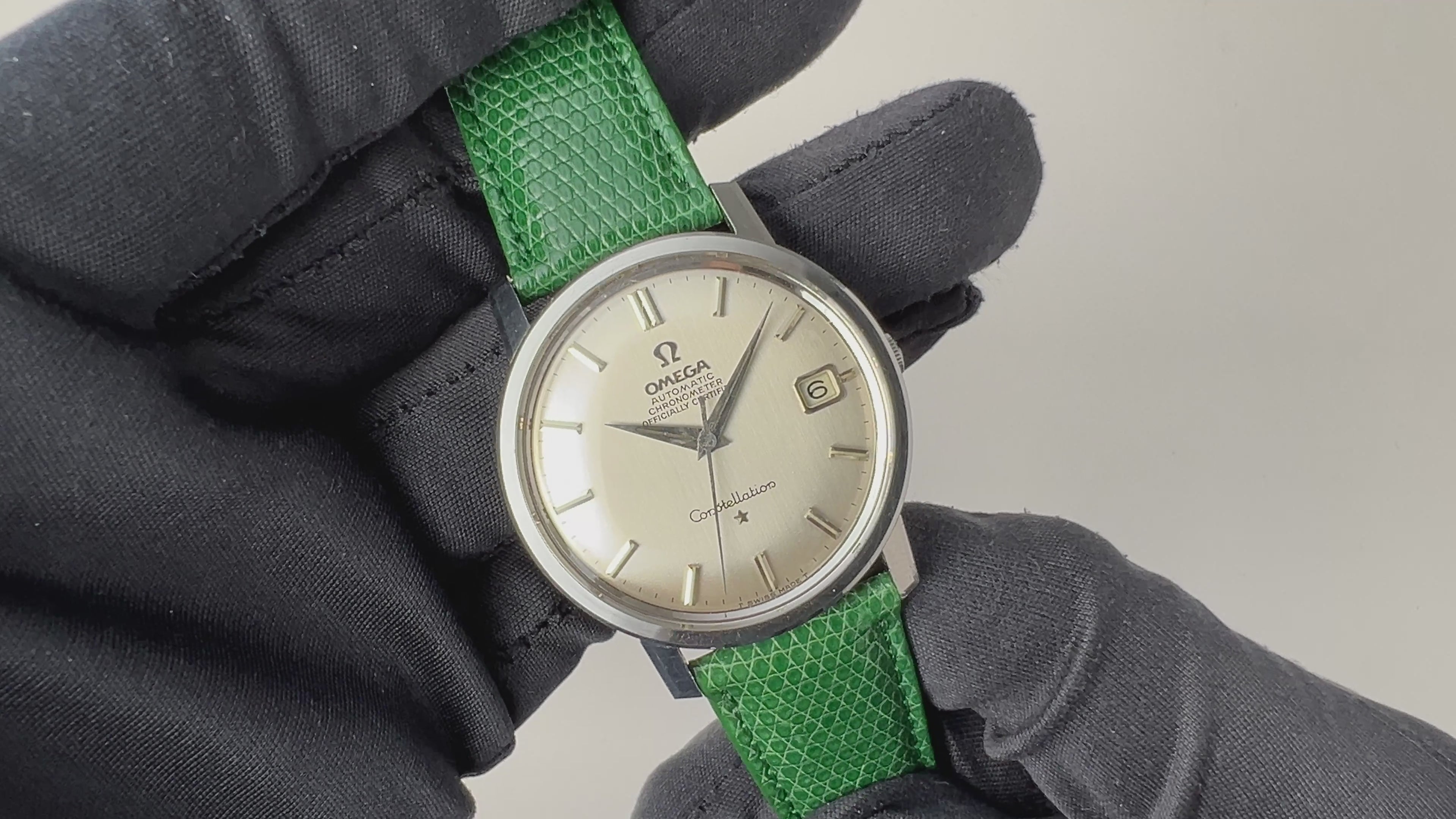 1966年製のオメガコンステレーションです。シンプルなラウンドケースにサンレイのシルバーダイヤルは飽きのこないシンプルなデザインです。存在感のある35mmサイズのケースは小傷は見られますが、ラグの面取りがしっかりと残っています。ムーブメントは2段引きでカレンダーの早送りができるCal.564を搭載しており、巻き上げはスムーズです。ベルトは社外の革ベルトを合わせています。