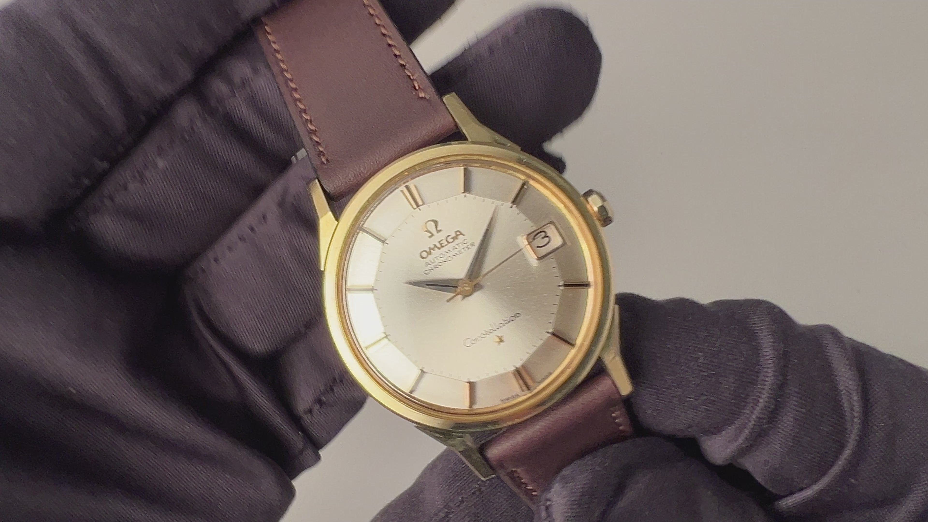 オメガ 18金無垢コンステレーション 12角 1962年製 クロノメーター自動巻き Cal.561搭載です。コンステレーションの中でも人気の12角は、気になるダメージのない良好な状態です。存在感のある34mmサイズの18金無垢ケースは小傷が見られますが、ラグのカットもシャープです。ムーブメントはクロノメータームー自動巻きブメントCal.561を搭載しており、巻き上げはスムーズです。ベルトはヴィンテージと相性の良いアキュレイトフォルムが取り付けられています。