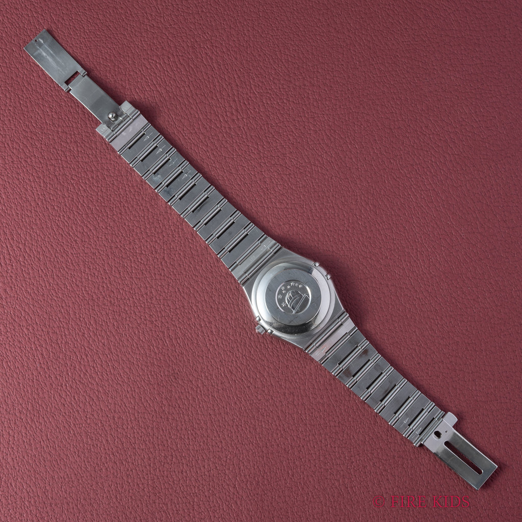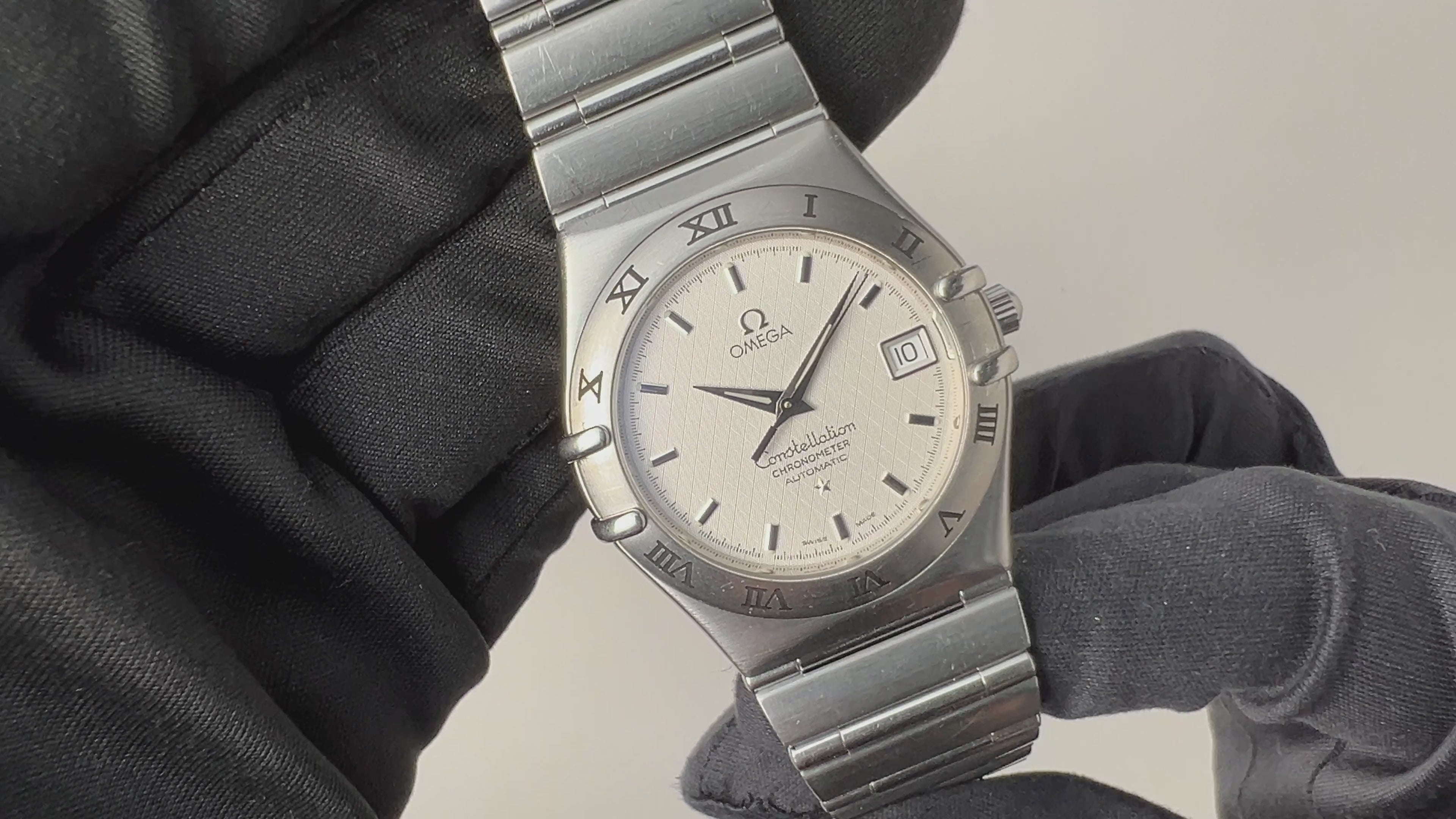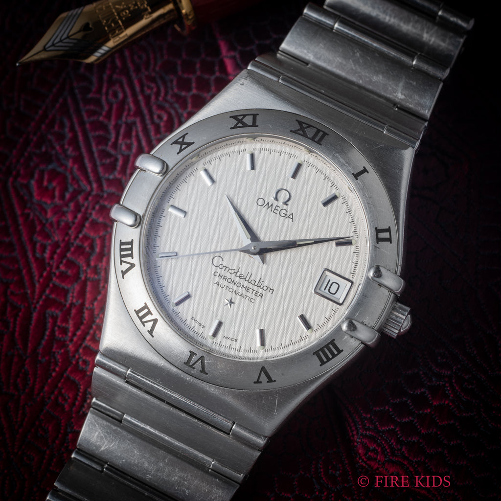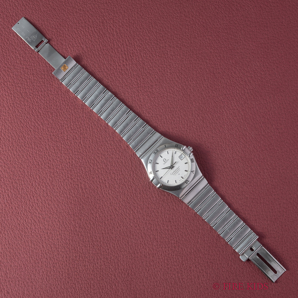 OMEGAの上位機種コンステレーション1999年製です。コンステレーションは時代によって様々な種類が御座いますがこちらはケースとブレスが一体化した統一感の有るモデルです。ギョウシェのホワイトダイヤルがお洒落で厚みを抑えたデザインが秀逸です。クロノメーターの自動巻きを搭載しています。ケース、ブレスは細かなキズが見られますが大きなダメージはありません。手巻きや針回しの操作はスムースです。こちらは分解掃除済みになります。