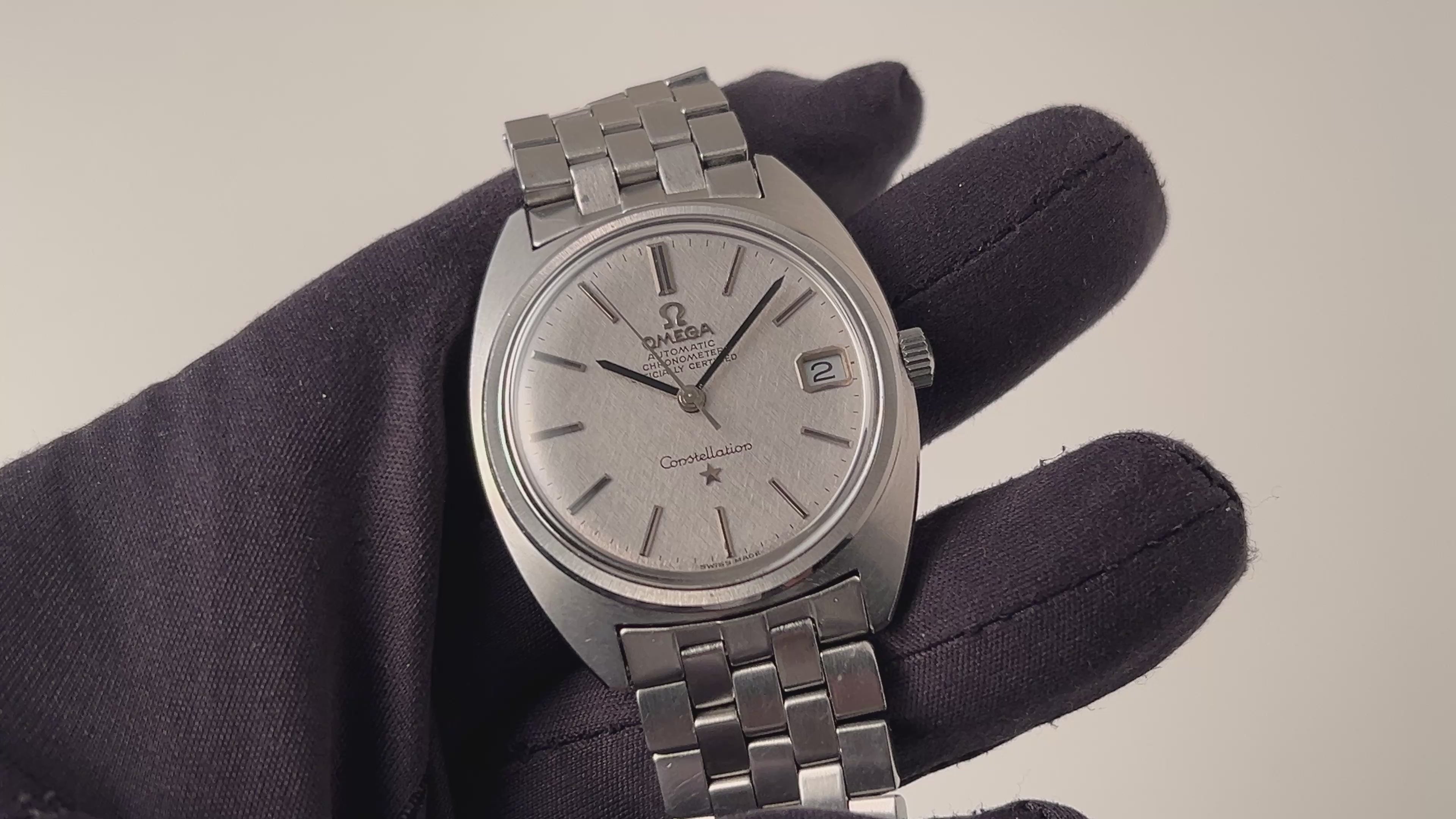 オメガ コンステレーション 1969年製 Ref.168.017 ジェンタ リネンダイヤル クロノメーター自動巻きです。世界一有名な時計デザイナーとして知られるジェラルド・ジェンタ氏の代表作の一つです。リネンシルバーは高級感があり、文字盤は視認性も良いです。ムーブメントはクロノメーターのCal.564を搭載、リューズを2段階でカレンダーを早送りできます。手巻きや針回し操作もスムーズです。ブレスは純正ブレスが取り付けてあります。こちらは分解掃除済みになります。