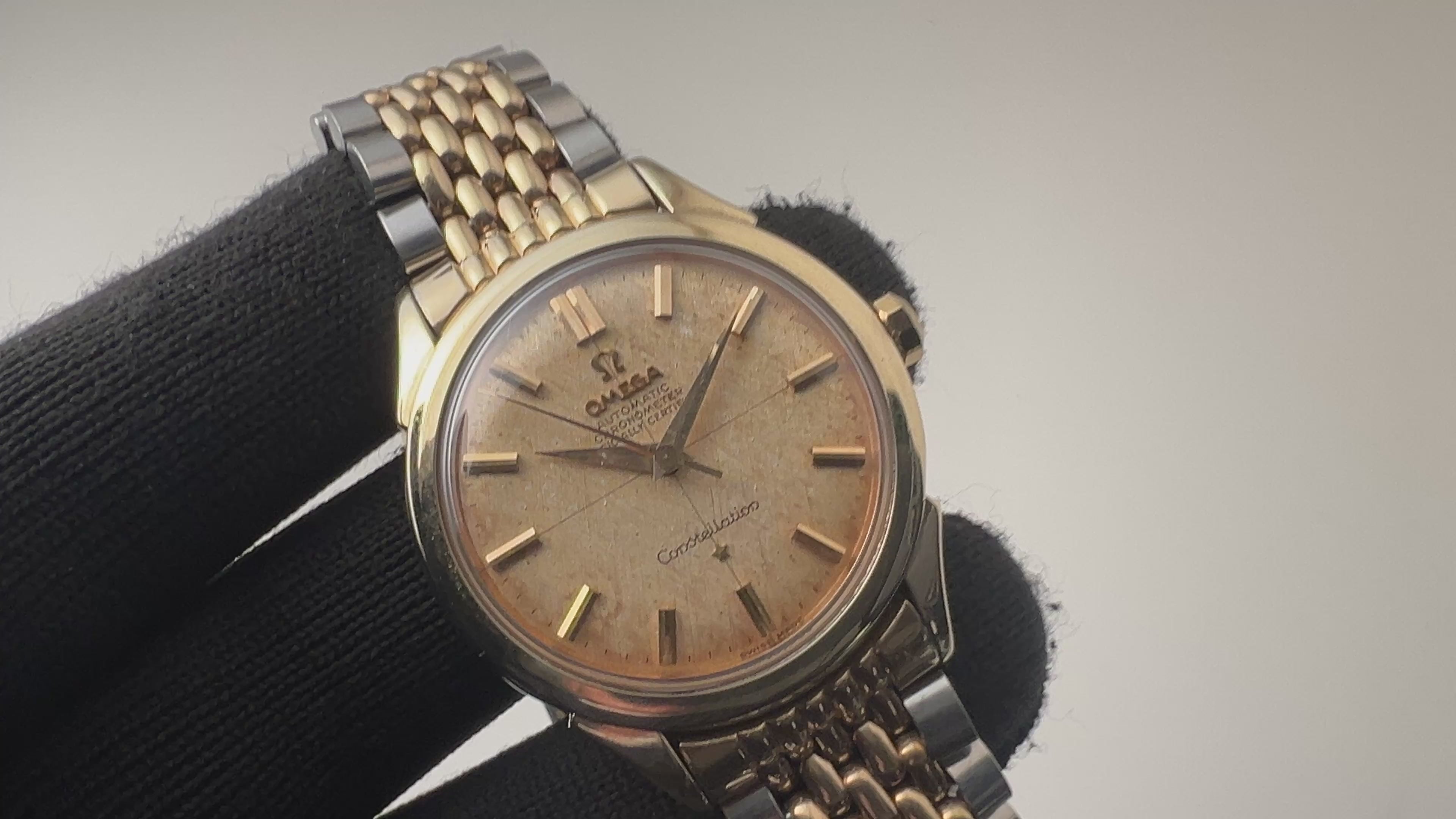 1958年製のオメガコンステレーションRef.2887-2SCです。オメガの最高級ラインであるコンステレーションの中でも高級感のあるトップゴールドケースです。文字盤は全体が経年変化しており、ヴィンテージらしい雰囲気です。ケースは小傷はありますが大きなダメージはなく、裏ブタのメダリオンもしっかり残っています。ムーブメントは初期型の全回転自動巻きCal.505を搭載、手巻きや針回しの操作はスムースです。ベルトはアメリカ市場向けとも言われるコンビの純正ジュビリーブレスが取り付けられています。