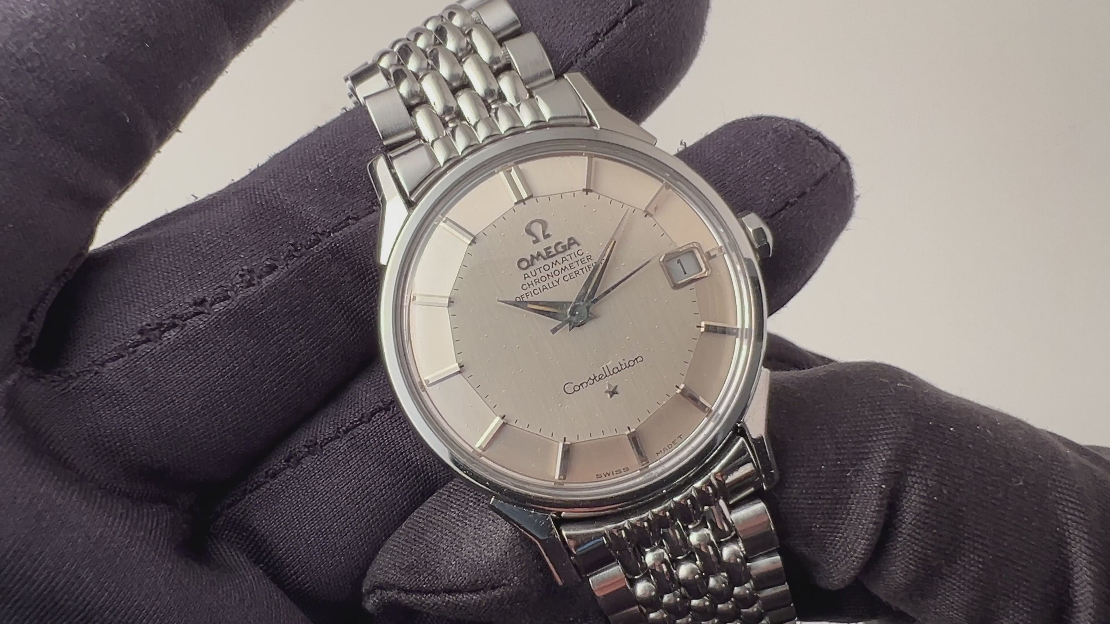 オメガ コンステレーション 12角 1967年製 自動巻クロノメーター Cal.564 純正ライスブレスの入荷になります。 オメガの最上級モデル、コンステレーションの中でも人気の12角デザインです。文字盤は程よく経年で変色して良い雰囲気になっています。ケースは小傷が見られますが大きなダメージはありません。ムーブメントは自動巻きクロノメーターのCal.564を搭載しています。手巻きや針回しもスムーズです。ベルトは純正ステンレスライスブレスが取り付けられています。こちらは分解掃除済みになります。
