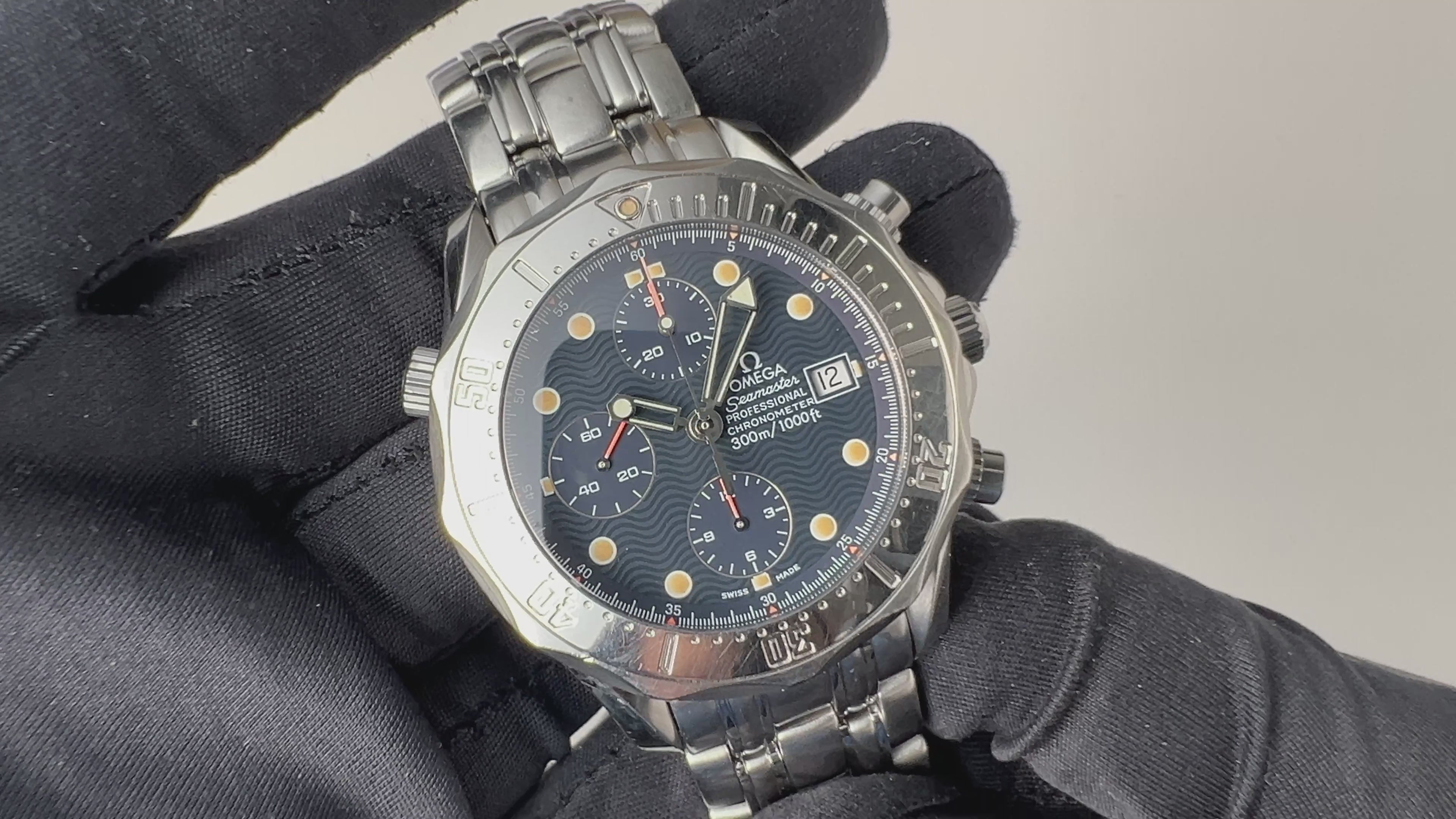 1985年製 オメガのシーマスター300m クロノグラフです。本格的ダイバーズウオッチにクロノグラフ機構がついたプロユースモデルです。程よく変色した夜光が80年代製ながらヴィンテージらしい雰囲気です。全体的に小キズが見られますが大きなダメージはありません。手巻きや針回し、リューズのねじ込みの操作はスムースです。ベルトは純正のステンレスブレスが取り付けられています。