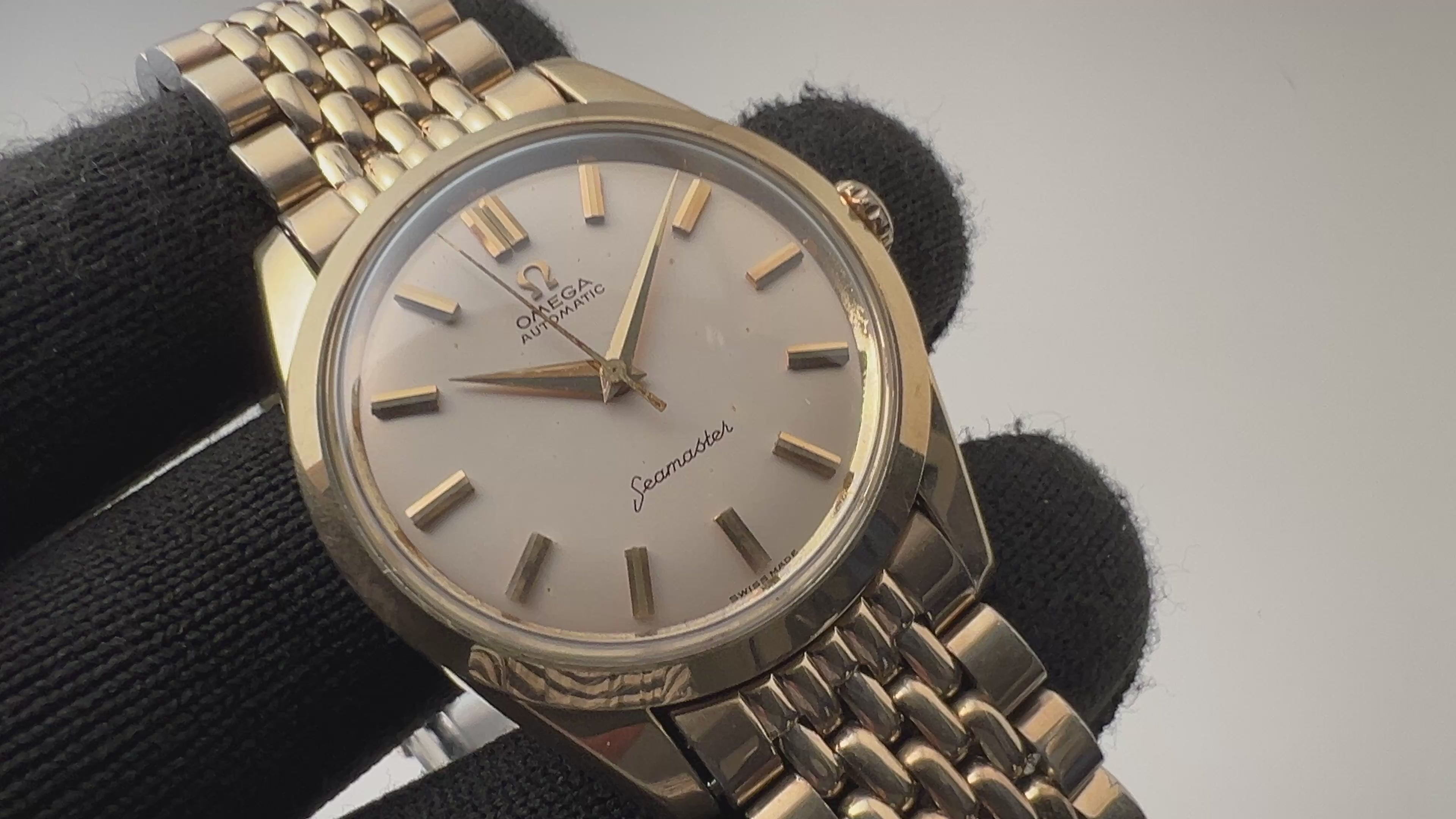 オメガ シーマスター 1962年製 Ref.14779-61 SC トップゴールドケース 純正金張りブレスが入荷しました。定番のシーマスターですが縦にヘアラインの入るダイヤル、トップゴールドケースは特別感があります。ダイヤル、ケースともに年代なりの経年や小傷はありますが年代を考慮すると良いコンディションです。オメガらしいカッパーメッキが施されたCal.552を搭載し、手巻きや針回しはスムーズです。ベルトは純正の金張りライスジュビリーブレスです。こちらの時計は分解掃除済みです。