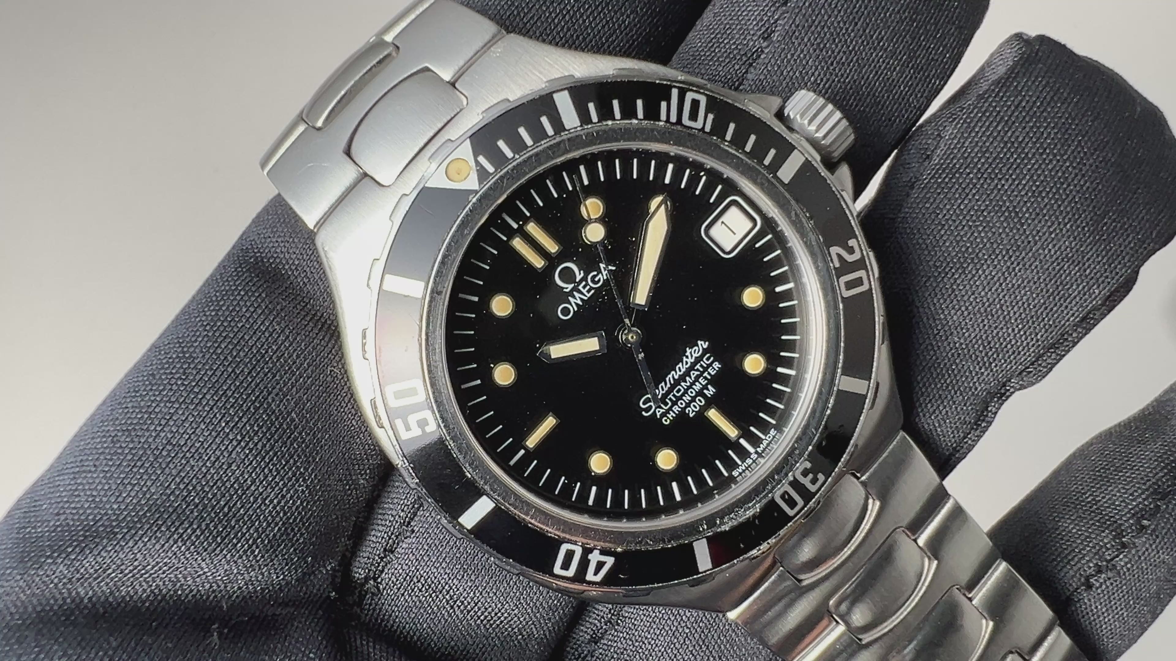 1988年製のオメガシーマスタークロノメーター200mです。通称「プレボンド」と呼ばれています。デザインはジェラルド・ジェンタ氏が手掛けたと言われているダイバーズウオッチになります。厚みが抑えられフィット感の良いダイバーズウオッチです。ムーブメントは自動巻きのCal.1109を搭載。ケースには大きなダメージはありません。手巻きや針回し、カレンダー早送り、リューズねじ込みの操作はスムーズです。ベルトは純正ステンレスブレス1465/453が取り付けられています。こちらは分解掃除済みになります。