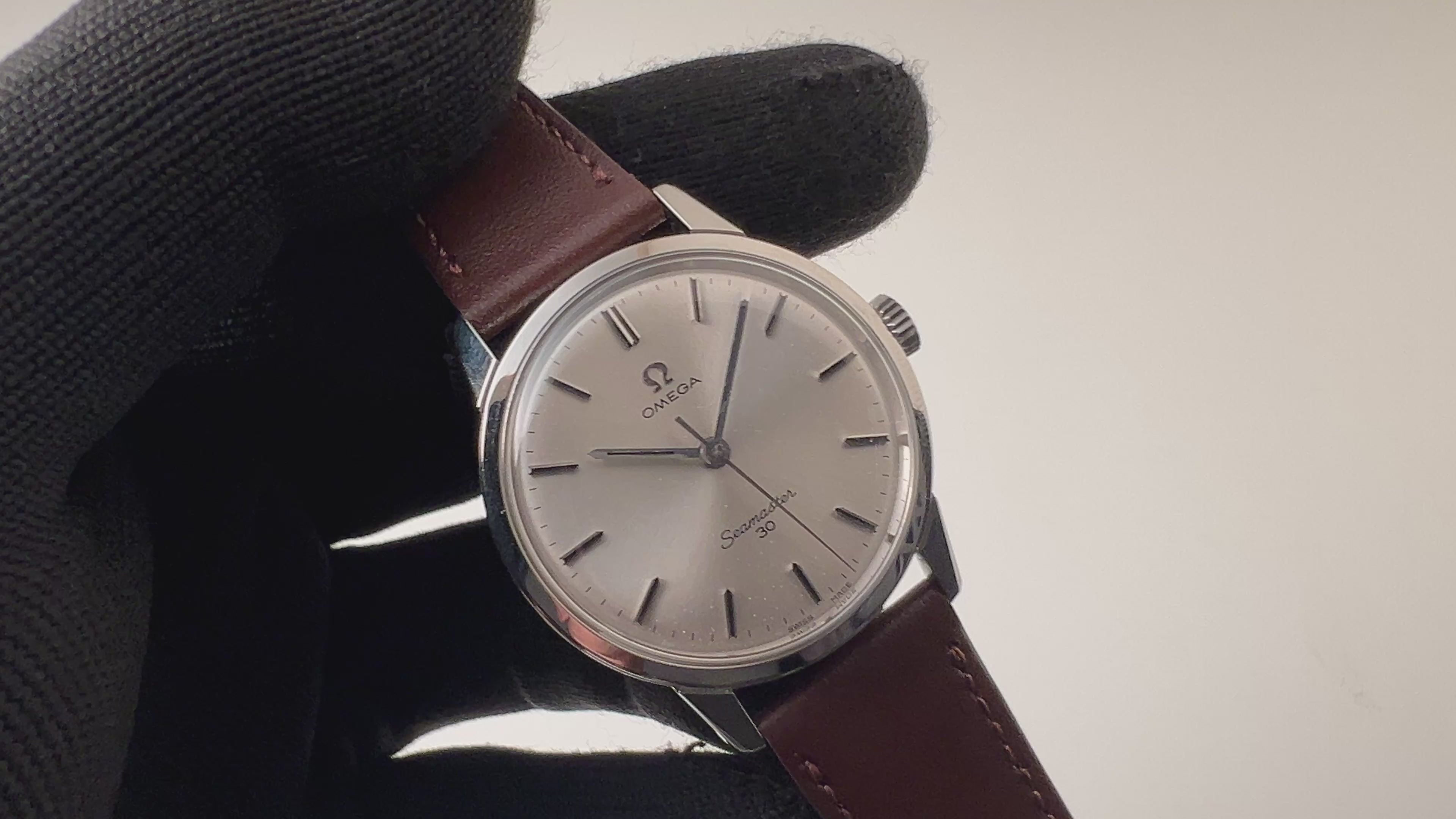 1964年製のオメガシーマスター30 手巻きモデルです。文字盤にある「30」とは、30m防水の事ではなく30mmキャリバーが搭載されている事からきています。ラウンドケースにシルバー文字盤のシンプルで飽きの来ないデザインです。ムーブメントは30mmキャリバーのCal.286を搭載。ケースは小傷程度で大きなダメージはありません。手巻きや針回しの操作はスムースです。ベルトは社外の革ベルトを合わせています。