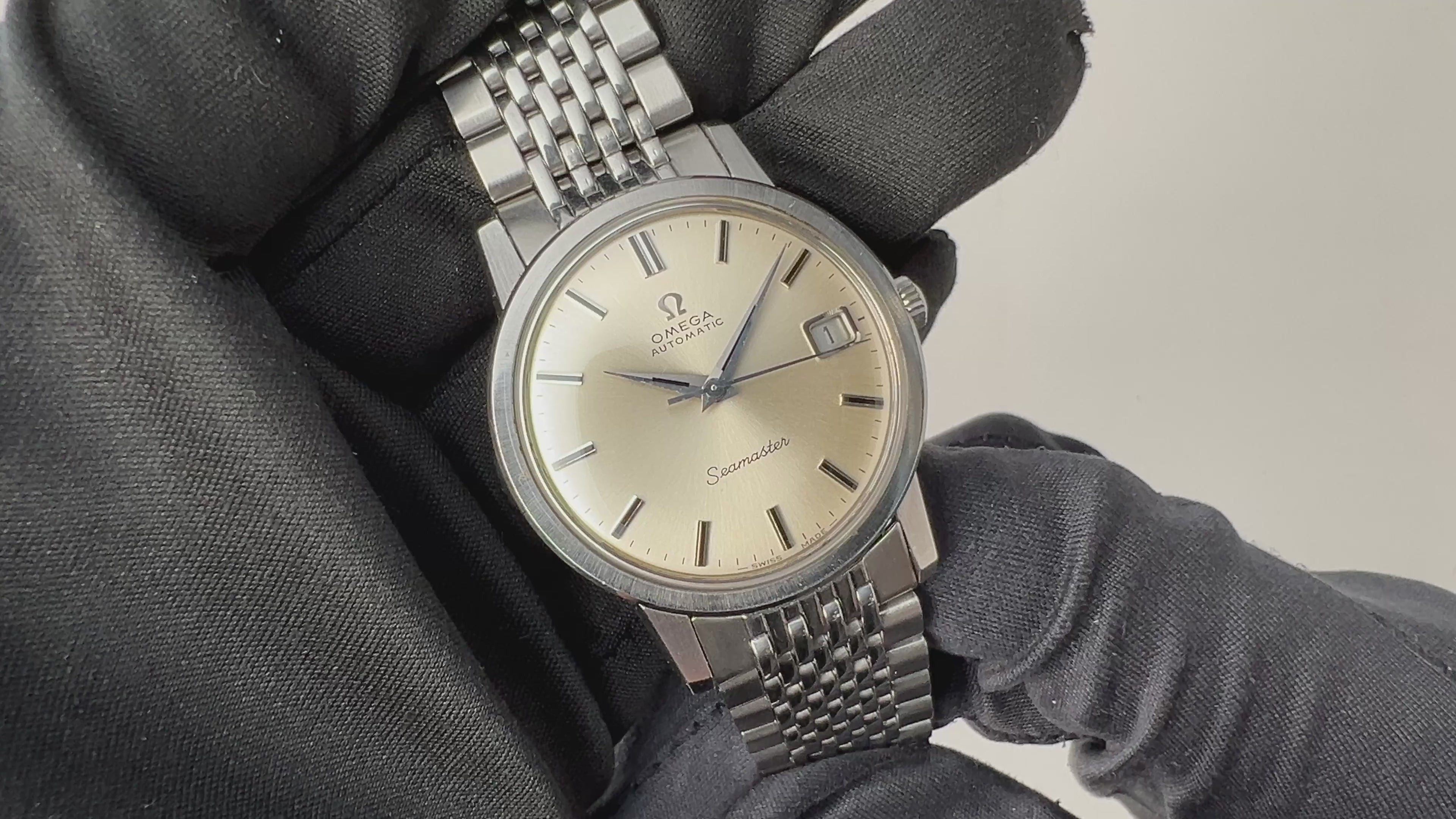 オメガ シーマスター 1969年製 自動巻 Cal. 565 Ref.166.003 SP 純正ライスブレス付きの入荷になります。シンプルなラウンドケース、アップライトバーインデックスとΩマークとシルバー文字盤のシンプルですが飽きの来ない組み合わせです。デイトは早送り付きで実用性も高いモデルです。文字盤は肉眼で気になるダメージは無く、概ね良好です。ムーブメントはオメガの黄金時代を支えた500番台のCal.565を搭載です。手巻きや針回しの操作はスムースです。ベルトは純正ブレスが取り付けてあります。こちらは分解掃除済みになります。