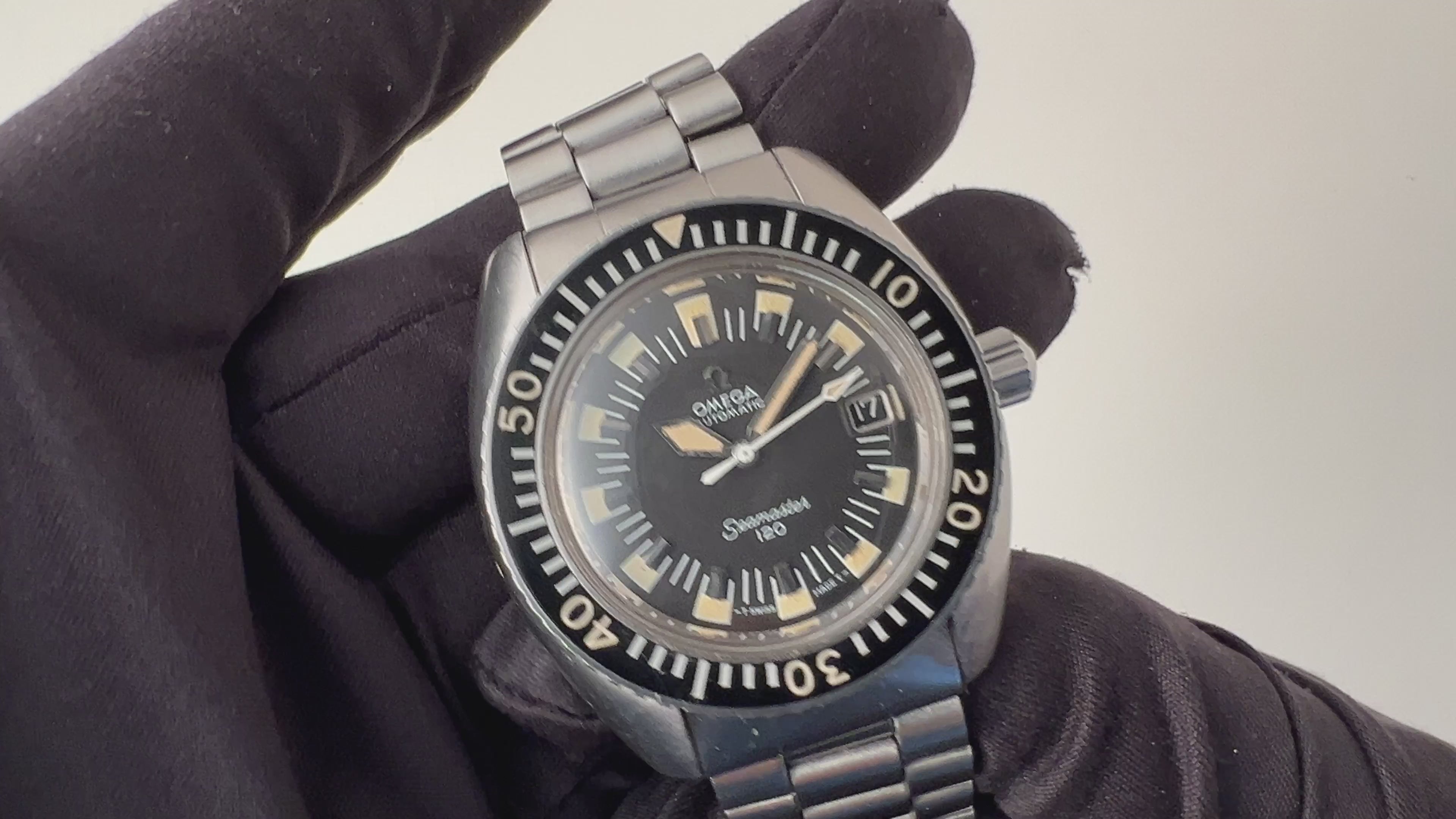 1973年製オメガのRef.166.073 シーマスター120 ブラックダイヤルです。通称ディープブルーと言われるツヤのあるブルー文字盤が有名なモデルですが、ブラックダイヤルはブルーよりも希少なダイヤルです。Ref.166.073は軍用として納品された実績もあり、納品されたものは今回の個体と同じブラックダイヤル仕様です。ブラックの文字盤は、ブルーとは違いマットな仕上げになっており、コンディションも良く、オリジナルの夜光塗料が欠落する事なく残っています。ケースは全体に小キズはありますが、オリジナルのシェイプを保っています。ベイクライトの回転ベゼルもヒビのない良い状態です。ムーブメントもCal.565を搭載、リューズを引いてカレンダーの早送りができます。ベルトは貴重な1170/FF634ステンレスブレスが取り付けられています。   オメガの純正箱付きになります。