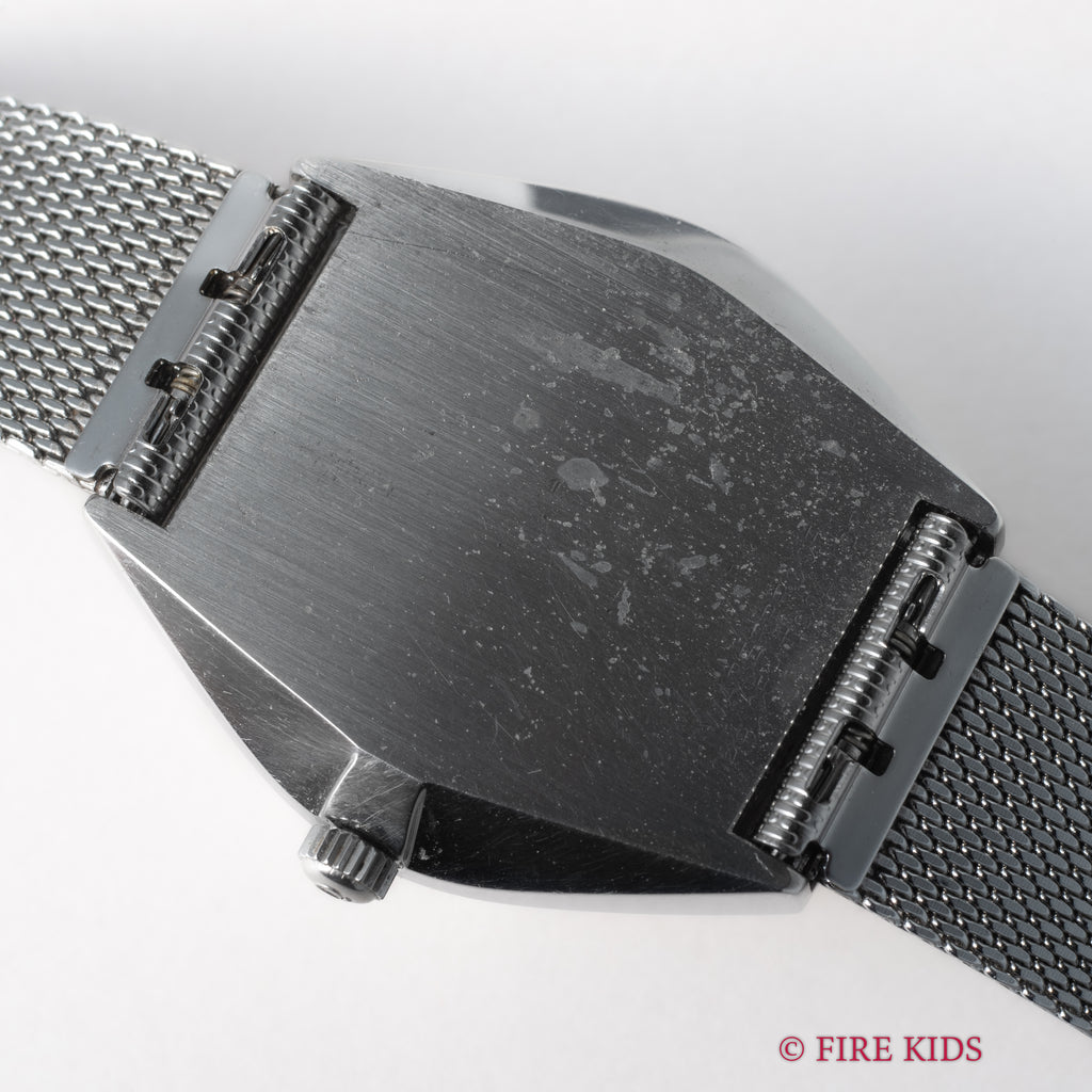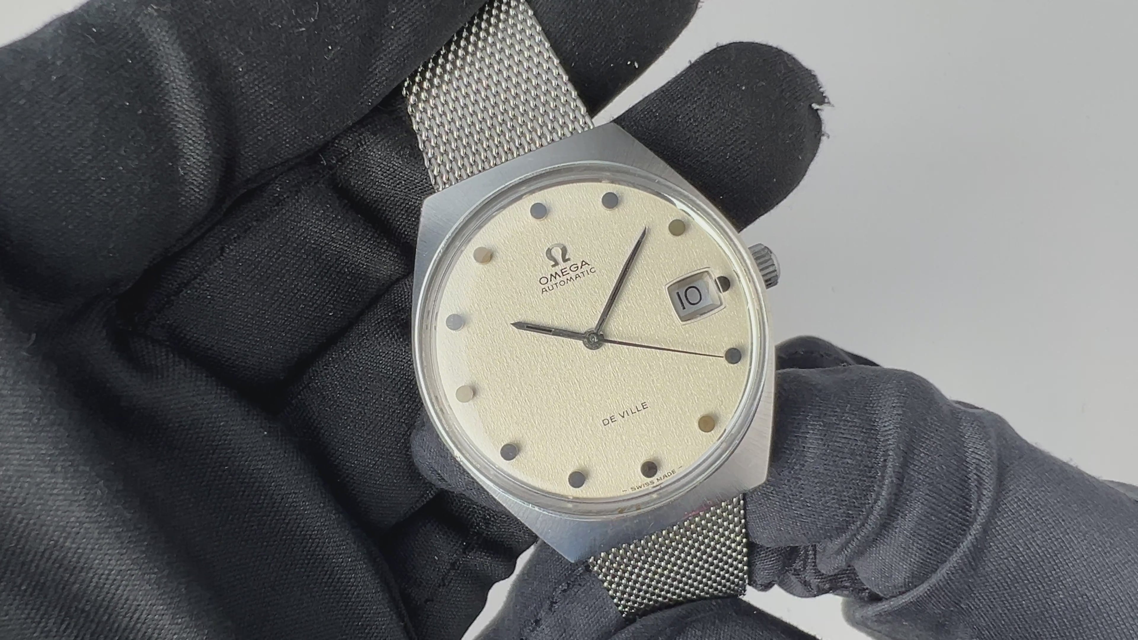 1969年製のオメガ デ・ヴィル Ref.166.051 ワンピースケースに立体的なドットインデックスのシルバーダイヤルが魅力的です。ダイヤルやケースは多少の経年はありますがオリジナルのヘアラインも残った良いコンディションです。ムーブメントはCal.1002を搭載し、手巻きや針回しはスムーズです。ブレスは社外のメッシュブレスが取り付けてあります。こちらは分解掃除済みになります。