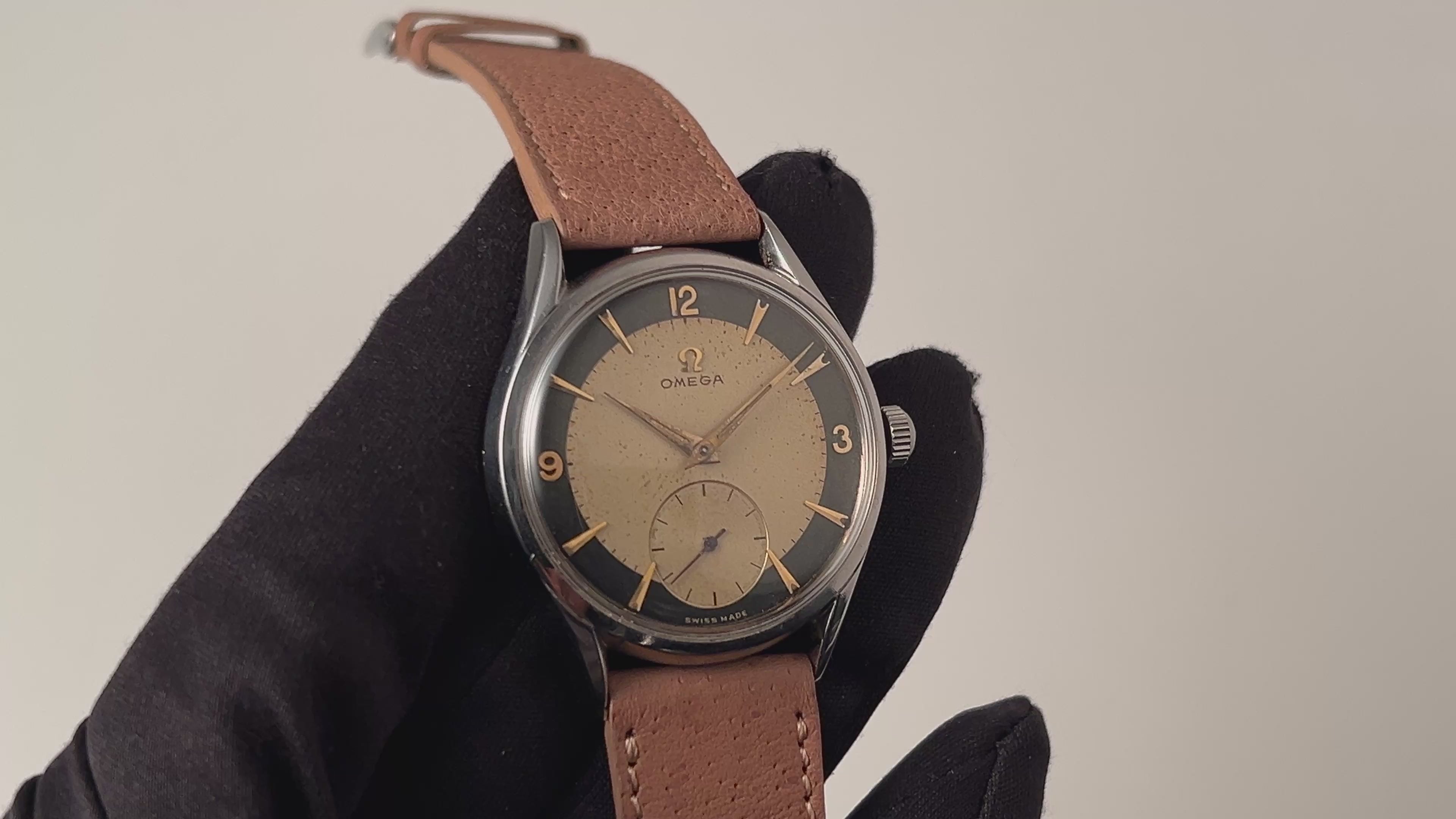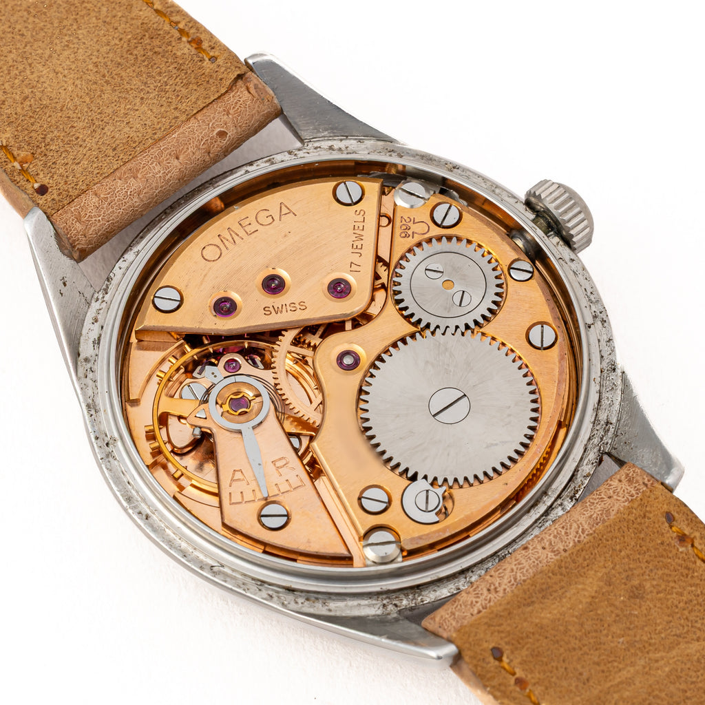 オメガ 30mmキャリバー 1954年製 ブルズアイ 手巻き Cal.266搭載です。ブルズアイ飛びアラビアダイヤルで金色のインデックス、針が50年代らしく魅力的です。ツイストの掛かっているラグがお洒落です。文字盤は経年がありますが良い雰囲気が出ています。ケースは小傷が見られますが大きなダメージはありません。手巻きや針回しの操作はスムースです。ベルトは社外の革ベルトに純正尾錠が取り付けられています。