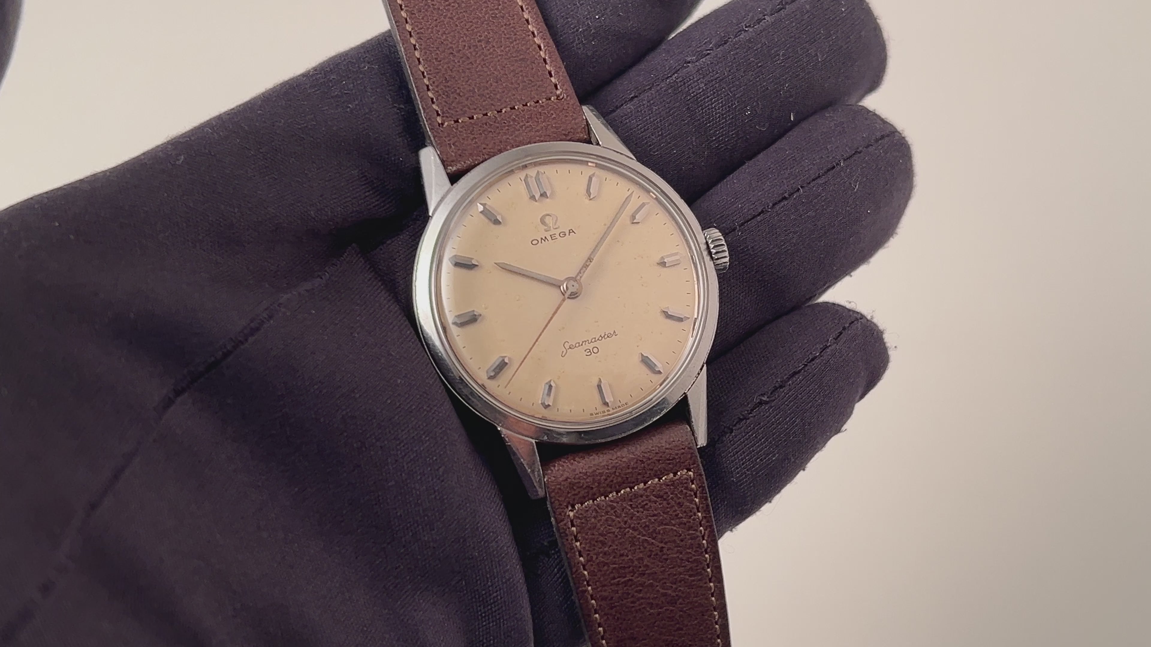 1962年製のオメガシーマスター30 手巻きモデルです。文字盤にある「30」とは、30m防水の事ではなく30mmキャリバーが搭載されている事からきています。シルバーの文字盤は、多面にカットされたインデックスが目を引くデザインです。経年変化はありますが、雰囲気を損なうようなものではありません。ケースに小傷はありますが、オリジナルのシェイプを保った自然な状態です。ムーブメントは30mmキャリバーのCal.286を搭載、手巻きや針回しの操作はスムースです。ベルトはアキュレイトフォルムの革ベルトを合わせています。こちらは分解掃除済みです。