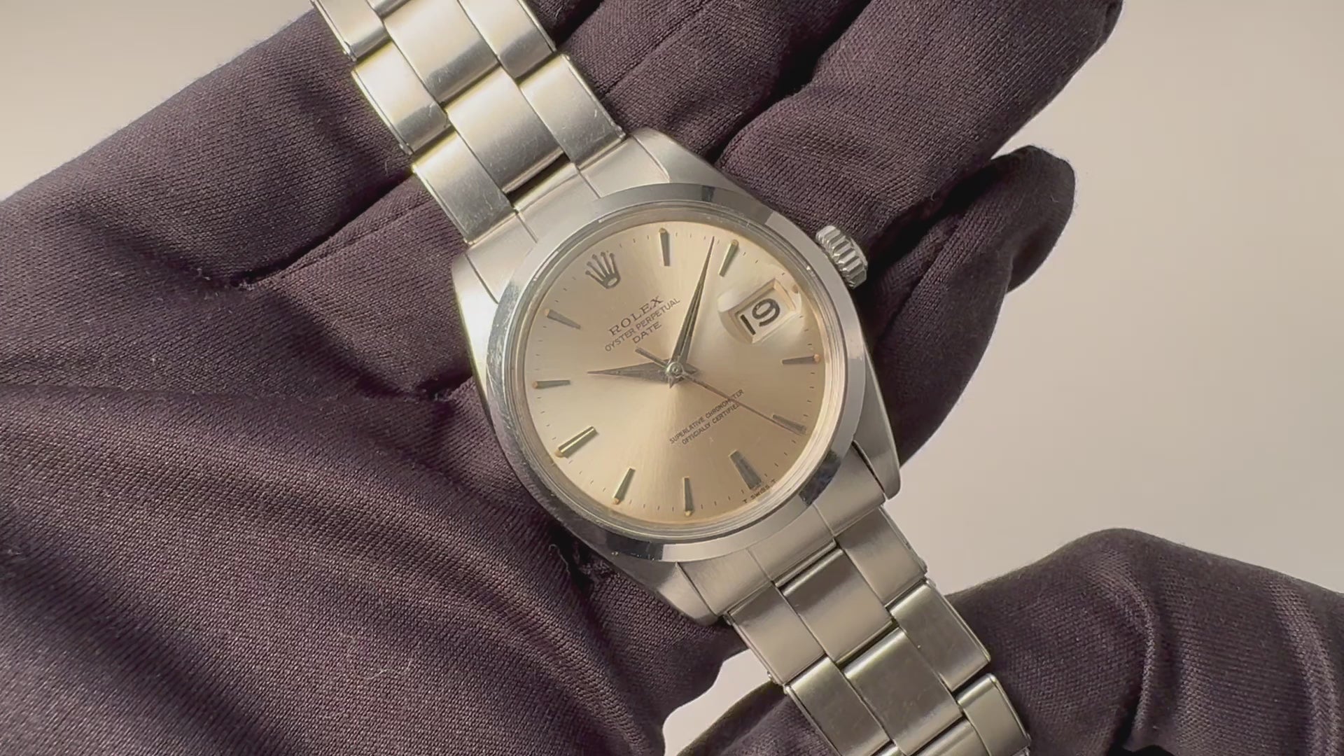 1965年製のロレックスオイスターパーペチュアルデイトです。ステンレスケースにスムースベゼル、シルバー文字盤の組み合わせのスッキリとした印象です。またドーフィンハンドやリベットブレスから感じるアンティーク感が魅力的な一本です。ムーブメントは傑作Cal.1560を搭載しています。ケースは細かな傷が見られますが大きなダメージ無く良い状態です。手巻きや針回し、ねじ込みリューズの操作はスムースです。こちらはOH済みです。