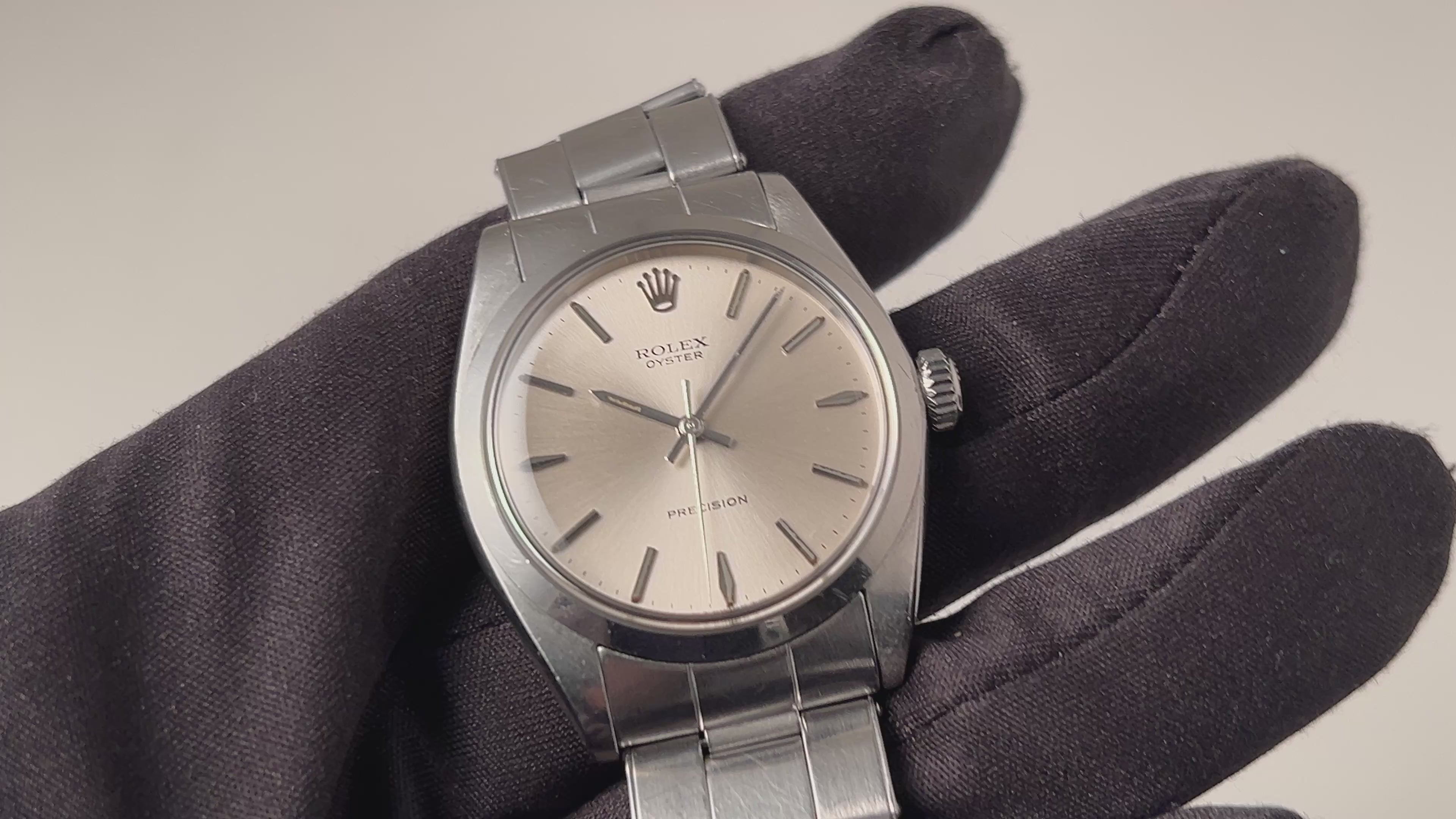 ロレックス オイスタープレシジョン 1967年製 Ref.6426 純正リベットブレス付きです。落ち着いた印象の縦にヘアラインが入るシルバーダイヤルは、肉眼で気になる様なダメージもなく、夜光が入らないスッキリとした印象です。ケースは、小傷はありますが、過度な仕上げのない自然な状態です。ムーブメントはCal.1225を搭載、手巻きや巻き上げはスムーズです。ベルトは純正のリベットブレスが取り付けられています。こちらの時計は分解掃除済みです。