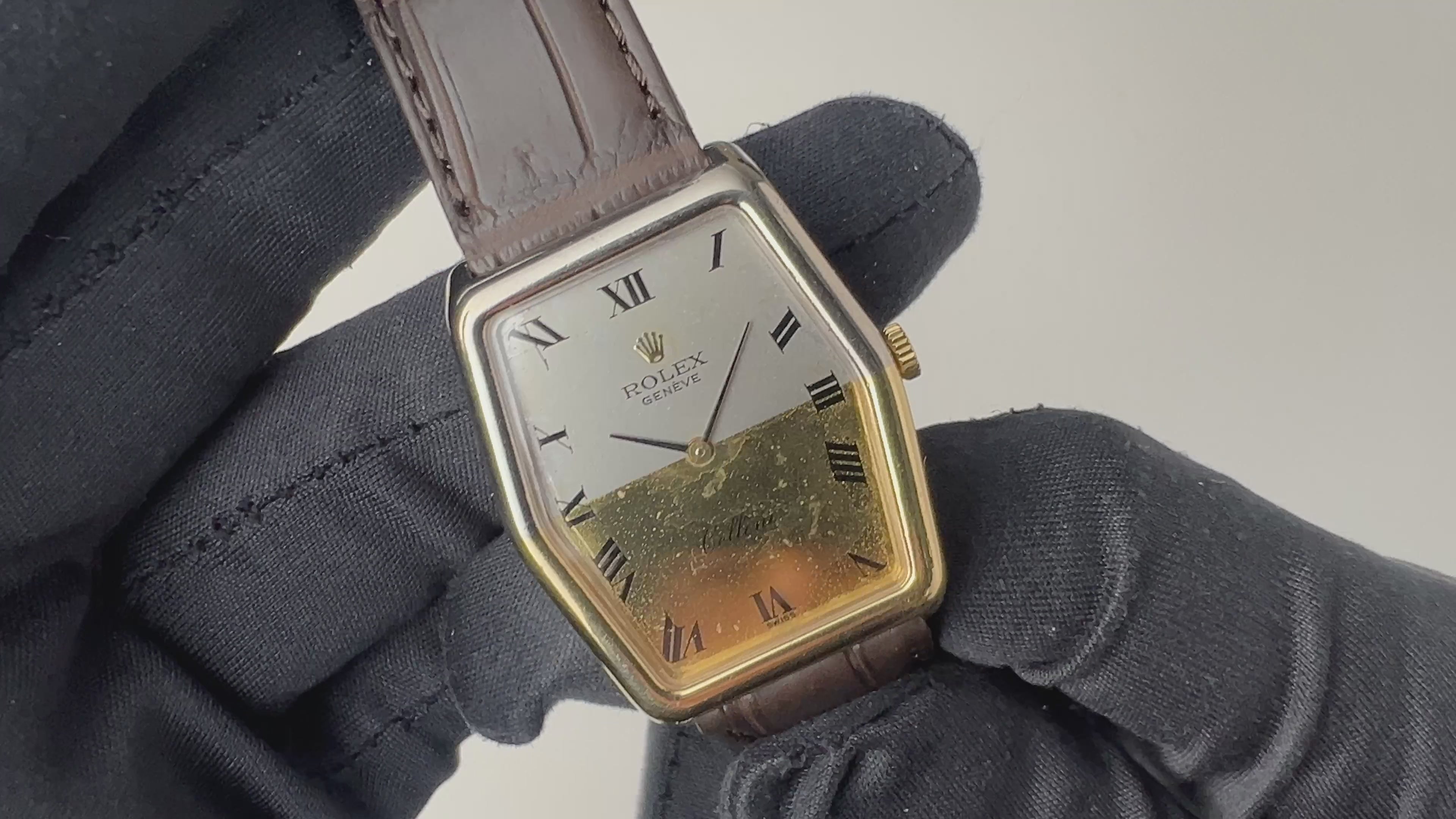 1974年製のロレックス チェリーニ 18KYG / 18KWG Ref.4107 ヘキサゴンケースです。大変珍しいイエローゴールドとホワイトゴールドを上下で組合わせて使用したバイカラーのヘキサゴンケース(裏ブタは18KYG製)が魅力的な一本です。文字盤は表面の劣化が見られます。ムーブメントは手巻きのCal.1600を搭載。手巻きや針回しの操作はスムースです。ベルトはクロコダイルが取り付けてあります。