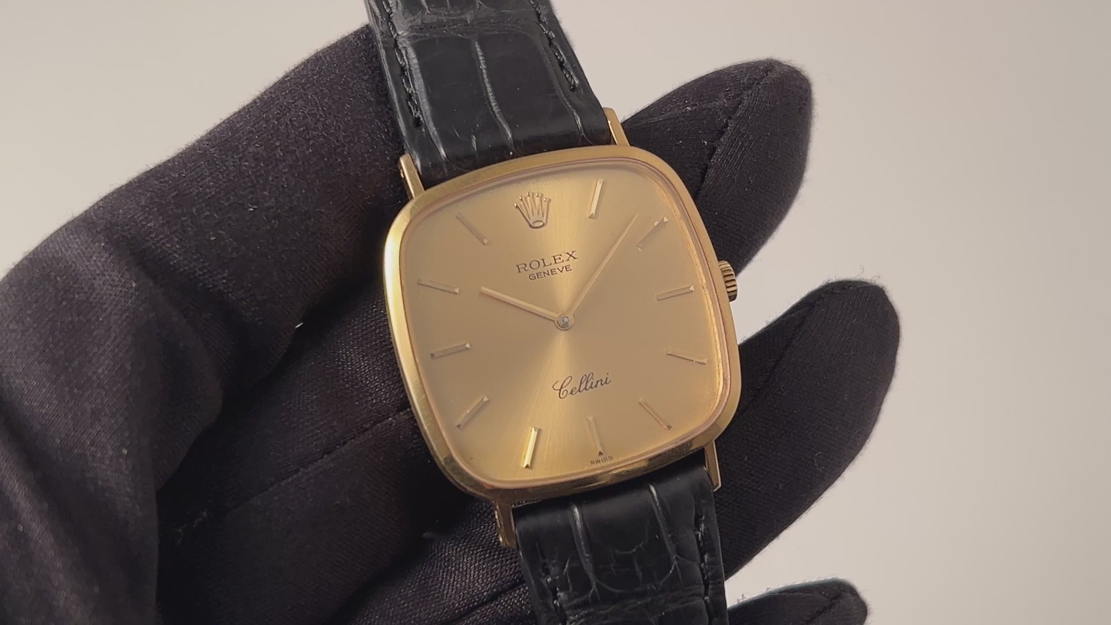 ロレックス チェリーニ  1975年製 18金無垢イエローゴールド シャンパンダイヤル 王冠GP尾錠付きの入荷になります。珍しいクッションケースでシャンパンダイヤル幅約30mm(リューズ別)厚さ約5.5mmと上品なサイズ感です。手巻きや針回しの操作はスムースです。ムーブメントも非常に綺麗な状態です。ベルトはファイアーキッズオリジナルのクロコダイル革ベルトに純正のGP尾錠が取り付けられています。こちらは分解掃除済です。
