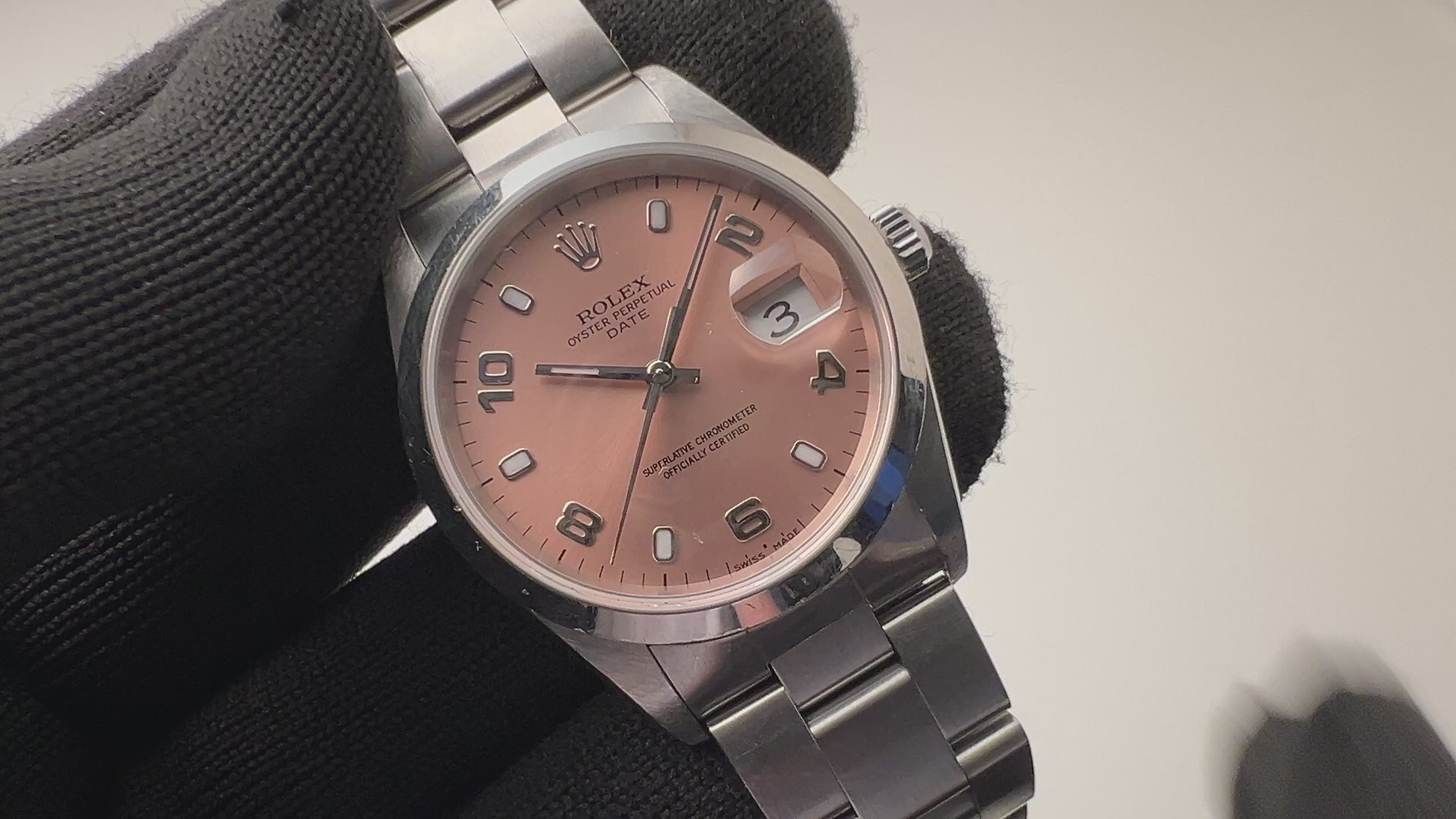 1999年製のロレックスオイスターぺーぺチュアルデイト Ref.15200です。ダイヤルはピンクで、腕馴染みの良い34mmのケース径で使いやすく、飛びアラビア数字が個性ある一本です。ムーブメントは名機のCal.3135を搭載し、手巻きや針回し、カレンダー早送りはスムーズです。ケースは小傷はございますが大きなダメージはありません。ベルトは純正ステンレスブレス(78350/FF557B)が取り付けられています。こちらは分解掃除済みです。