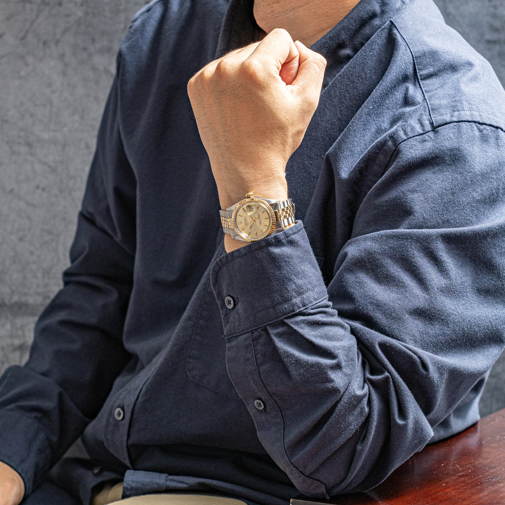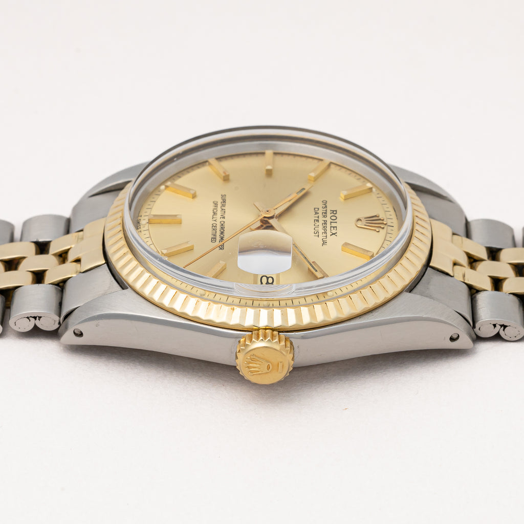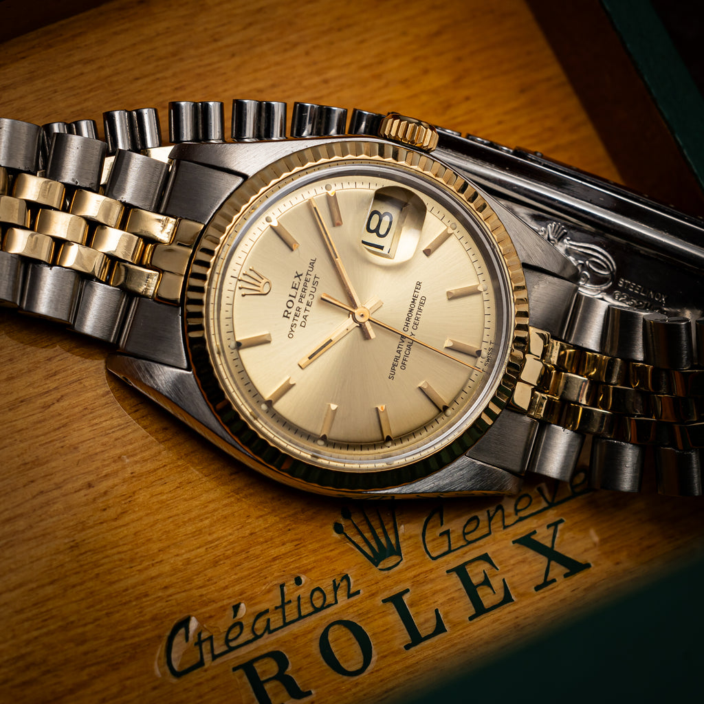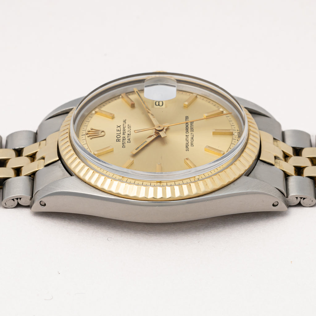1971年製のロレックスデイトジャスト コンビモデルになります。ダイヤルは経年変化によって全体が良い雰囲気に落ち着いた風合いになってます。珍しい形状のインデックスは半分だけ刻みが入っており、ツートーンに見えます。ケースはダメージの入りやすいフルーテッドベゼルは大きな傷もなく、良いコンディションです。ムーブメントは自動巻きのCal.1570を搭載しております。ブレスレットは純正のジュビリーブレス6252H/FF255を合わせております。箱、外箱、ギャランティ、クロノメーター証、タグ等が揃った特別感がある1本です。