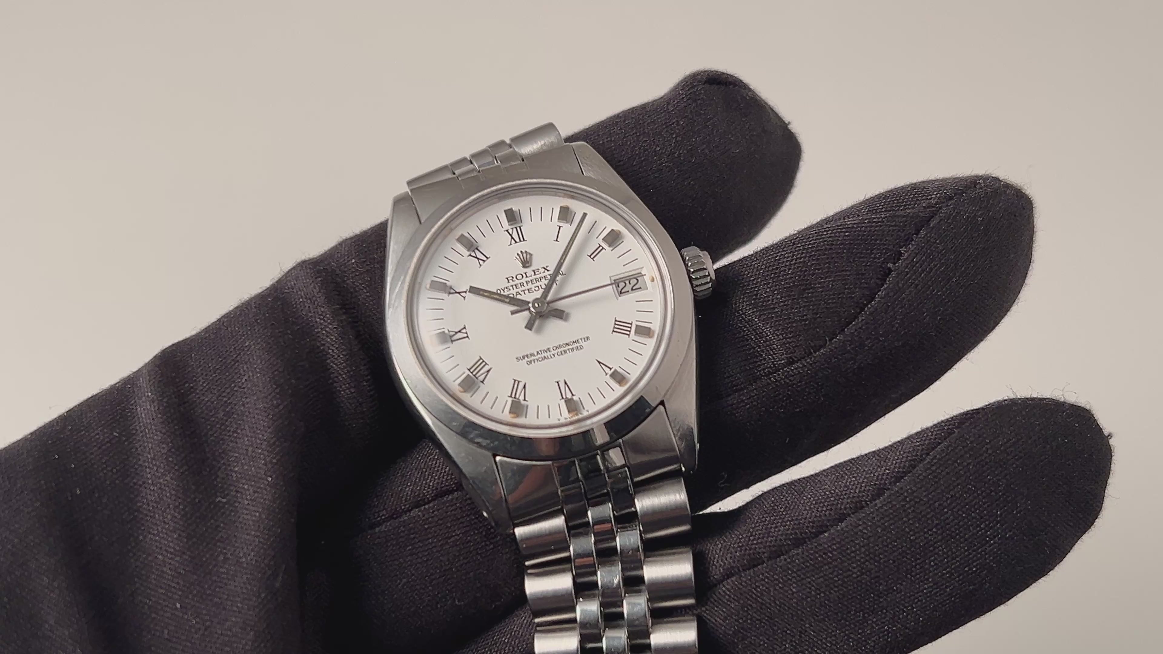 ロレックス オイスターパーペチュアル ボーイズサイズ スムースベゼル 1978年製 Ref.6824 ホワイトローマンダイヤルです。珍しいボーイズサイズにスムースベゼルでホワイトローマンダイヤルです。文字盤は綺麗でケースも小傷が見られますが大きなダメージはありません。手巻きや針回しはスムーズです。ブレスは純正のジュビリーブレス62510M/587が取り付けられています。こちらは分解掃除済です。