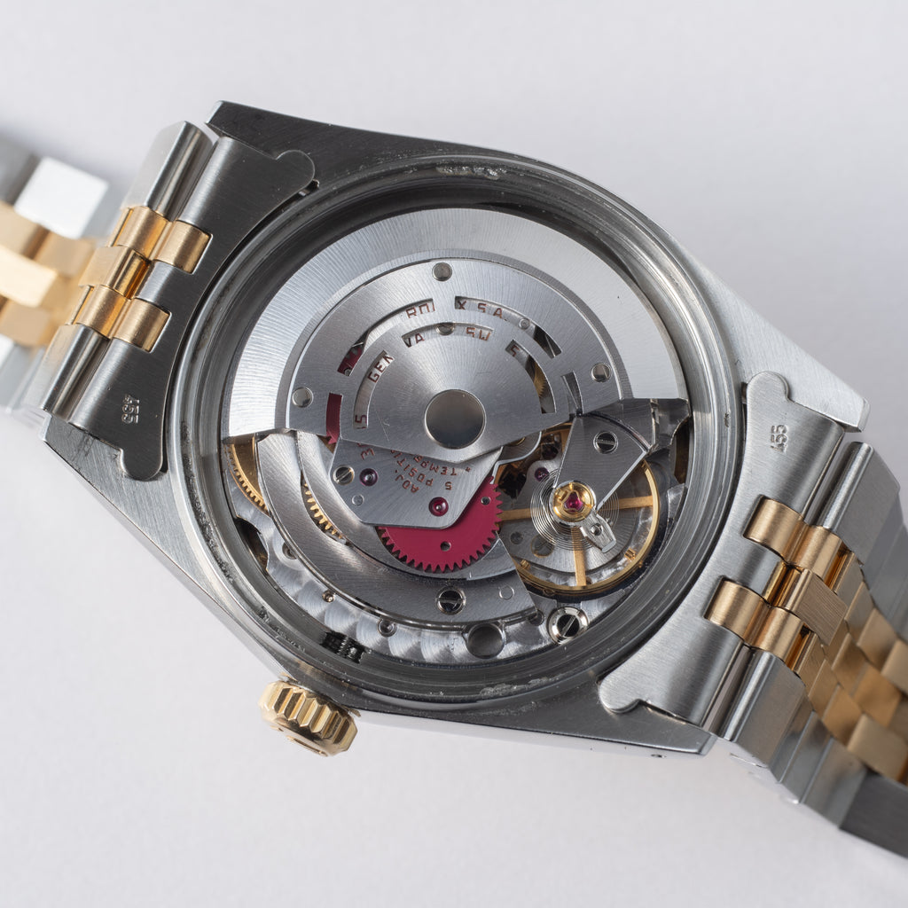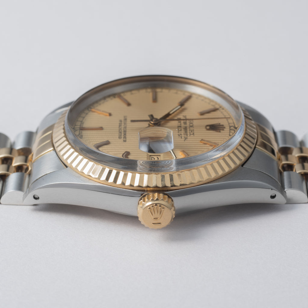 ロレックス デイトジャスト コンビ 1985年製 Ref.16013 純正コンビジュビリーブレスです。ケース素材はステンレスとイエローゴールドのコンビで、文字盤はシャンパンゴールドにタペストリー柄と、目を惹く一本です。ムーブメントは前モデルのCal.1570からハイビートで日付早送り機能が付いたCal.3035を搭載。ケースは小キズが見られますが大きなダメージはありません。リューズのねじ込みや手巻き針回しの操作もスムースです。ヘッドと年式がほぼ合致する86年製の純正コンビジュビリー62523H / FF455が取り付けてあります。
