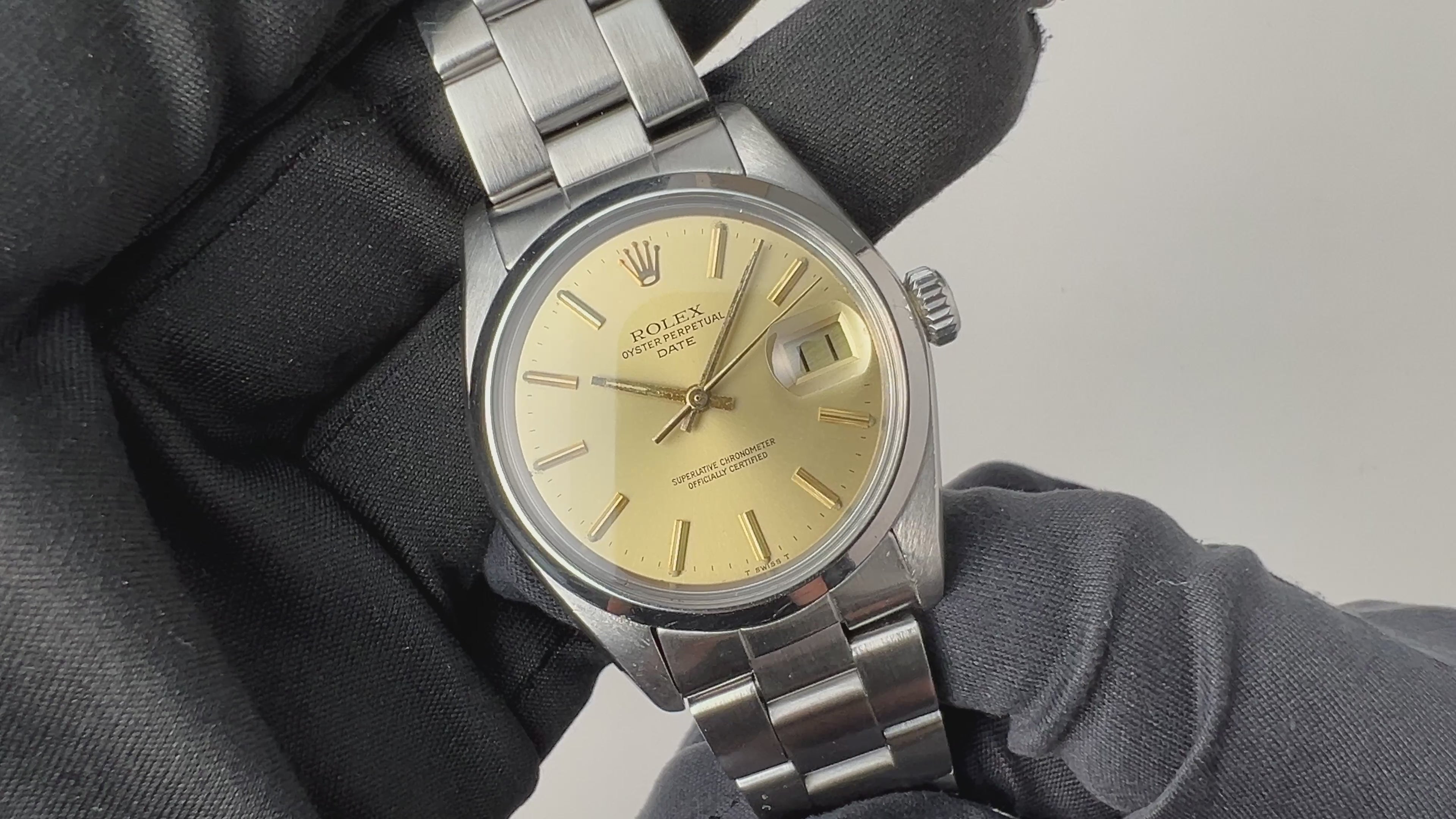 ロレックス 1977年製 オイスターパーペチュアルデイト Ref.1500 シャンパンダイヤルの入荷になります。意外と少ないシャンパンダイヤルでインデックスや針も金色です。文字盤は夜光の変色が見られますが、シミ等無く綺麗です。ケースは小傷が見られますが大きなダメージはありません。手巻きや針回しの操作はスムースです。ブレスは純正のハードブレスが取り付けられています。こちらの時計は分解掃除済みです。