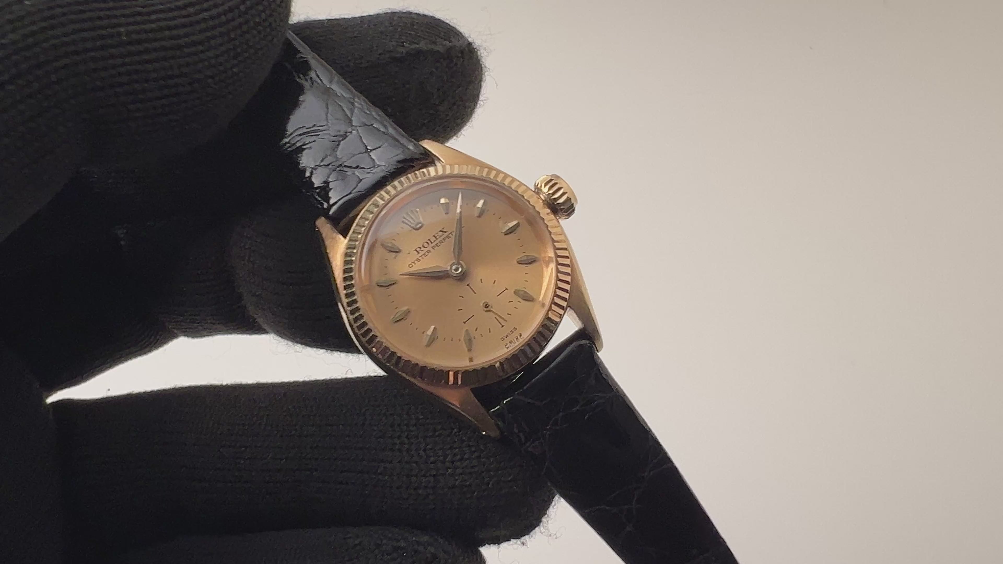 ロレックス レディース 18金無垢イエローゴールド オイスターパーペチュアル 1950年代製 Ref.6509です。18金無垢ケースにフルーテッドベゼルが取付られた特別感のある1本になっています。アルファハンドもヴィンテージ感があります。文字盤は表面に荒れが見られますが良い雰囲気になっています。ケースは小傷が見られますが大きなダメージはありません。手巻きや針回しの操作はスムースです。革ベルトは社外のカーフが取り付けられています。
