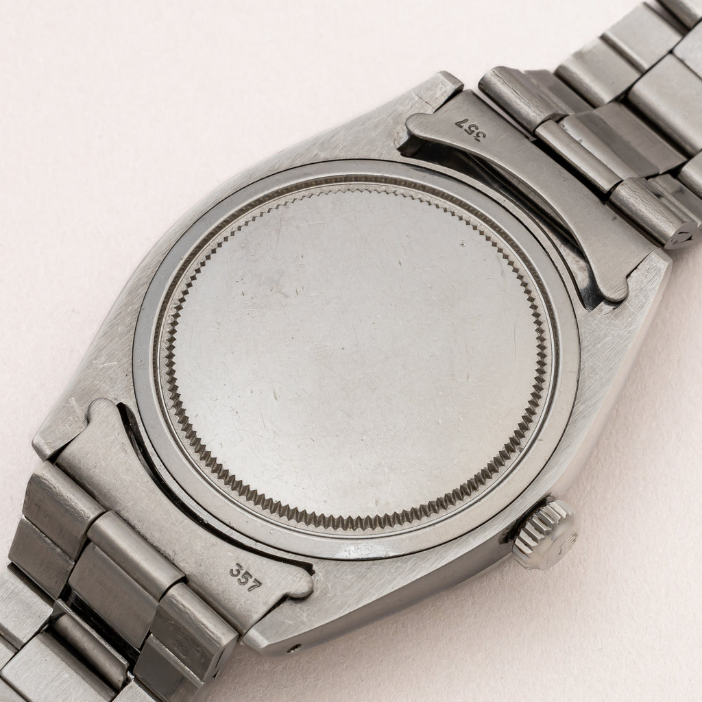 1966年製のロレックスオイスターデイトRef.6694です。しっかりと艶を残したブラックミラーダイヤルが抜群の雰囲気の1本です。スッキリしたスムースベゼルに人気のオリジナルブラックミラーダイヤルとゴールド針の上品な組み合わせです。文字盤はインデックスの周辺に劣化が見られますが、大きなダメージはありません。ケースは小キズが見られますが大きなダメージ無く良い状態です。リューズのねじ込み、手巻きや針回しの操作はスムースです。ベルトは純正の巻きブレス(7835/FF357)が取り付けられています。