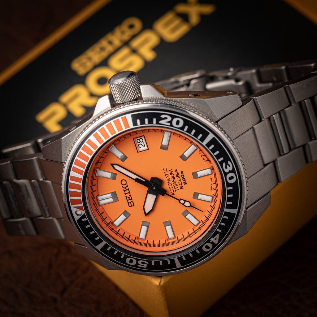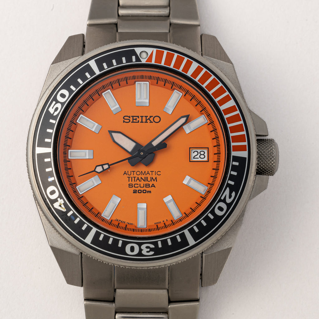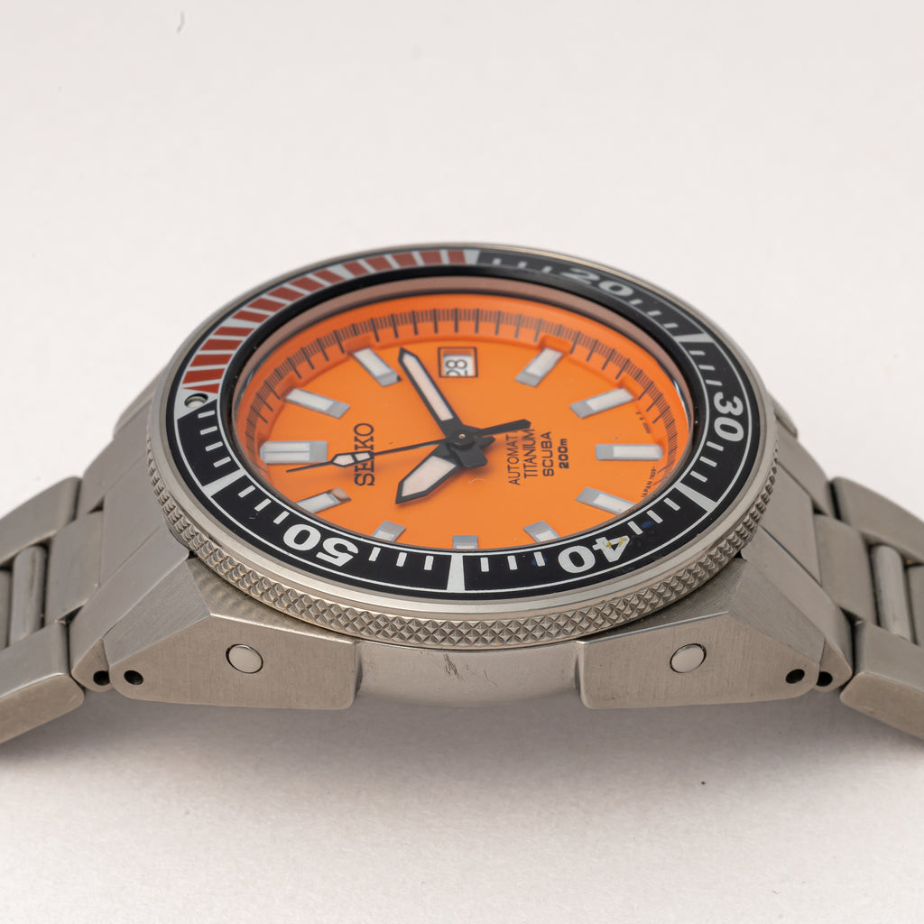 2004年に製造された200mダイバーモデルが入荷しました。 オレンジサムライの愛称で呼ばれるモデルで、チタン製のケースとブレスレットは迫力のある見た目に反して軽い装着感です。ダメージはなく、ケースも良好な検討です。 動きは7S25Aを搭載し、巻き上げと針回しともにスムーズです。 ブレスは純正のチタンブレスは取り付けられています。