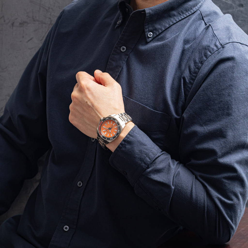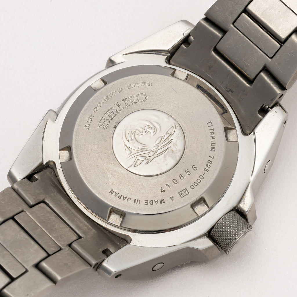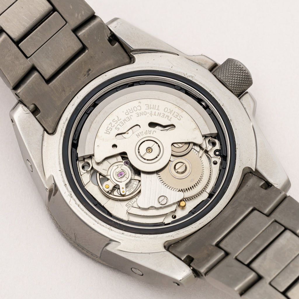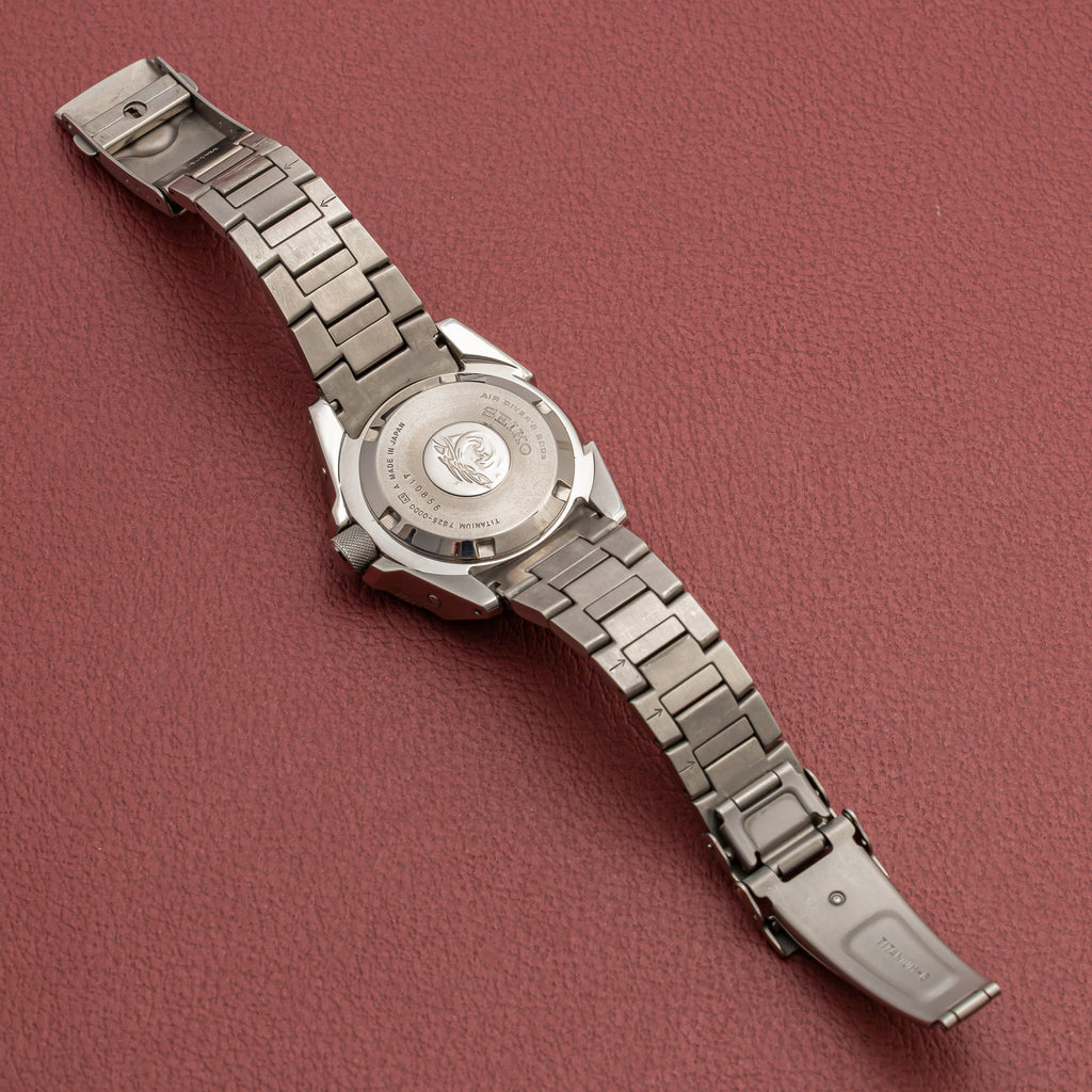 2004年に製造された200mダイバーモデルが入荷しました。 オレンジサムライの愛称で呼ばれるモデルで、チタン製のケースとブレスレットは迫力のある見た目に反して軽い装着感です。ダメージはなく、ケースも良好な検討です。 動きは7S25Aを搭載し、巻き上げと針回しともにスムーズです。 ブレスは純正のチタンブレスは取り付けられています。
