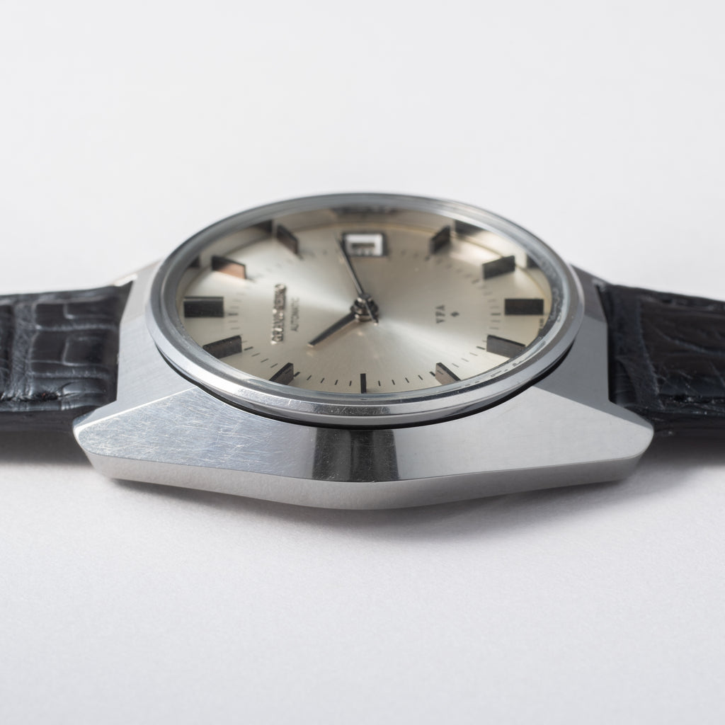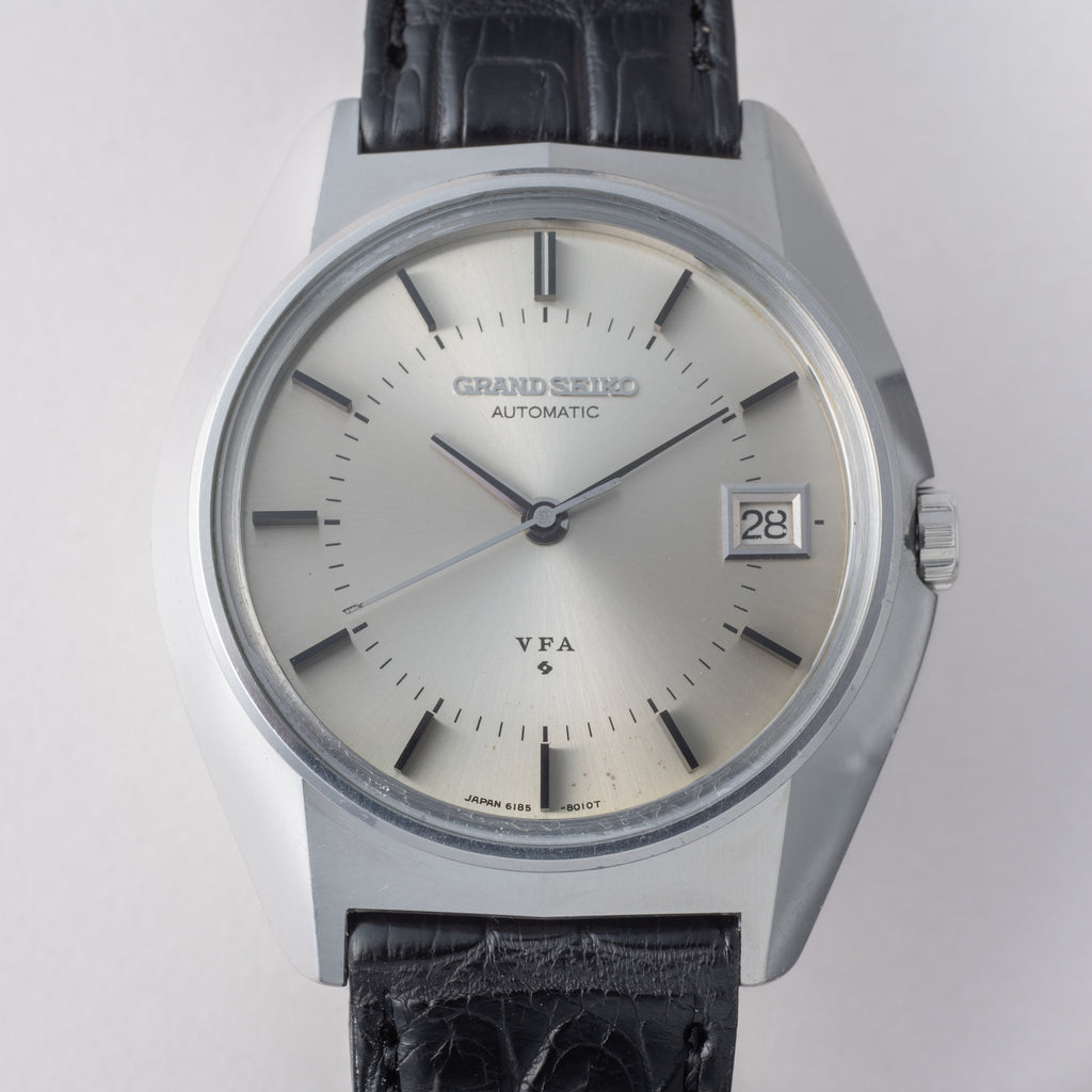 グランドセイコー V.F.A 1971年製 Ref.6185-8021-G 10振動自動巻きです。諏訪セイコーから製造された当時月差±1分以内という超高精度の調整が施された特別調整品(Very Fine Adjusted)です。ムーブメントは10振動(36000振動)で自動巻きのCal.6185Bを搭載。ケース、文字盤のコンディションも良く大きなダメージはございません。手巻きや針回しの操作はスムースです。ベルトはファイアーキッズオリジナルのクロコダイルが取り付けられています。こちらはオーバーホール済みです。