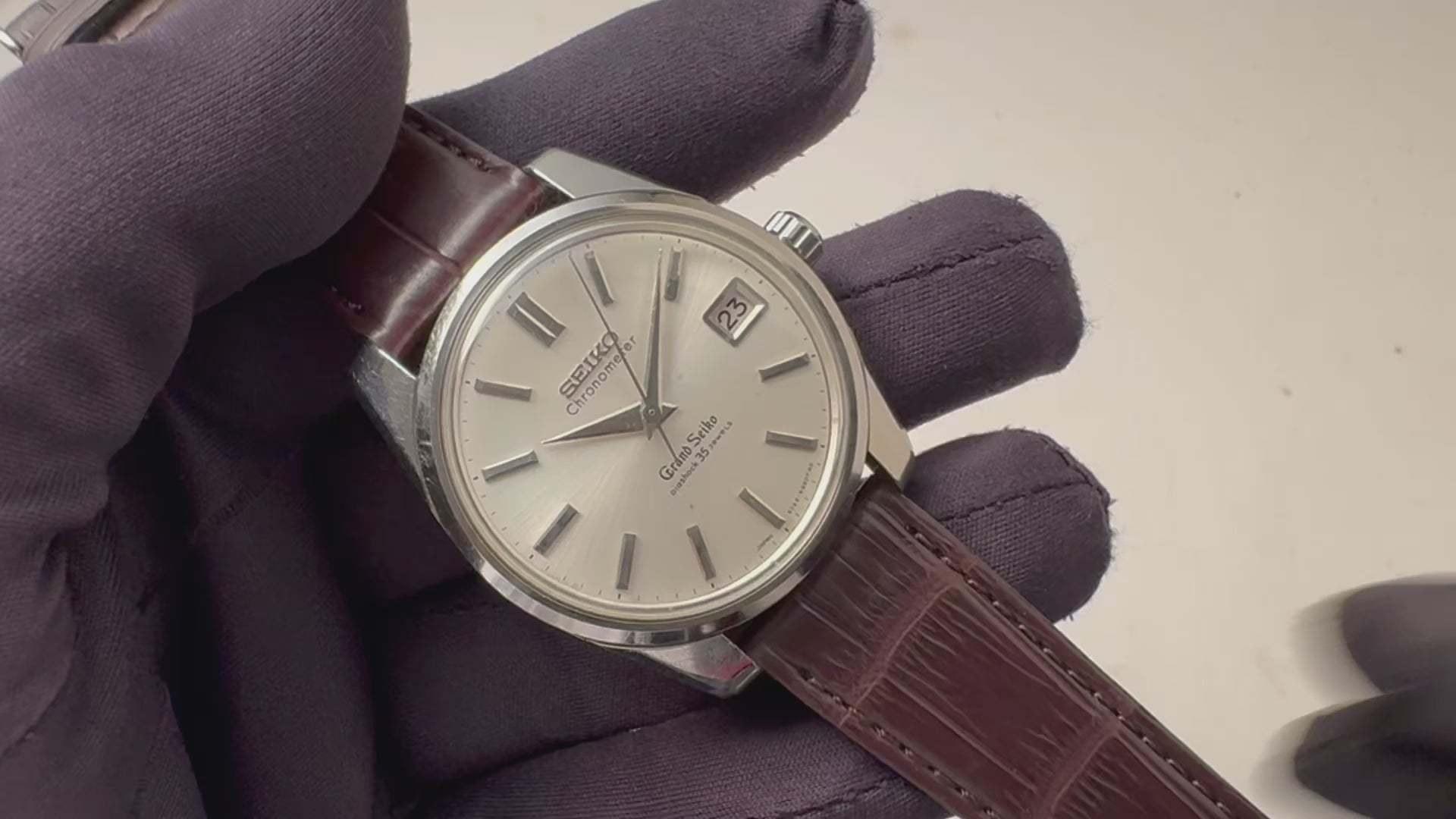 1965年製 グランドセイコーの2ndモデルセルフデーター前期 クロノメーター表記になります。1stモデルと比較して日付表示付き、スクリューバックケースと実用性に長けた作りになっています。ムーブメントは手巻き35石のCal.5722Bを搭載。ケースは小傷はございますが大きなダメージはございません、裏ブタのライオンメダリオンも健在です。手巻きや針回しの操作はスムーズです。ベルトはファイアーキッズオリジナルのクロコダイルを合わせています。こちらはOH済みです。