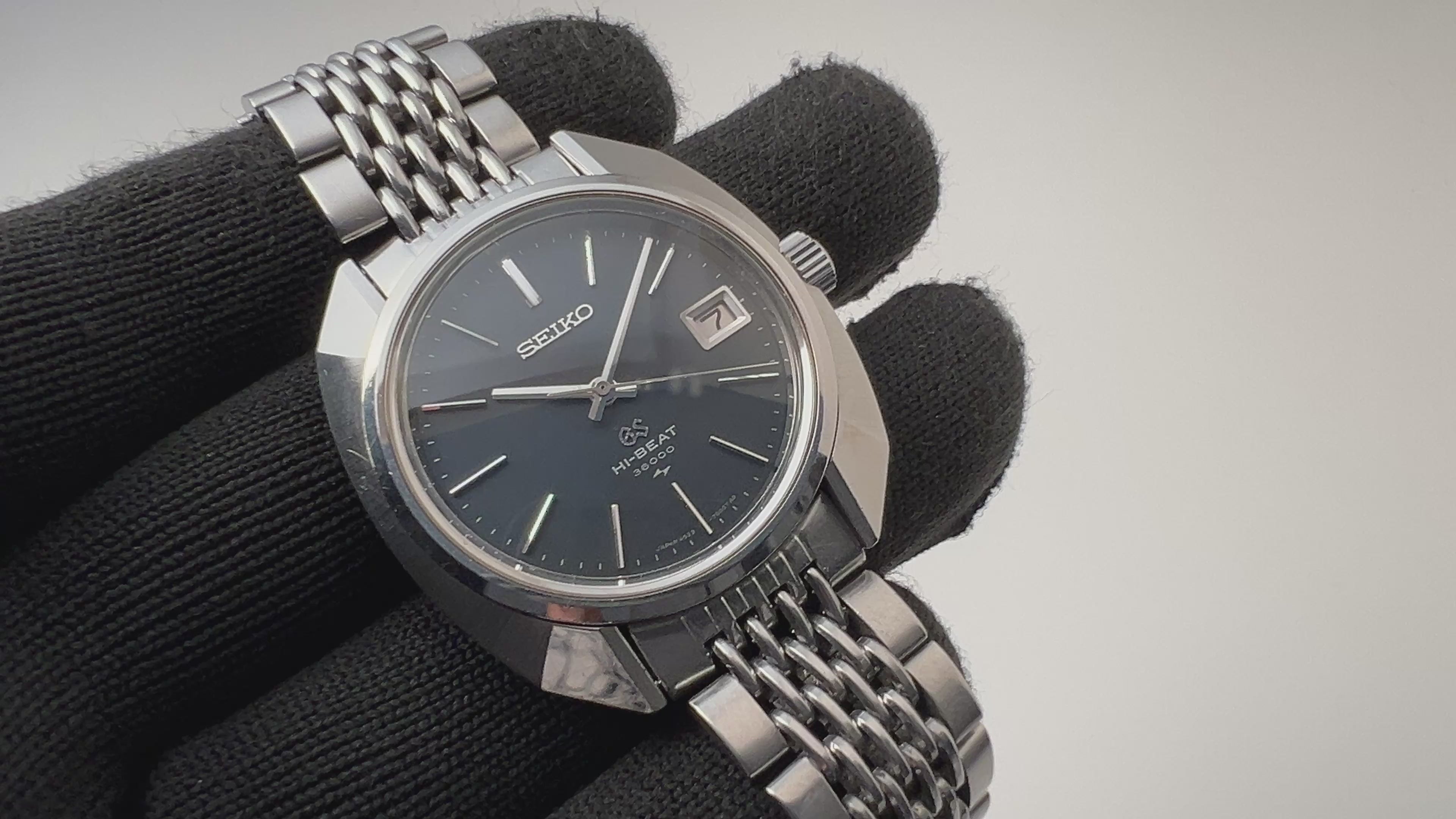 1969年製の45グランドセイコー手巻き10振動モデルです。グランドセイコーでは珍しいオクタゴンケースを採用。それまで海外の高級時計を意識したデザインから独自デザインに変わった年代でセイコーの技術がスイス製に負けていないという自信がデザインにも現れている感じがします。文字盤カラーはネイビーともグレーとも見え、角度や光の当たり方によって様々な表情を見せてくれます。ムーブメントは手巻き36000振動の4522Aを搭載、カレンダーの早送り付きで実用性もございます。ケースは小傷はございますが大きなダメージはございません。裏ブタのメダリオンもしっかり残っています。手巻きや針回しの操作はスムースです。ベルトはSEIKOのステンレスブレスが取り付けてあります。