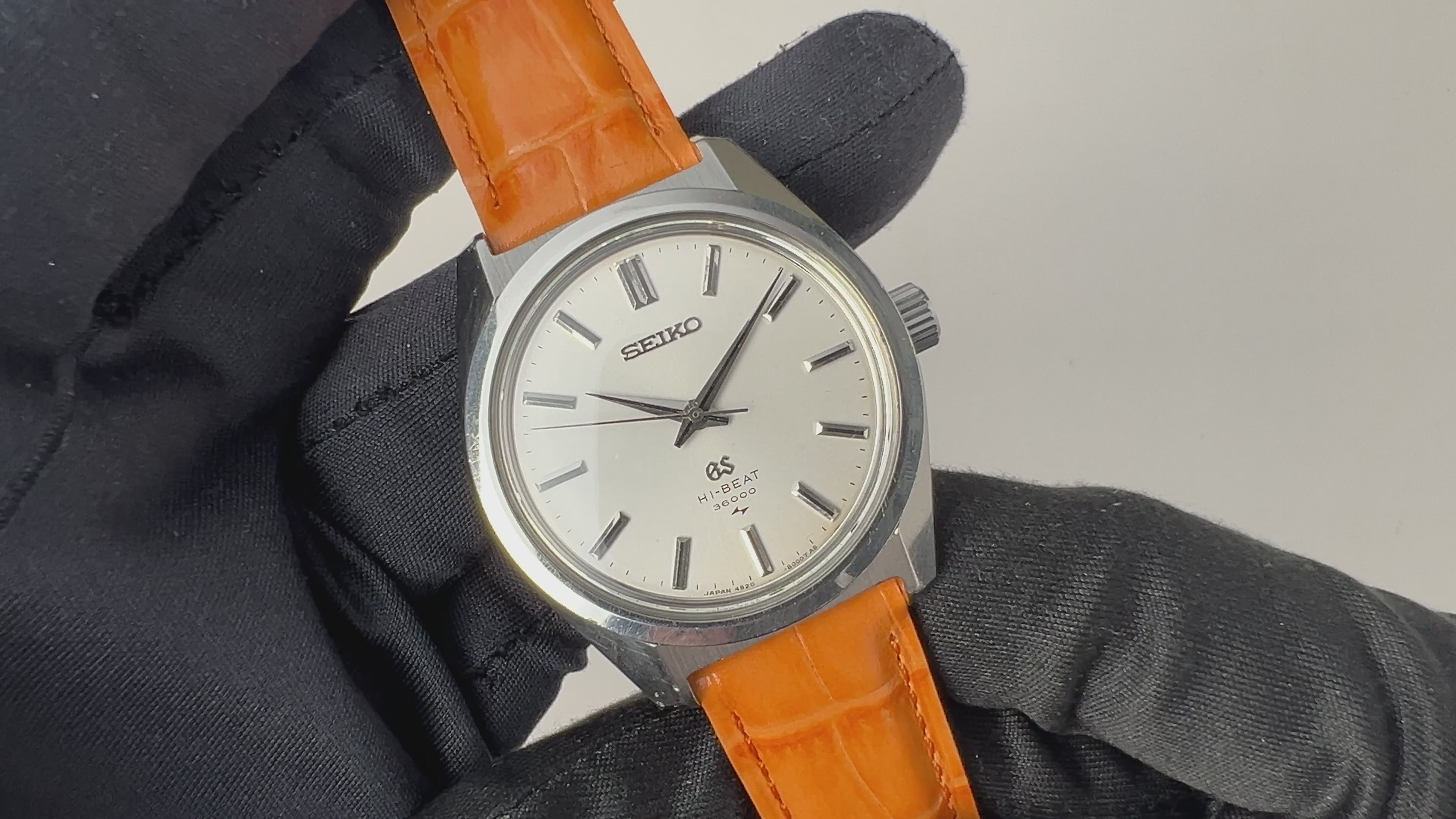 グランドセイコー ハイビート手巻き10振動 36000 1968年製 Ref.4520-8000 45GSです。グランドセイコーでセイコースタイルと呼ばれる独自デザインのケースも魅力的です。文字盤はシンプルなシルバーにバーインデックスの使いやすい組み合わせで、シミ等無く綺麗です。ムーブメントは手巻き36000振動の4520Aを搭載。ケースは小傷はございますが大きなダメージはございません。裏蓋のメダリオンもしっかり残っています。手巻きや針回しのファンクションは問題ありません。ベルトは社外のカーフが取り付けられています。こちらの時計は分解掃除済みです。