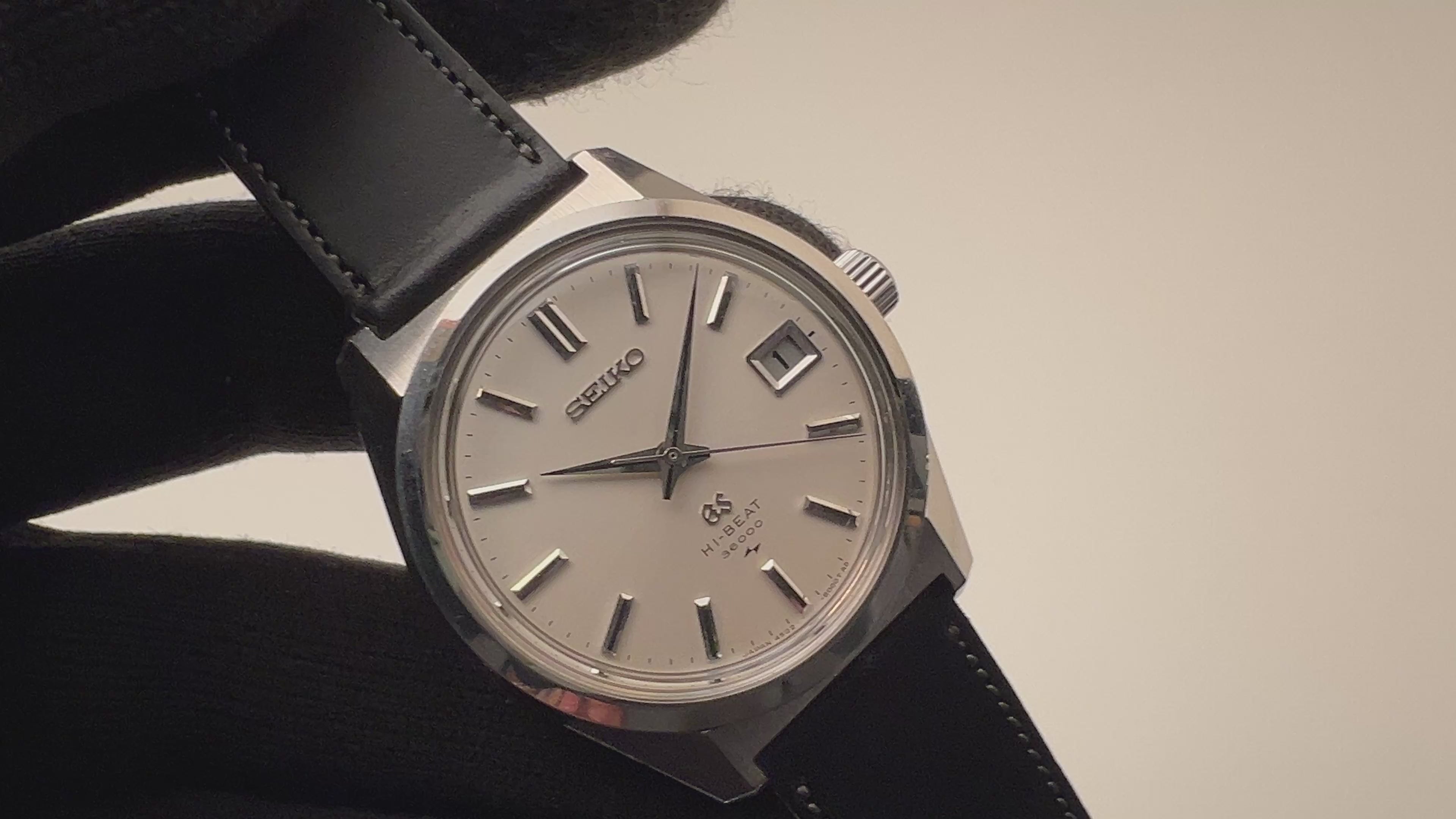グランドセイコー1969年製 10振動手巻き 45GS Ref.4522-8000 ハイビート セイコースタイルケースの入荷になります。グランドセイコーでセイコースタイルと呼ばれる独自デザインのケースも魅力的で、それまでの海外の高級時計を意識したデザインから独自デザインに変わり、セイコーの技術がスイス製に負けていないという自信がデザインにも現れている感じがします。文字盤は全体的には綺麗です。ムーブメントは手巻き10振動の4522Aを搭載、カレンダーの早送り付きで実用性もございます。ケースは裏蓋に工具を滑らせた跡がありますがその他目立つダメージはありません。ベルトはファイアーキッズオリジナルのイタリアンレザーのブッテーロ(裏面ラバー)を取り付けしています。こちらは分解掃除済みです。