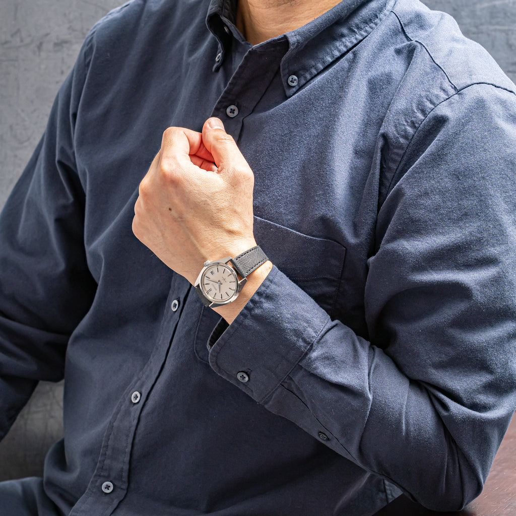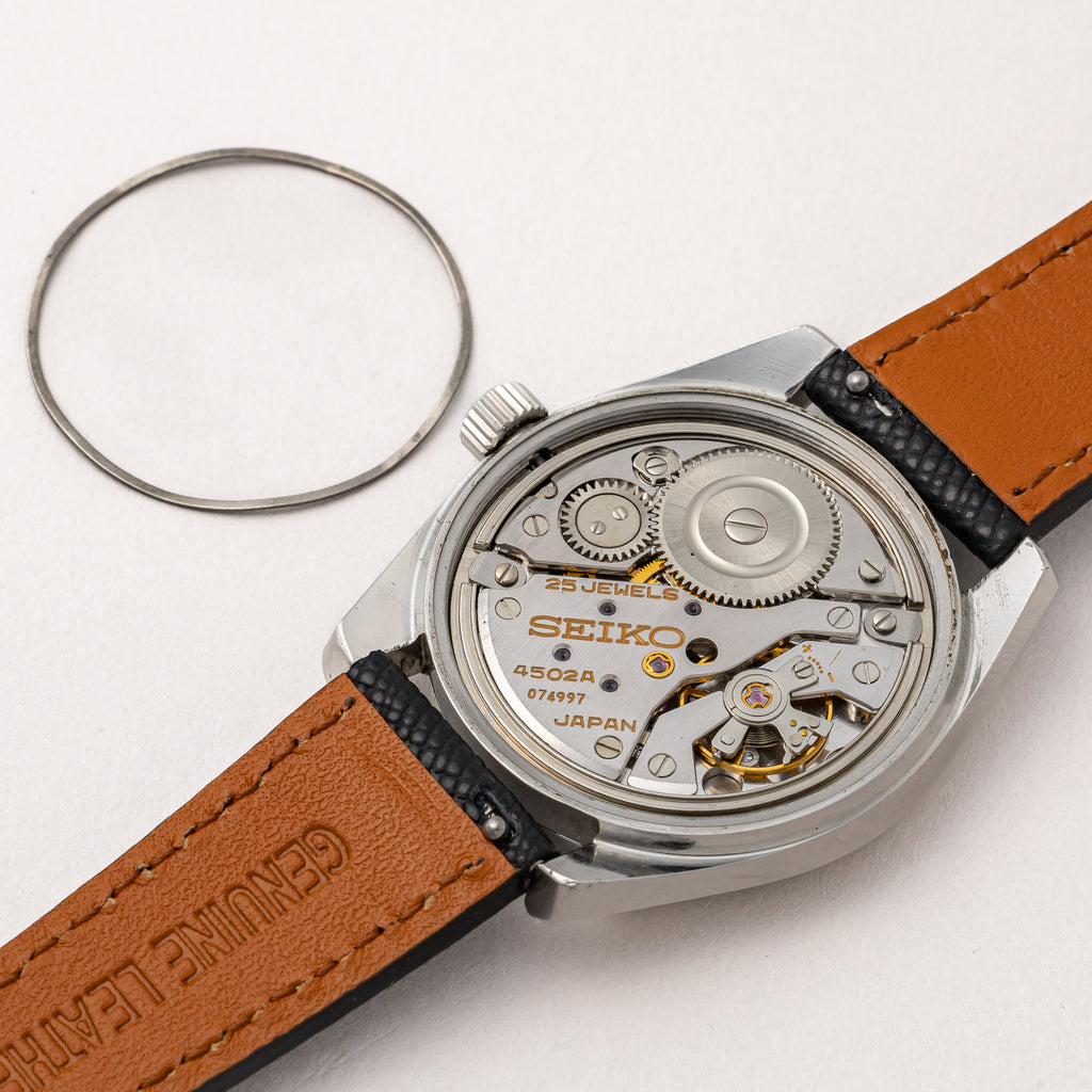 1969年製の45キングセイコー手巻きモデルです。亀戸第二精工舎製で、カレンダー付きのハイビートムーブメントと実用性と高精度を両立させたモデル。 .4502Aを搭載しています。文字盤は綺麗とは言えませんが程良く変色してヴィンテージ感があります。ケースは小傷はございますが大きなダメージはありません。裏ブタのメダリオンも健在です。や針回しの操作はスムースです。ベルトは社外の革ベルトを合わせています。