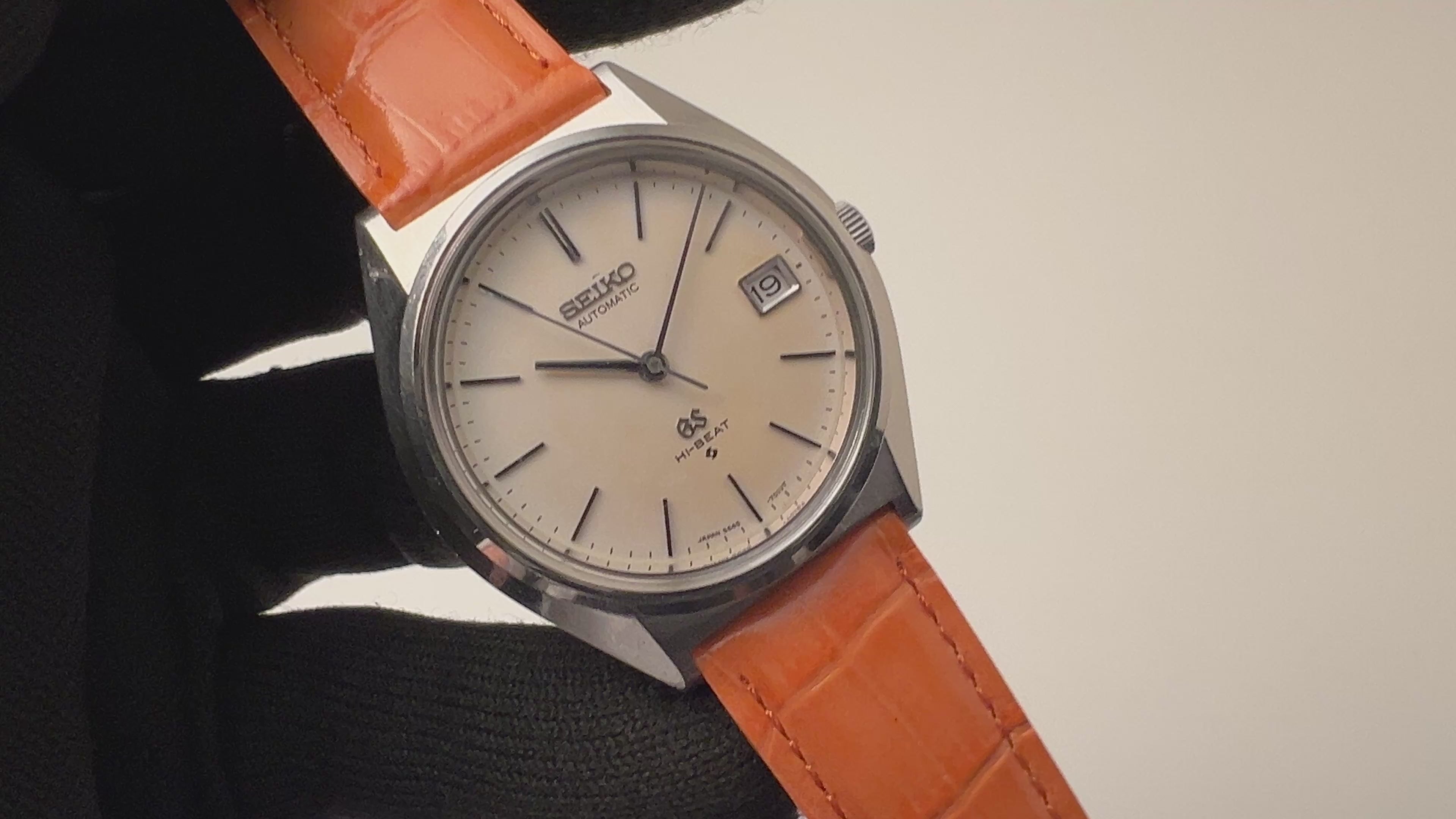 グランドセイコー 1970年製 Ref.5645-7010 パティーナダイヤル 56GS ハイビート自動巻きの入荷になります。自動巻きのハイビートムーブを搭載し、センターセコンドで3時位置にデイト付き、スクリューバック仕様と、視認性、防水性が高く実用性に優れたモデルです。裏蓋のメダリオンも腐食しているものが多い中、とても綺麗に残っています。ムーブメントはハイビート(8振動)、5姿勢調整添付のCal.5645Aを搭載。手巻きや針操作はスムースです。ベルトは社外の革ベルトが取り付けてあります。こちらの時計は分解掃除済みです。