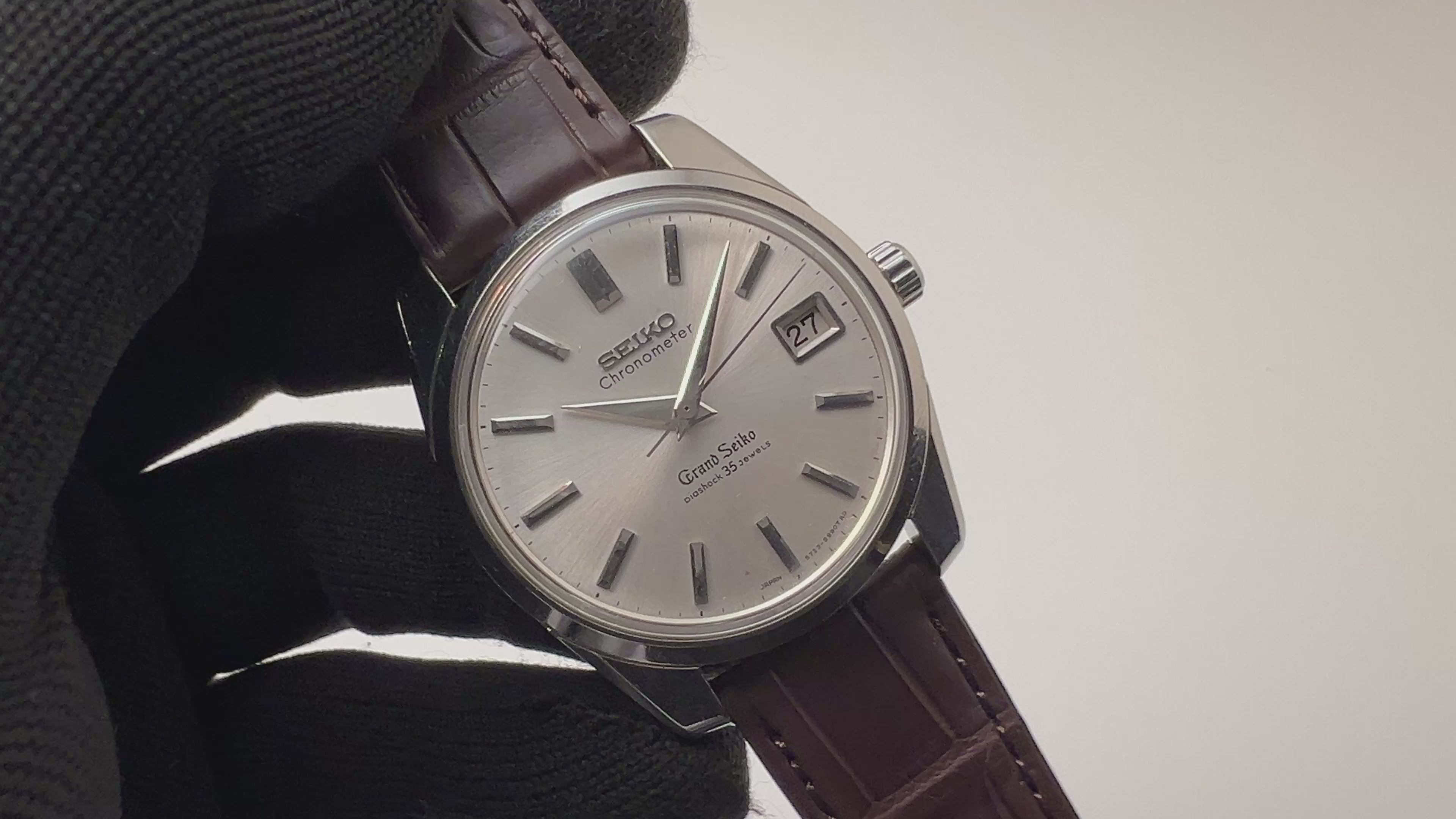 グランドセイコー セルフデーター 2nd前期 1965年製 Ref.5722-9990 57GS クロノメーター 獅子メダルです。1stモデルと比較して日付表示付き、スクリューバックケースと実用性に長けた作りになっています。ムーブメントは手巻きCal.5722Aを搭載。ケースは小傷はございますが大きなダメージはありません。裏ブタのライオンメダリオンも健在です。手巻きや針回しの操作はスムースです。ベルトはファイアーキッズオリジナルのクロコダイル革ベルトを合わせています。