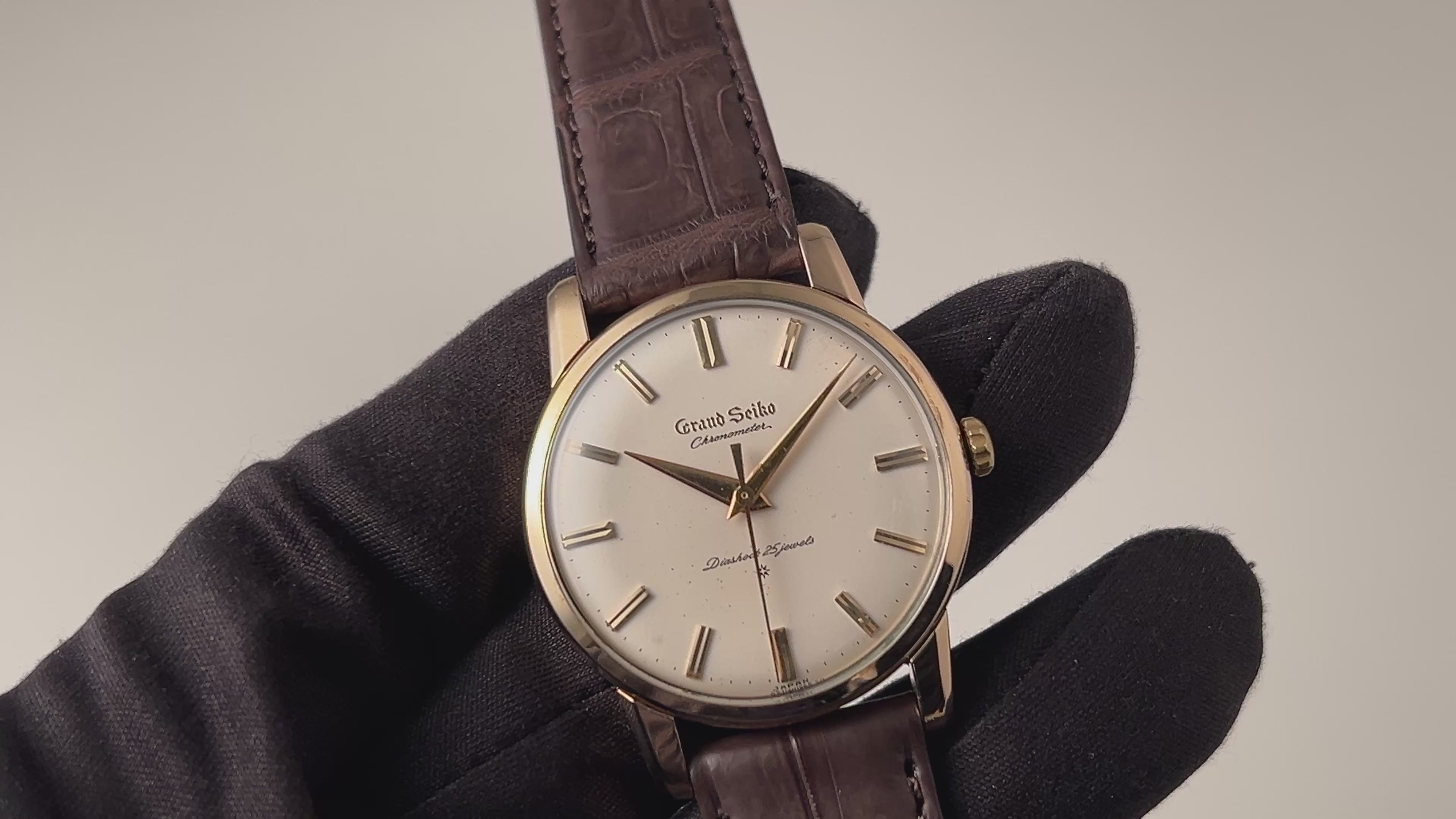 グランドセイコー ファーストモデル 1962年製 Ref.J14070E GS アップライトダイヤル メーカー修理明細付きの入荷になります。グランドセイコー1stモデルは、1960年から1963年の3年間だけ製造され、こちらの文字盤は、後期型で『GRAND SEIKO』の文字がアップライト仕様のものになります。ダイヤルは若干の経年変化はありますが、概ね綺麗なコンディションを維持しています。14金80ミクロンの金張りケースは、多少小傷はありますが雰囲気を損なう程ではありません。ライオンメダリオンはしっかり残っています。リューズのメッキは剥がれていますがオリジナルです。手巻きや針回しファンクションは問題ありません。ベルトはファイアーキッズオリジナル、クロコダイル革ベルトが取り付けられています。2020年にメーカーでコンプリートサービスを受けた際の完了報告書が付いています。こちらの時計は分解掃除済みです。